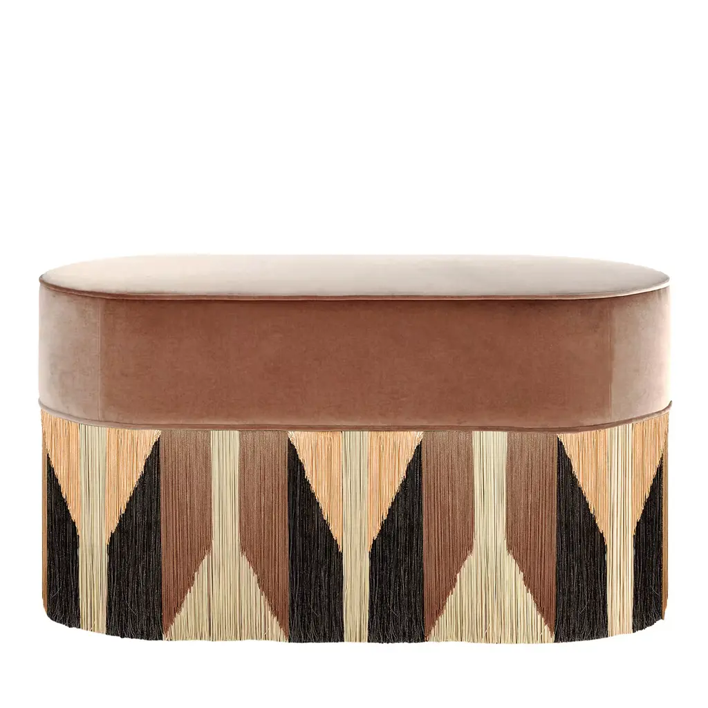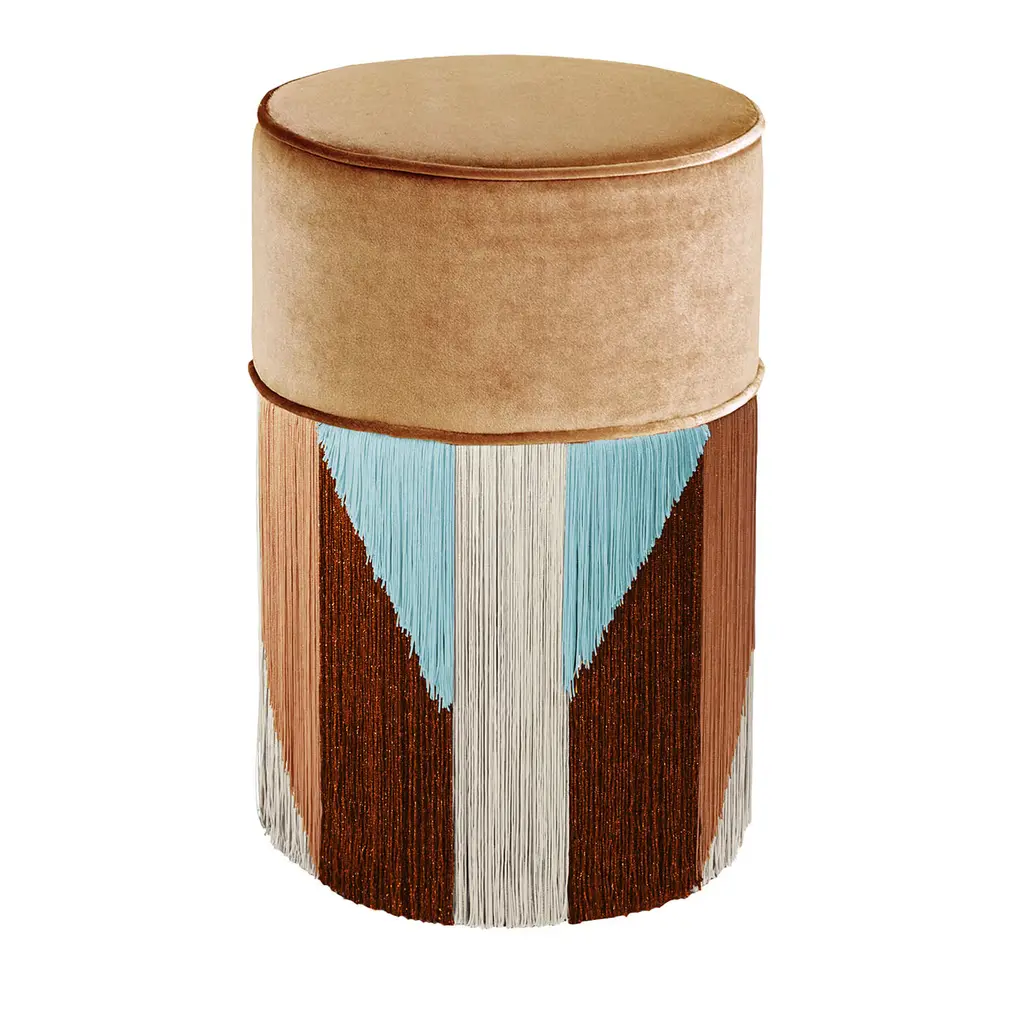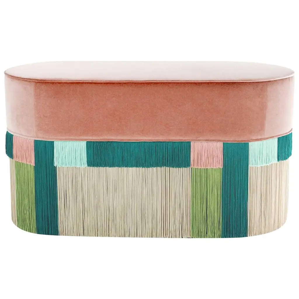 La vie en rose. Create a cozy corner with a rose-colored pouf, upholstered in velvet 100% Trevira and accented with viscose fringe. On a painted beechwood base, the pouf hides away its sturdy foundation with soft fabrics to create a relaxing atmosphere, perfect for a lounge area. Additional colors, shapes and sizes available in the Couture Geometric Collection. Each bespoke piece is stamped on the bottom of the pouf’s lining and personally signed, numbered, and dated by designer.