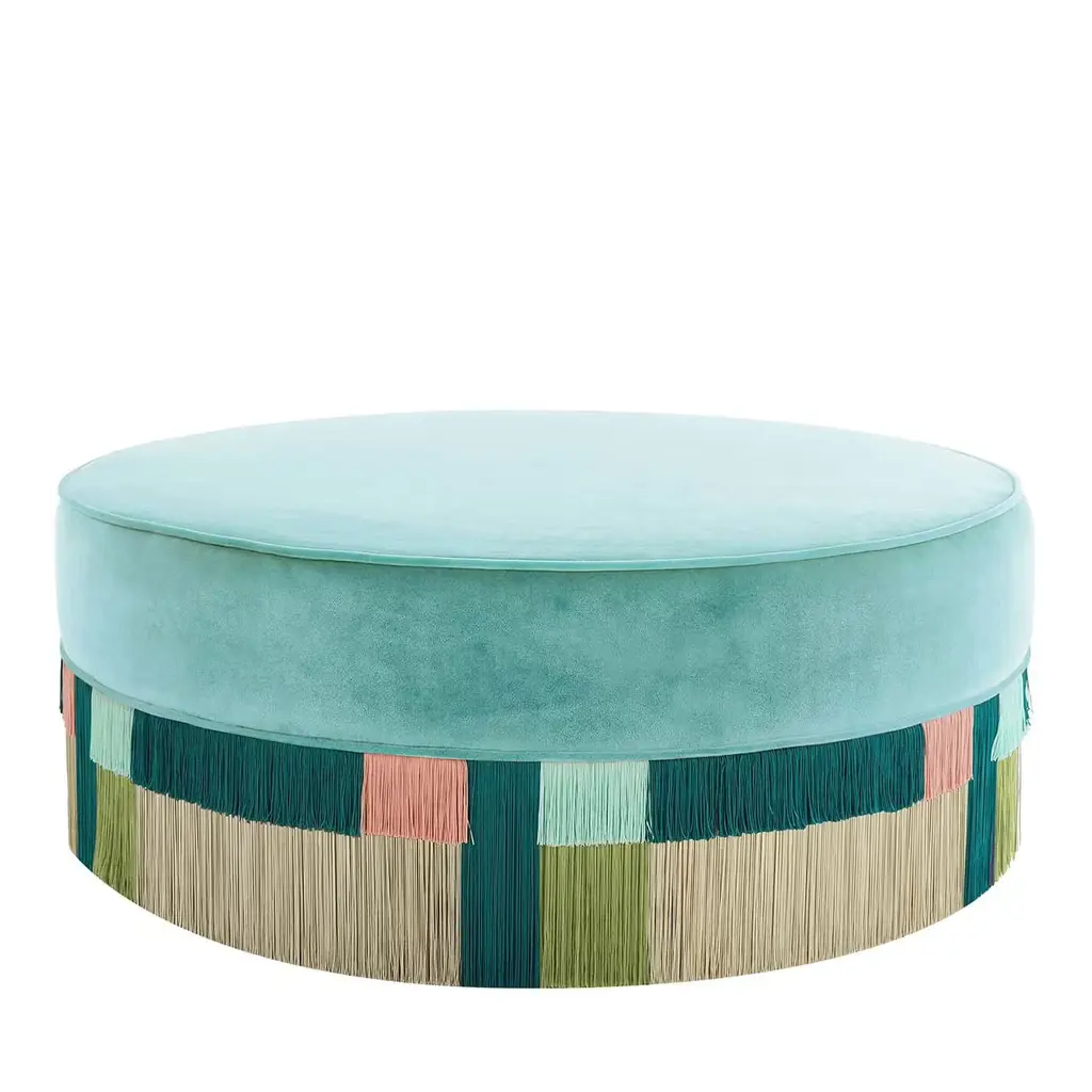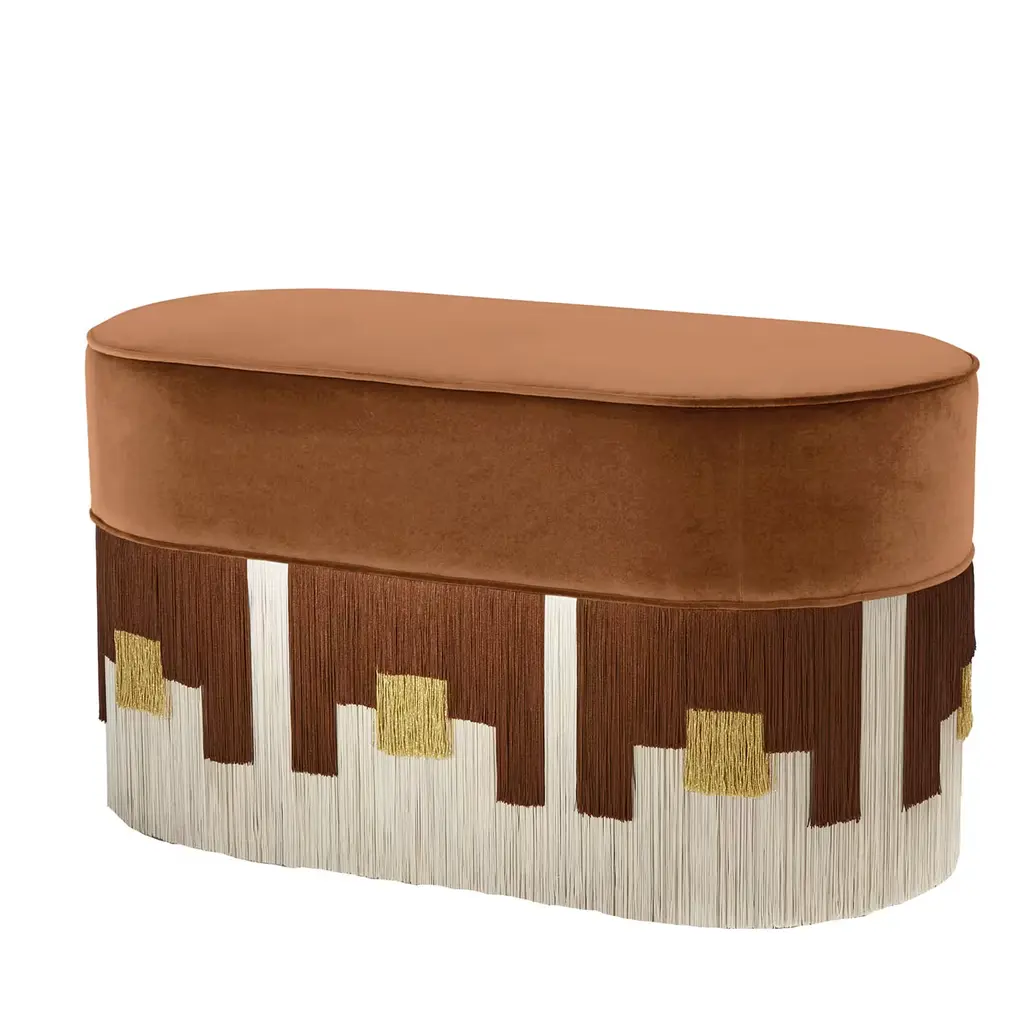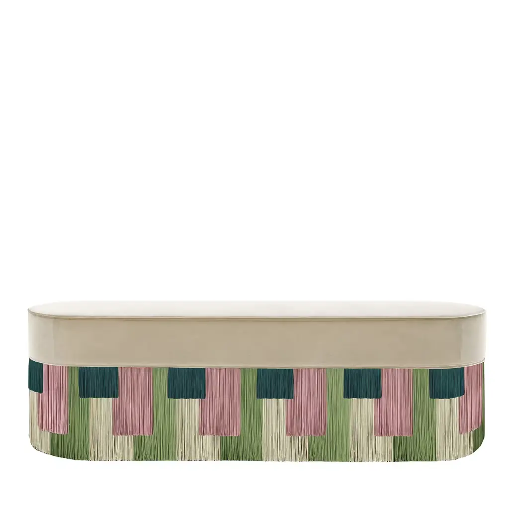 La vie en rose. Create a cozy corner with a rose-colored pouf, upholstered in velvet 100% Trevira and accented with viscose fringe. On a painted beechwood base, the pouf hides away its sturdy foundation with soft fabrics to create a relaxing atmosphere, perfect for a lounge area. Additional colors, shapes and sizes available in the Couture Geometric Collection. Each bespoke piece is stamped on the bottom of the pouf’s lining and personally signed, numbered, and dated by designer.