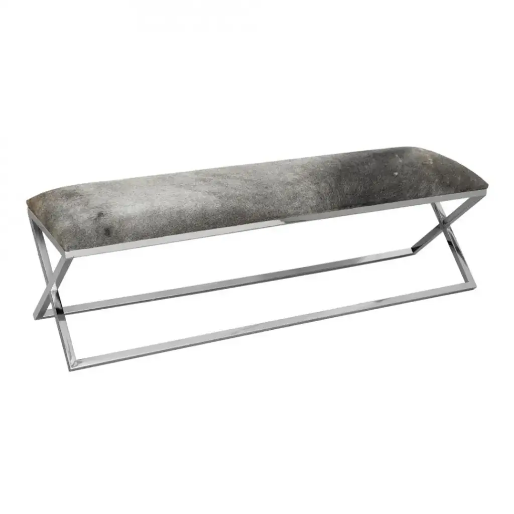 Glam by design, the Rossi Bench brings a luxurious statement to your space. With a solid stainless steel frame and cow hide upholstery, it is a great addition to your glam entry or living space.