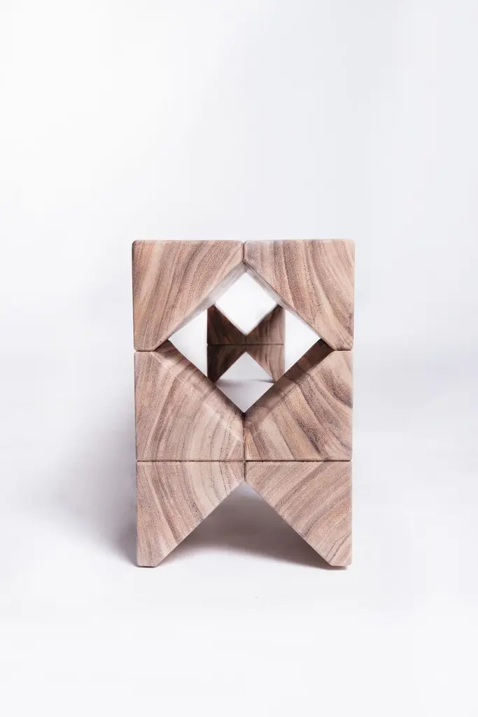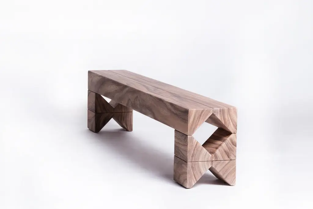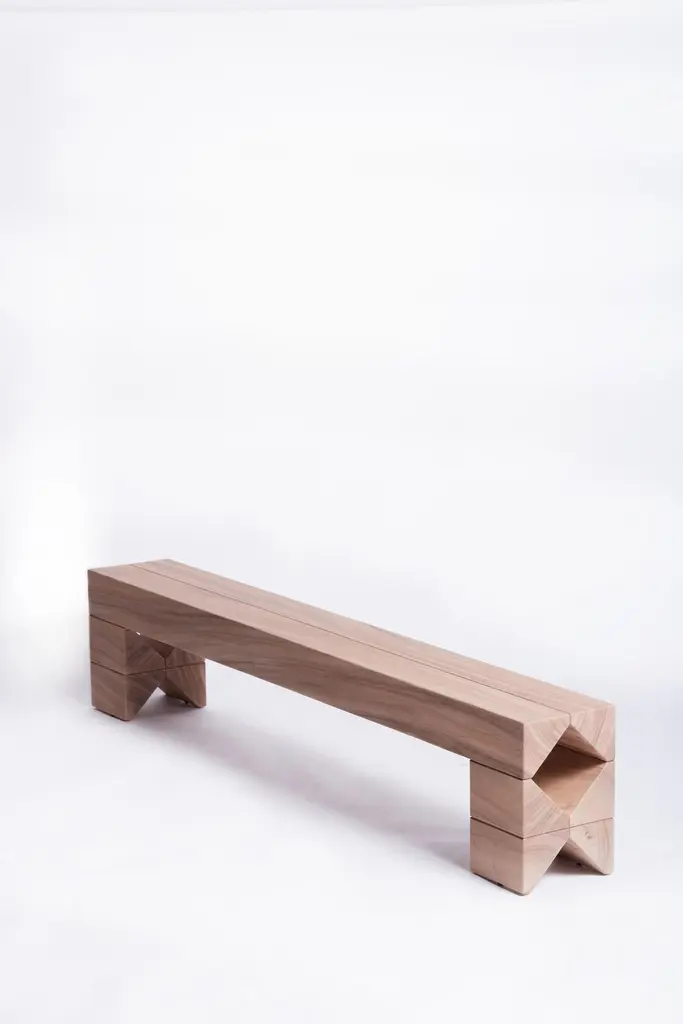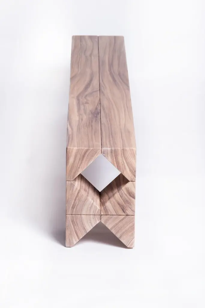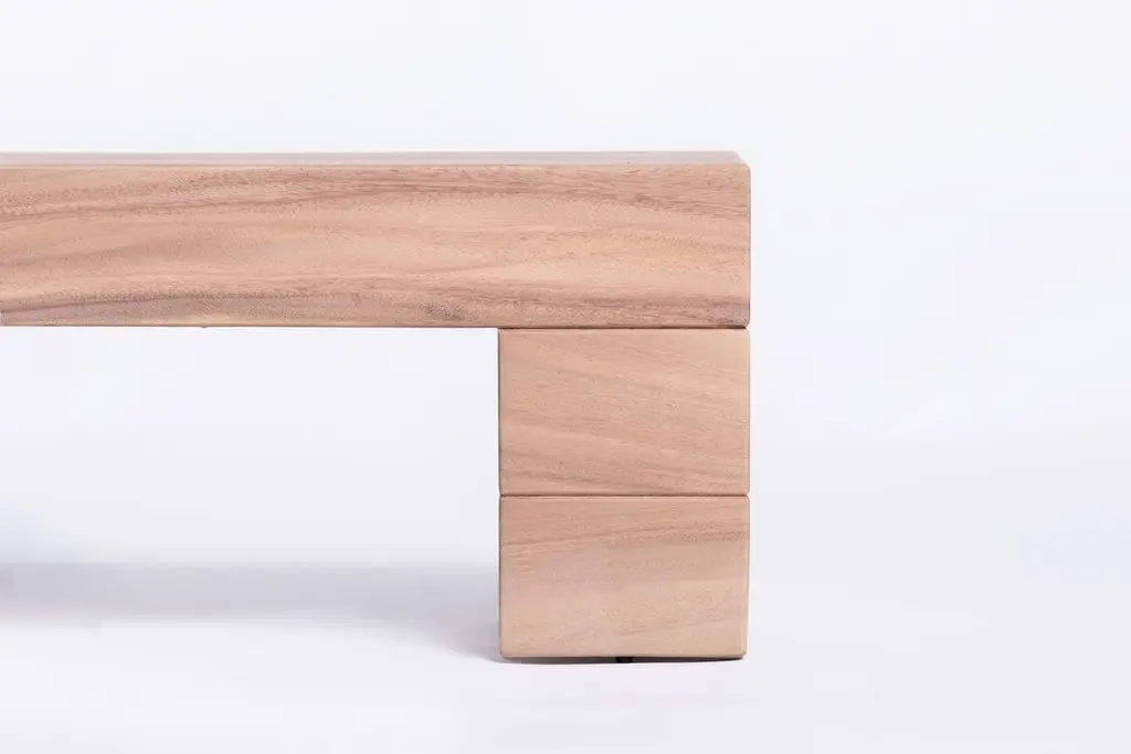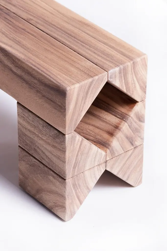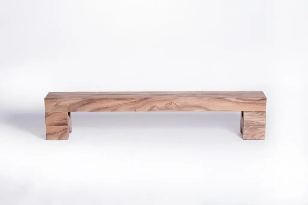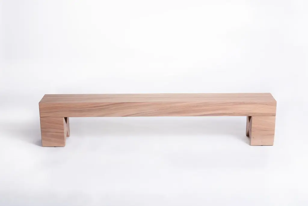 Like a skillful trained sushi chef filleting a fish, Salmon is built from one long log cut into 2 big pieces for the seat and 8 small pieces for the legs. The symmetrical and simple shape maintains the essence and beauty of the raw materials. The humblest way a craftsman shows his respect to materiality. Measure: Length 2.0 m.