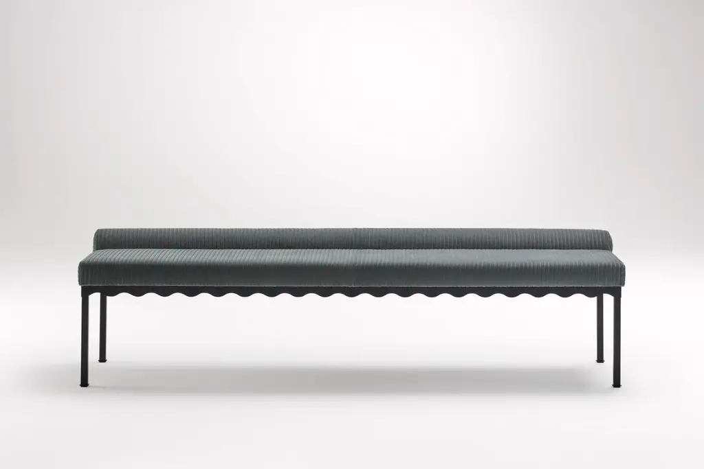 Sanguine Bellini 2040 Bench by Coco FlipDimensions: D 204 x W 54 x H 52.5 cmMaterials: Timber / Upholstered tops, Powder-coated steel frame. Weight: 30kgFrame Finishes: Textura Black.Coco Flip is a Melbourne based furniture and lighting design studio, run by us, Kate Stokes and Haslett Grounds. We work closely with local craftspeople and manufacturers to create playful products with depth of character.Coco Flip produces character-rich furniture and lighting, in Naarm (Melbourne), for design conscious homes worldwide.Founded in 2010 by Kate Stokes and Haslett Grounds, the studio is inspired by ideas, relationships and materiality. Their designs imbue commercial and residential spaces with personality and warmth. Each distinctive piece is manufactured locally by a collective of skilled craftspeople.Coco Flip is proud to be part of a community that values quality Australian design.