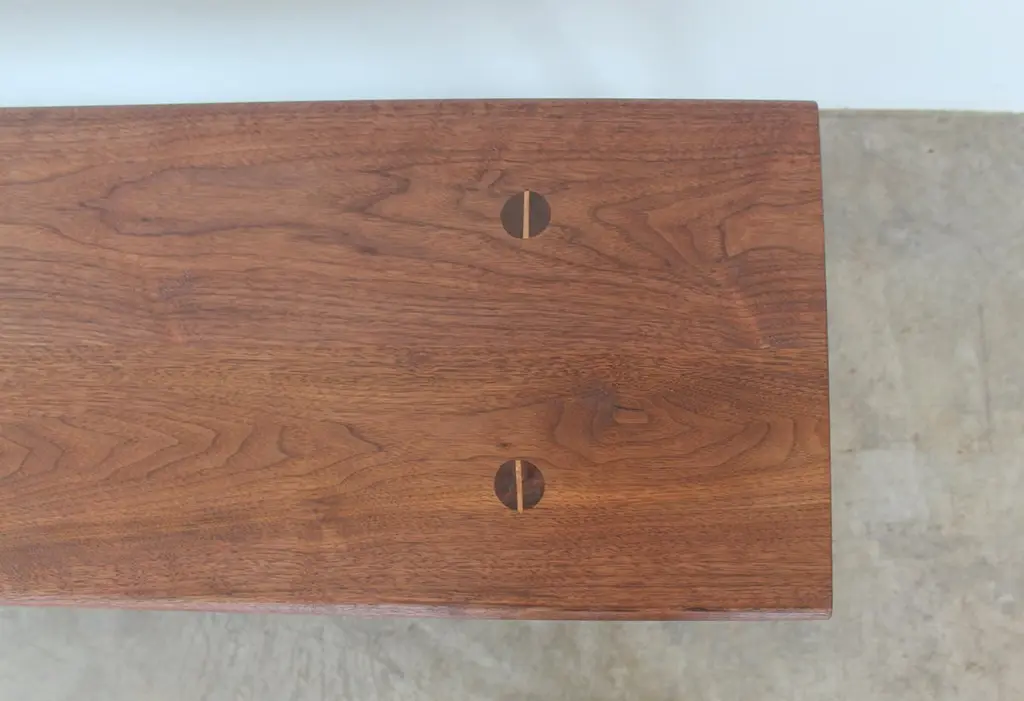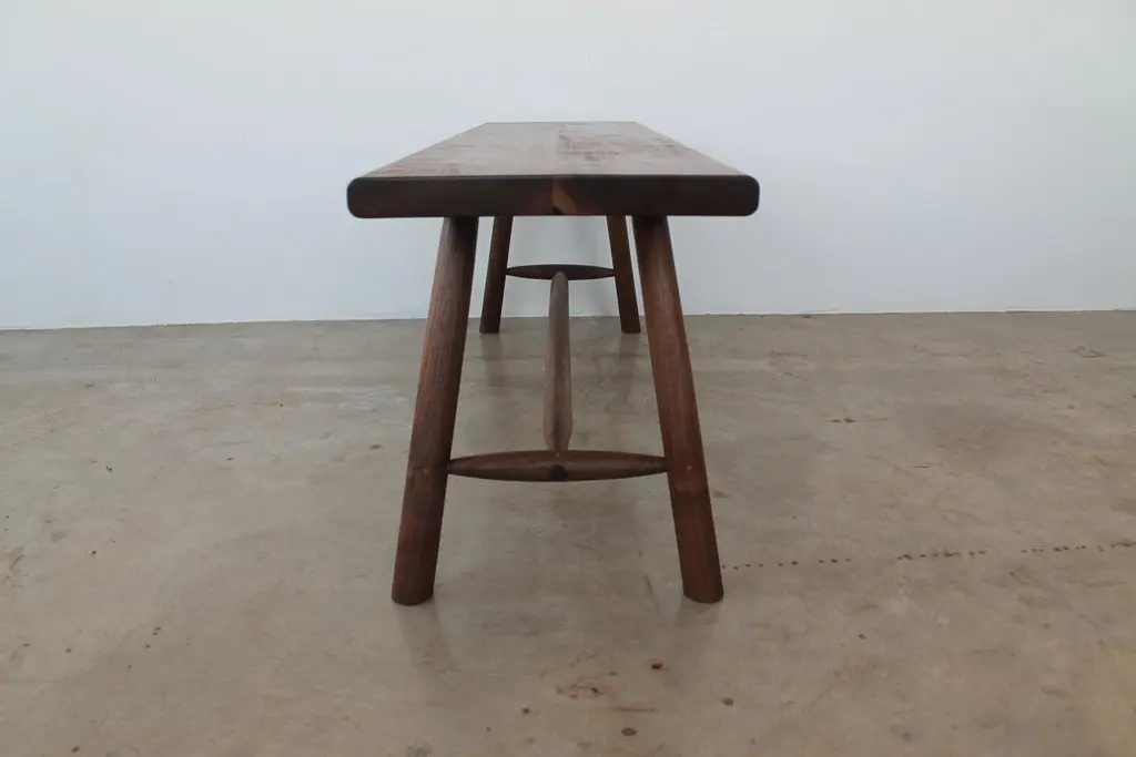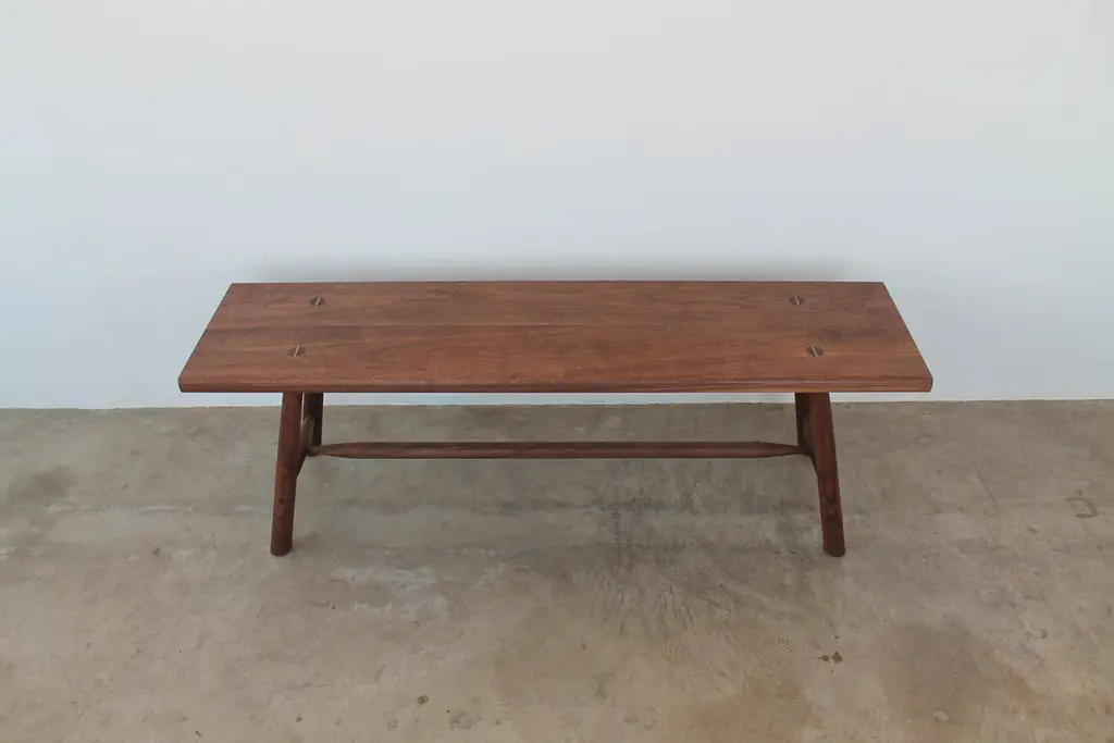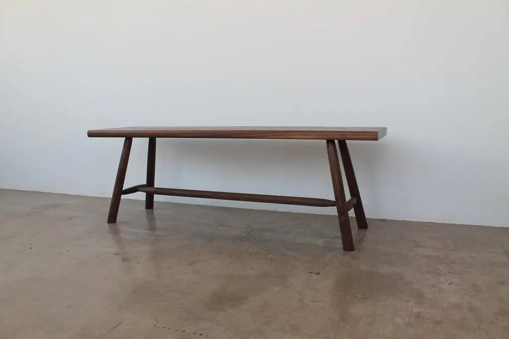 The Santa Rosa bench is a simple piece of seating for the well appointed interior. Its clean lines, hand turned base, and wedged through tenons amount to a design that is at home in both modern and classic settings. We begin each bench with hand picked walnut boards that are milled on our well tuned machines. Each plank is chosen for minimal defects and straightness of grain. Once roughed out, every part is shaped with time honored hand tools and left with the tooling marks; rarely is sand paper used in our shop. Our work is finished with natural oils and waxes for a toxin free piece of heirloom furniture.