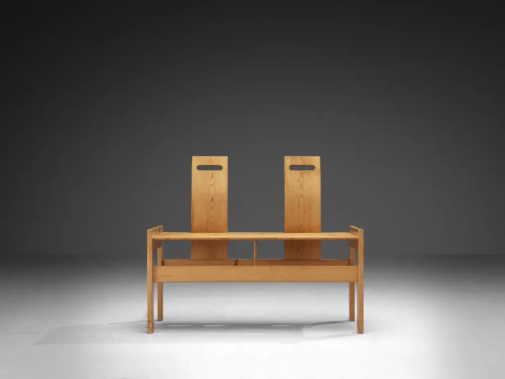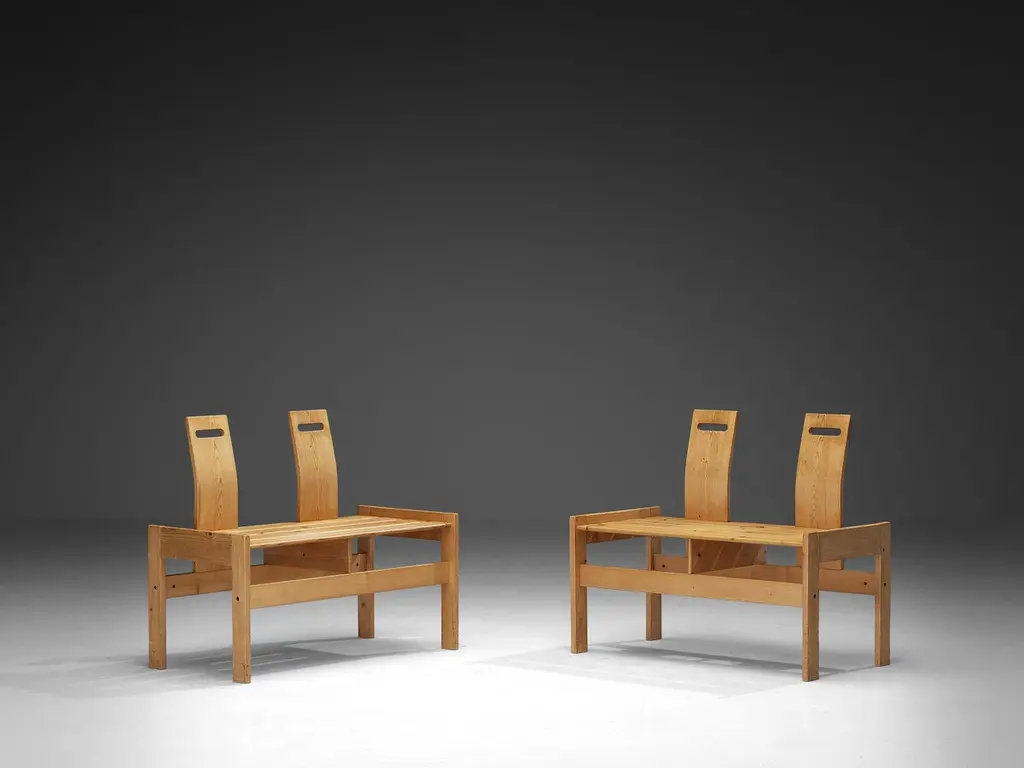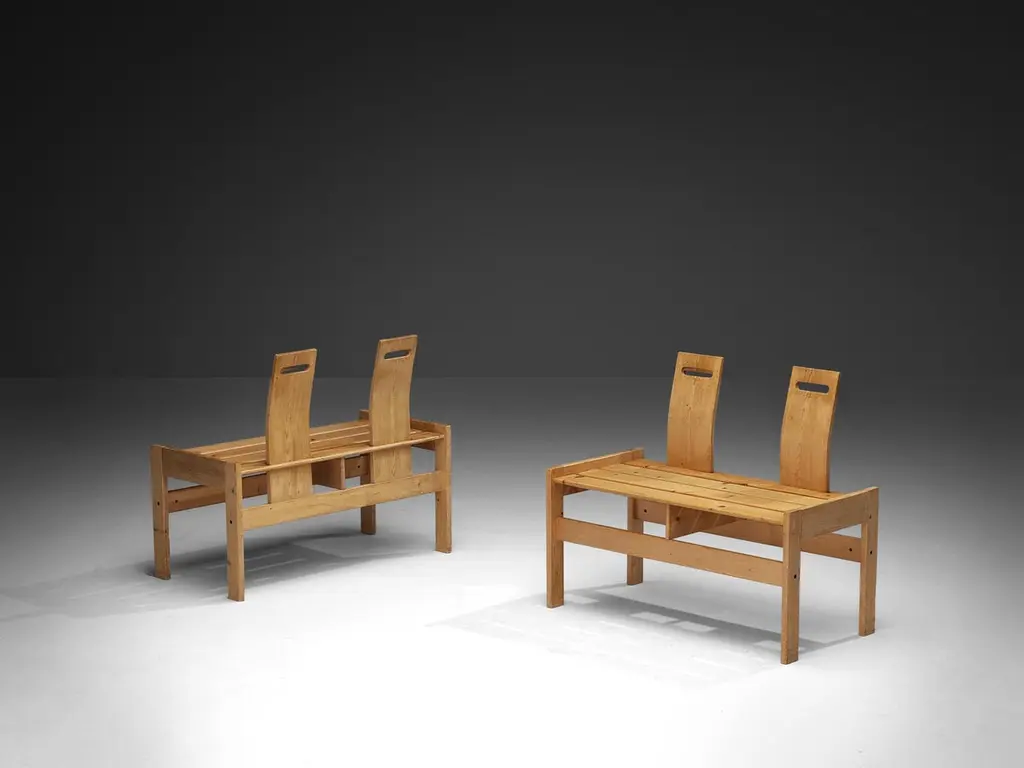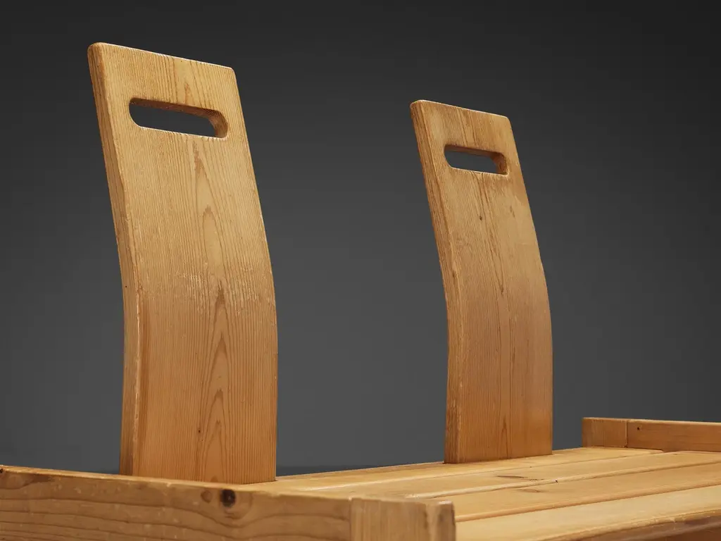 Benches, solid pine, Europe, 1980sThese benches revolve around a straightforward construction made entirely from pinewood. The small bench features a straight, sturdy frame with square legs. The seat is composed of several flat wooden slats laid horizontally, giving it a slightly slatted appearance. The backrest is a pair of solid pieces of pine wood, slightly curved for comfort. It has a rectangular cutout near the top, intended as a handle for easy movement. This bench has a rustic, handcrafted appearance with an emphasize on simplicity, functionality, and natural materials, making it suitable for both a modern and country-style interior. Kindly note that the benches are in good, used condition with signs of age and use, including scratches. For further details, we encourage you to reach out to our team of design specialists. The price listed is per bench.