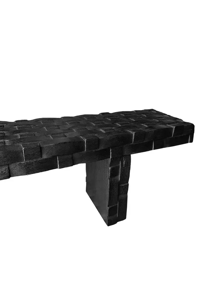 A sculptural hand-carved mango wood bench. To achieve is rich black pigment the bench was burnt three times and then finished with a clear coat. The mix of curved and straight lines along with a myriad of textures make for a very elegant bench. Unique to this bench is the hand carved detailing present on the seat. This carved detailing is meant to resemble woven rattan. A wonderful addition to any space.