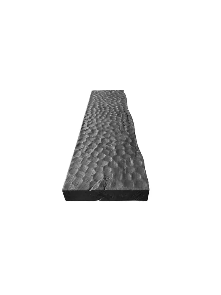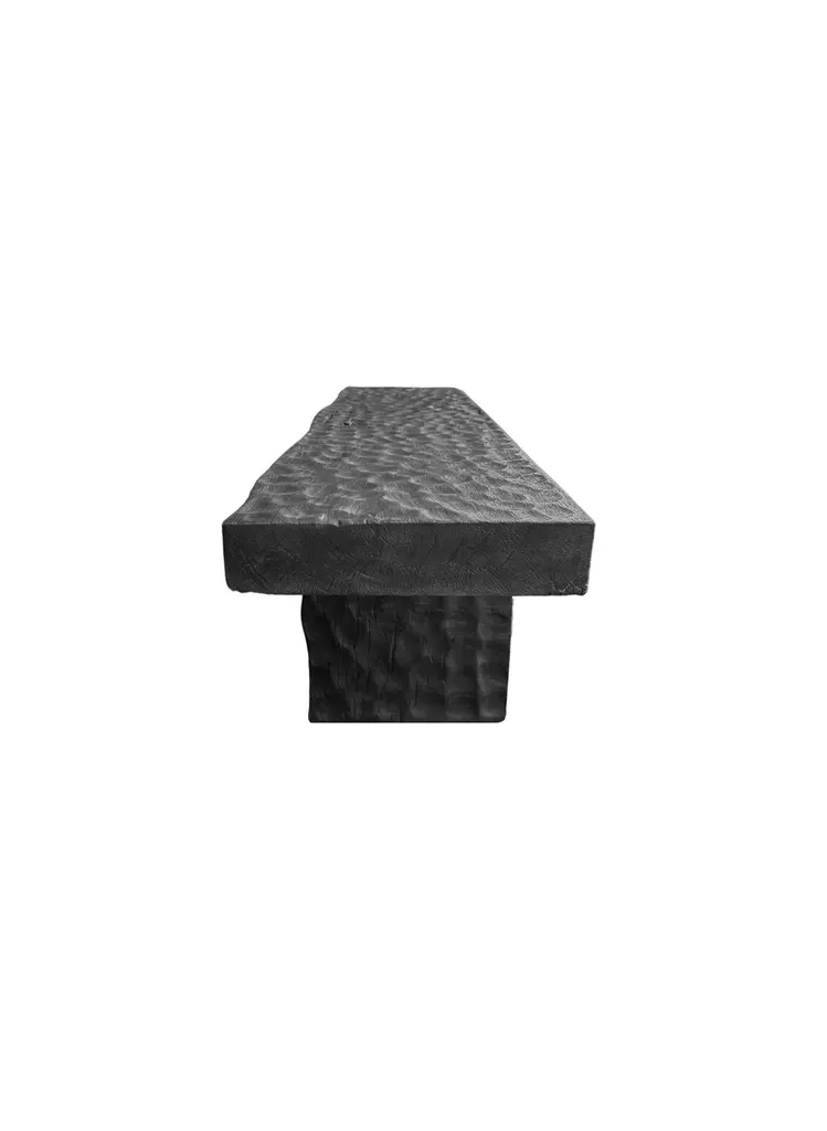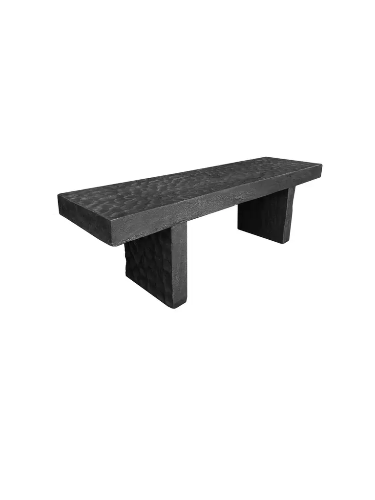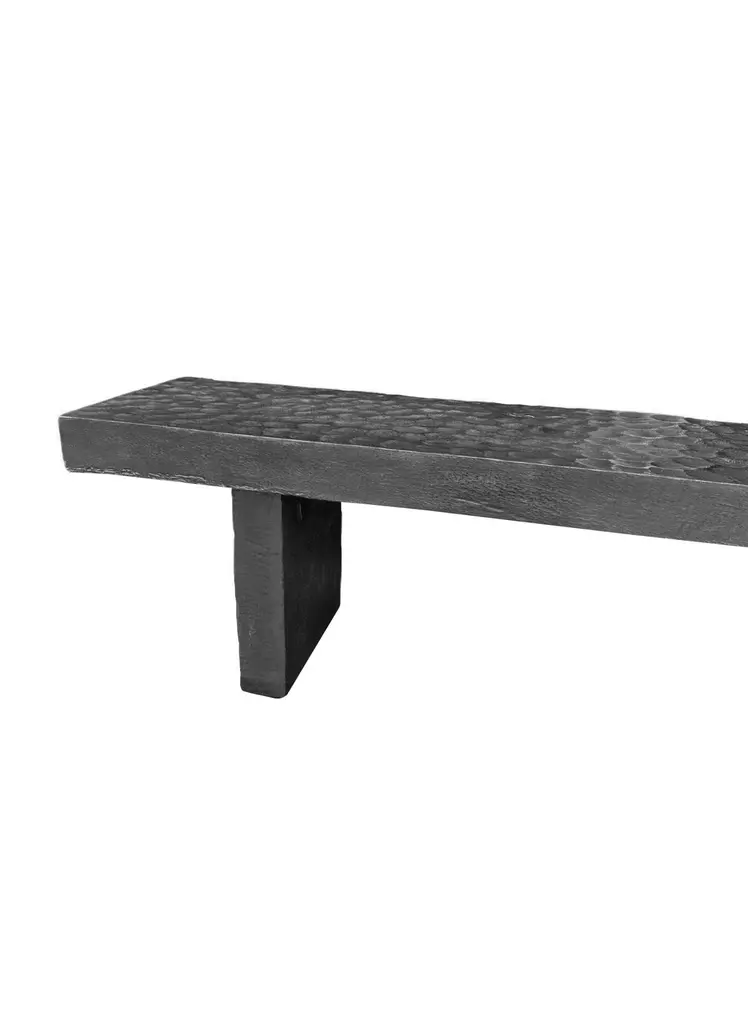 A sculptural hand-carved mango wood bench. To achieve is rich black pigment the bench was burnt three times and then finished with a clear coat. The mix of curved and straight lines along with a myriad of textures make for a very elegant bench. Unique to this bench is the hand hewn detailing present on all sides. A wonderful addition to any space.