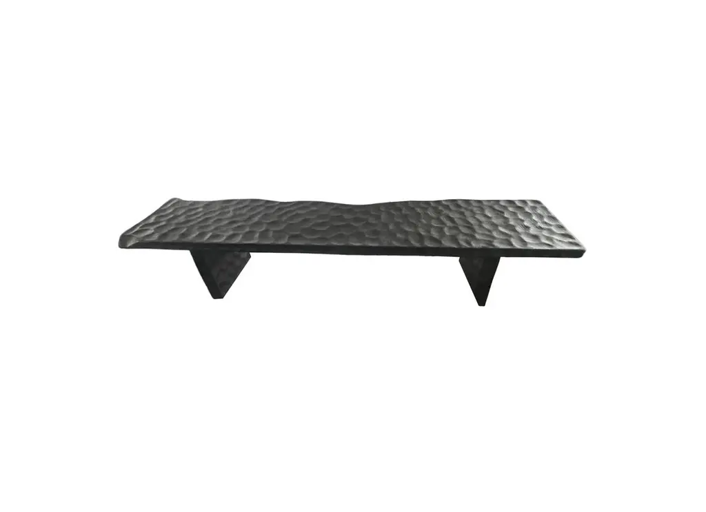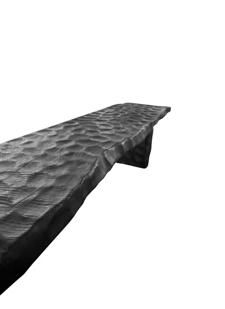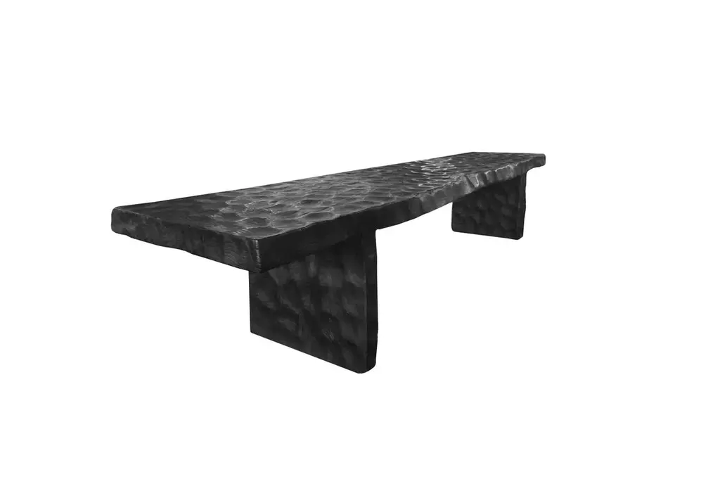 A sculptural hand-carved mango wood bench. To achieve is rich black pigment the bench was burnt three times and then finished with a clear coat. The mix of curved and straight lines along with a myriad of textures make for a very elegant bench. Unique to this bench is the hand hewn detailing present on all sides. A wonderful addition to any space.