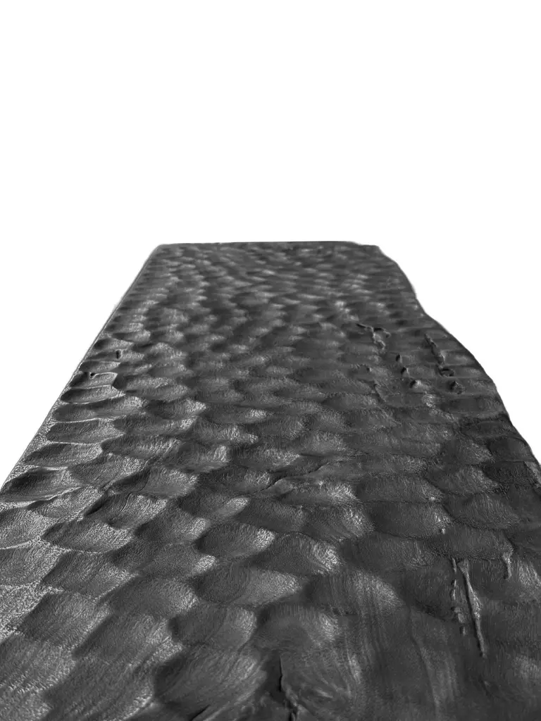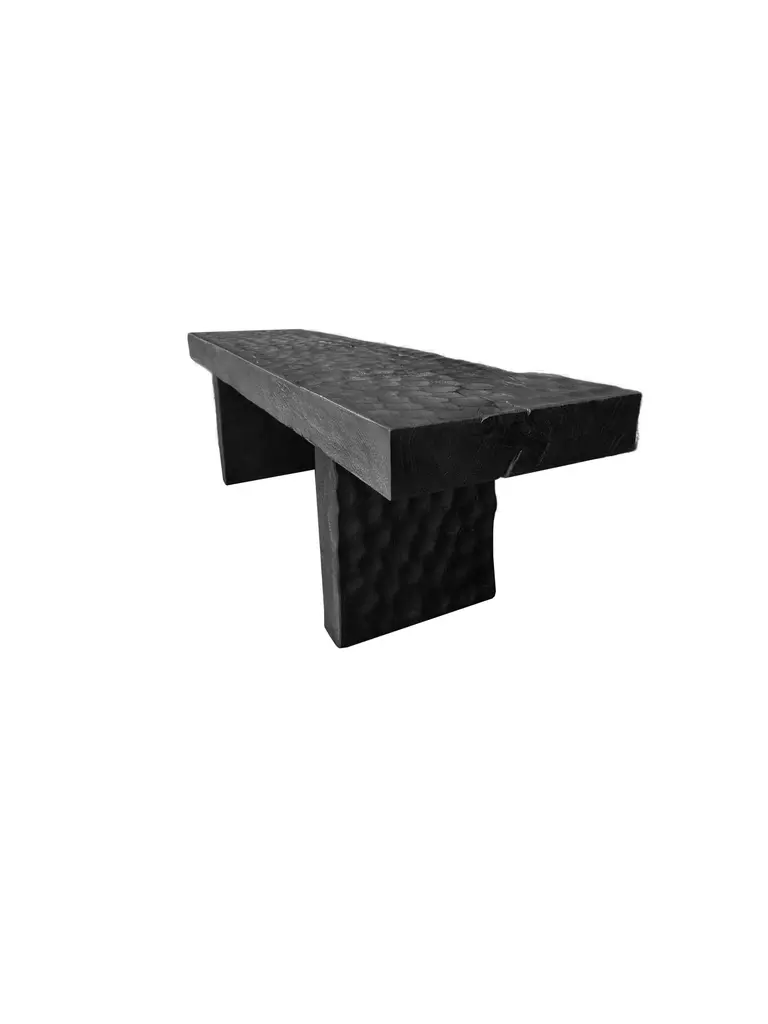 A sculptural hand-carved mango wood bench. To achieve is rich black pigment the bench was burnt three times and then finished with a clear coat. The mix of curved and straight lines along with a myriad of textures make for a very elegant bench. Unique to this bench is the hand hewn detailing present on all sides. A wonderful addition to any space.