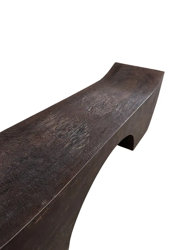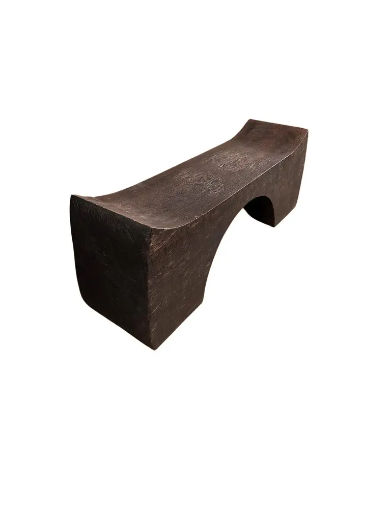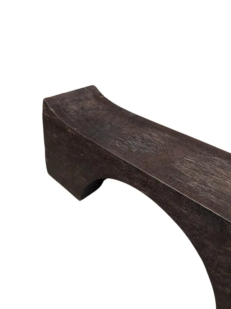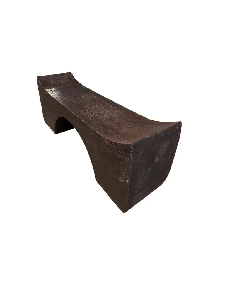 A sculptural hand-carved mango wood bench. To achieve its "espresso" pigment (color resembling coffee) the bench was burnt three times and then finished with a clear coat. The mix of curved and straight lines along with a myriad of textures make for a very elegant bench. Carved by skilled artisans on the island of Java this piece is a wonderful addition to bring warmth to any space.
