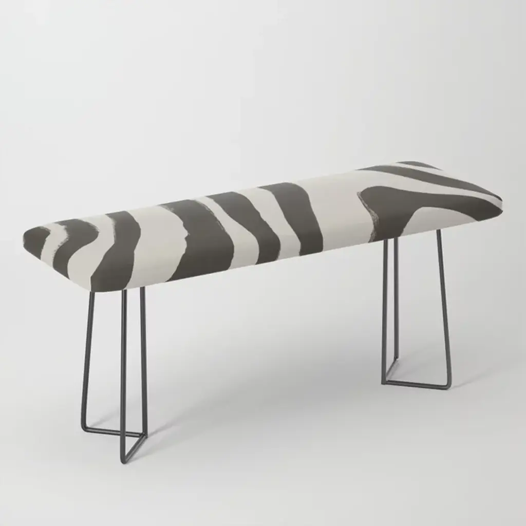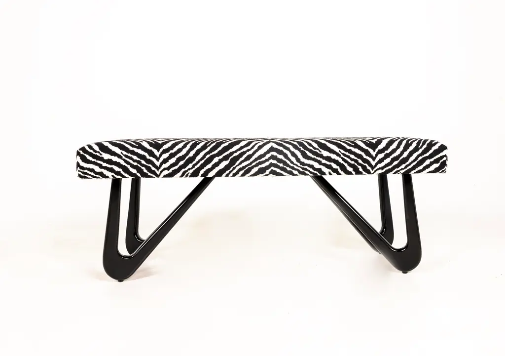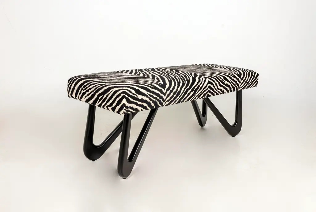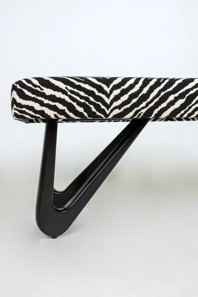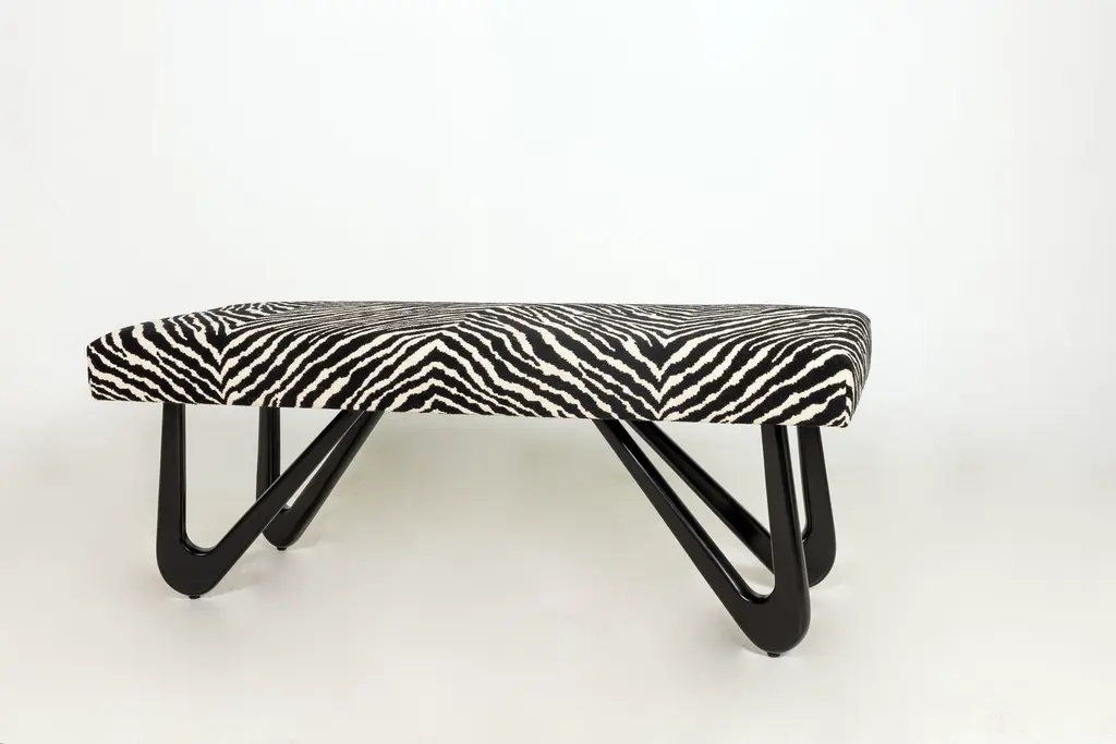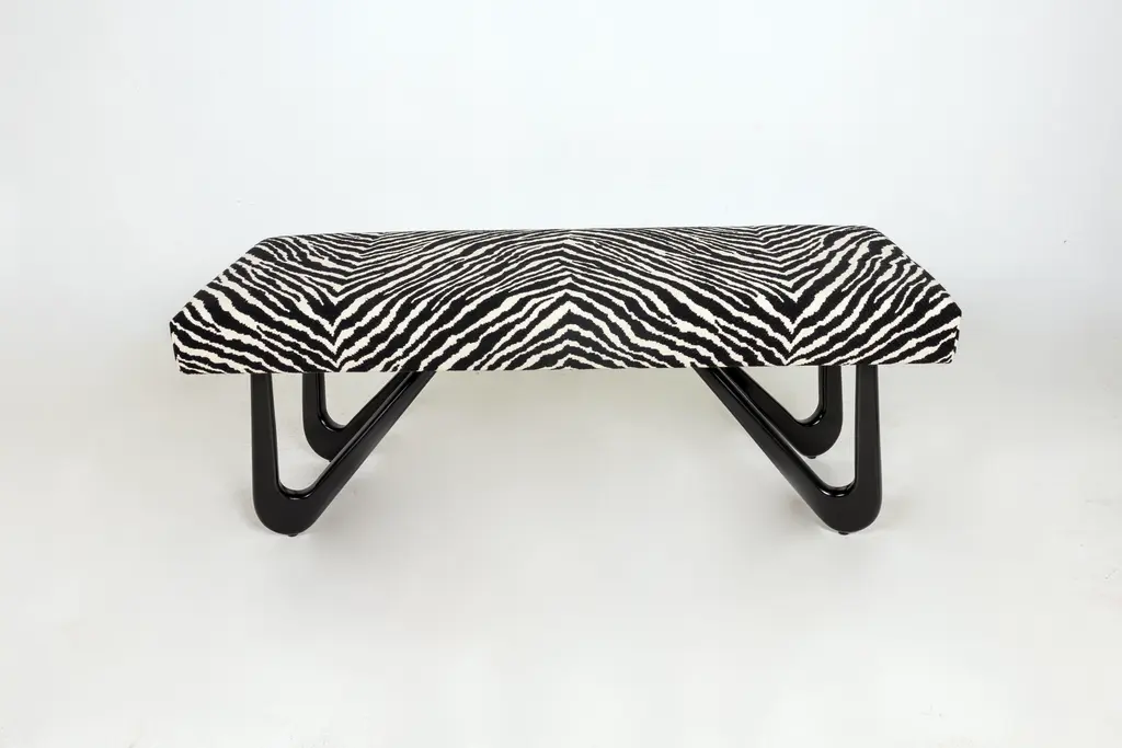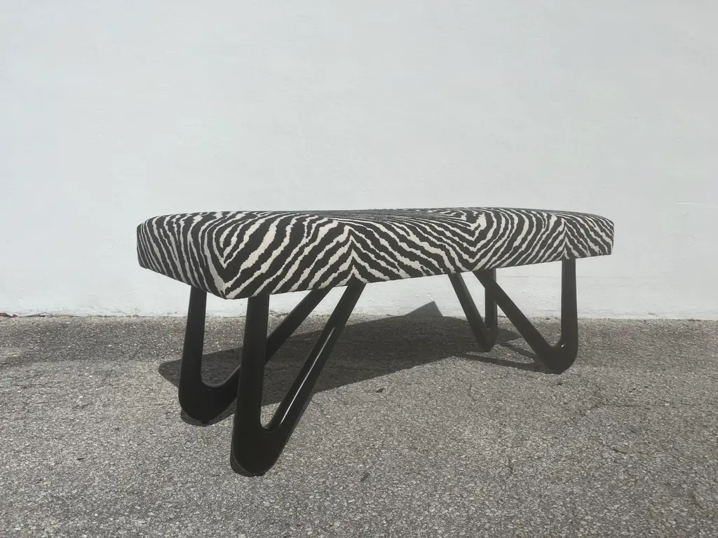 Sculptural bench. Solid Wood legs with black lacquer finish, bench covered in the best zebra fabric money can buy. Made in the USA. One bench ready to ship, more available.