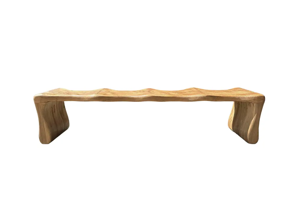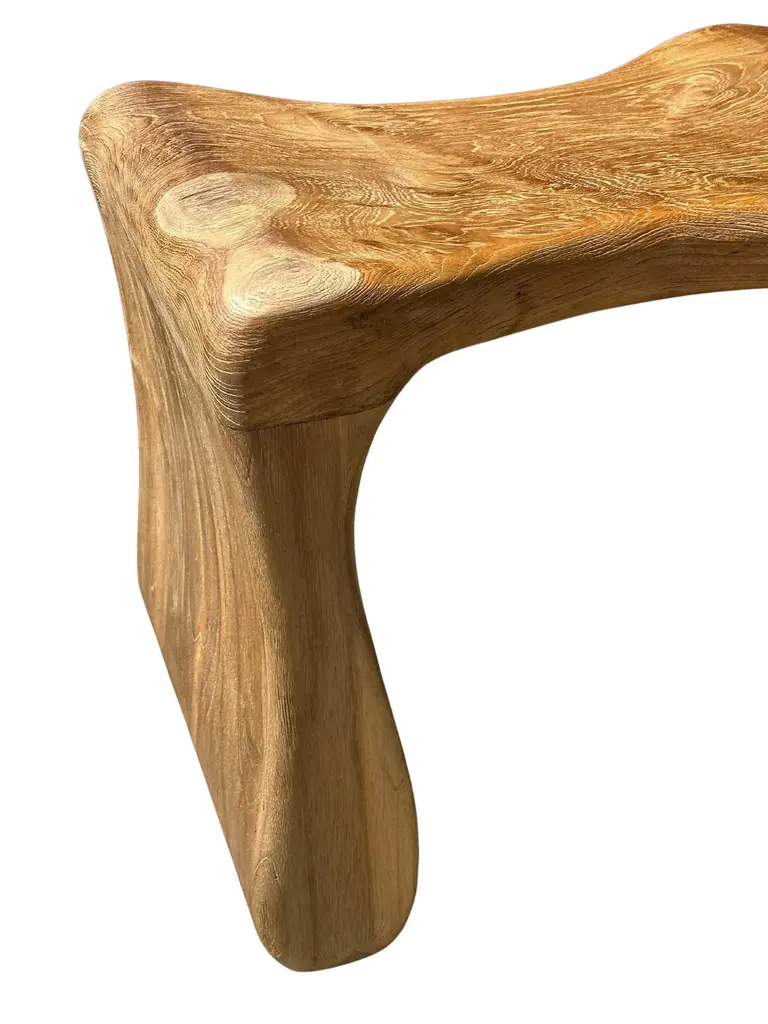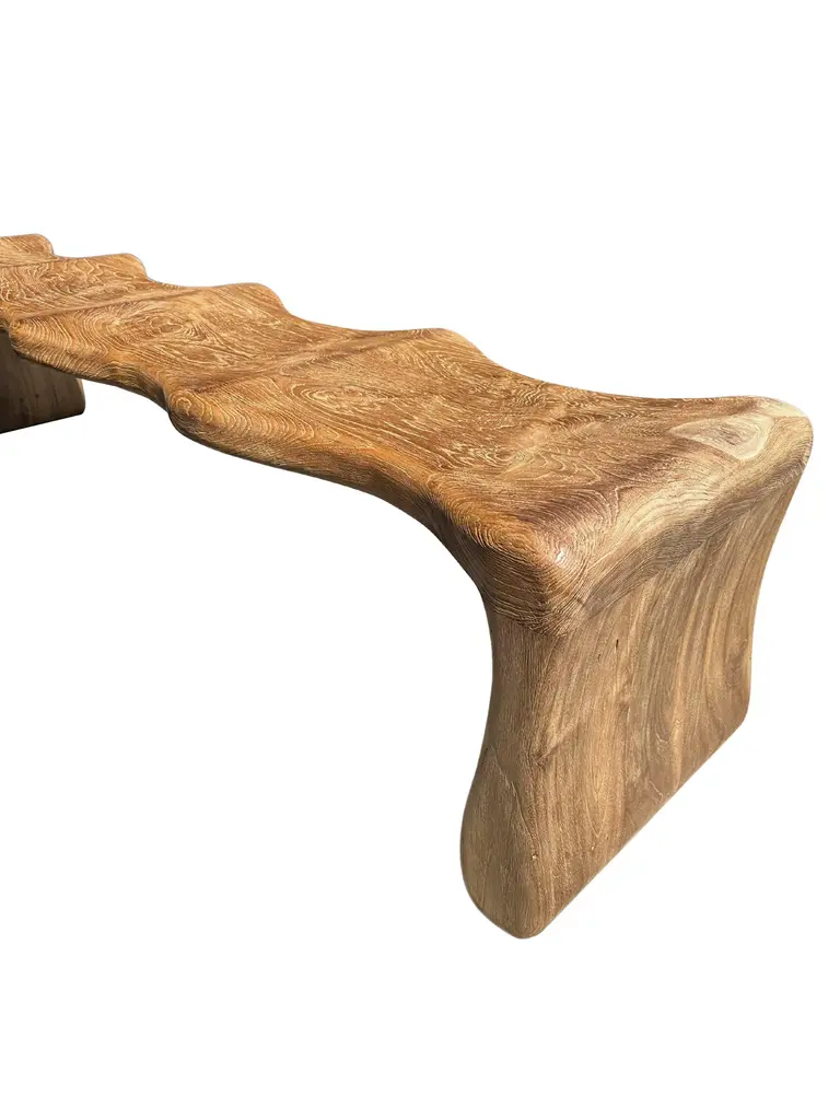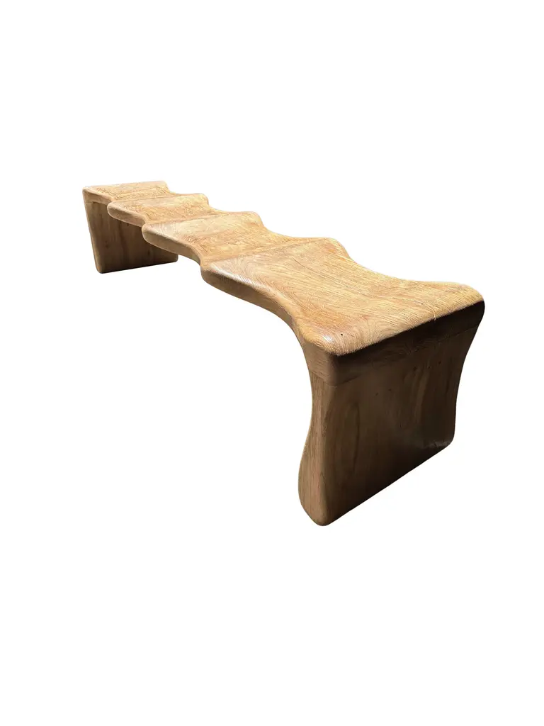Inspired by the contours of Bamboo, this bench was designed without any straight lines or edges. The bench was meticulously sculpted to the perfect shape from solid teak wood. The wood used to create this bench is reclaimed, sourced from old pillars of traditional Java Houses, from the island of Java, Indonesia. It features a natural finish with stunning wood contours and shades that add to its charm. The perfect object to bring warmth to any space. This bench is configured for four persons with curved seats that blend in with the benches form.