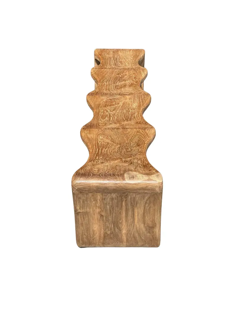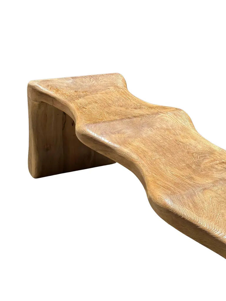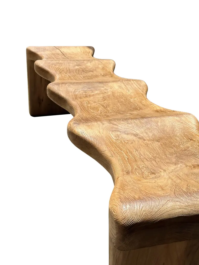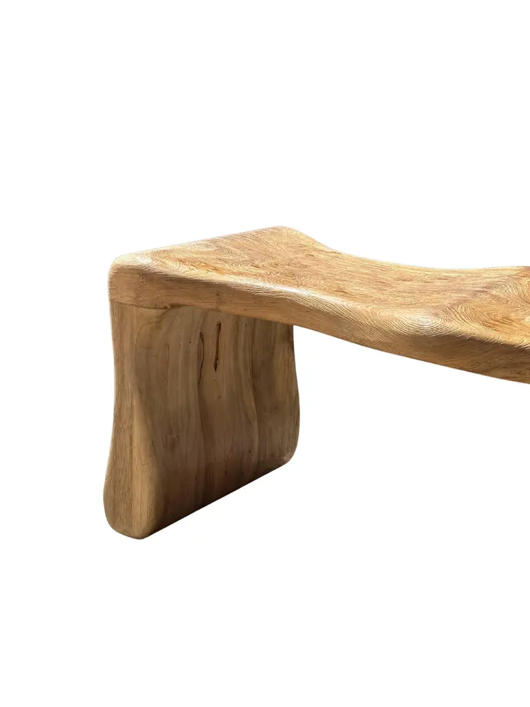 Inspired by the contours of Bamboo, this bench was designed without any straight lines or edges. The bench was meticulously sculpted to the perfect shape from solid teak wood. The wood used to create this bench is reclaimed, sourced from old pillars of traditional Java Houses, from the island of Java, Indonesia. It features a natural finish with stunning wood contours and shades that add to its charm. The perfect object to bring warmth to any space. This bench is configured for four persons with curved seats that blend in with the benches form.