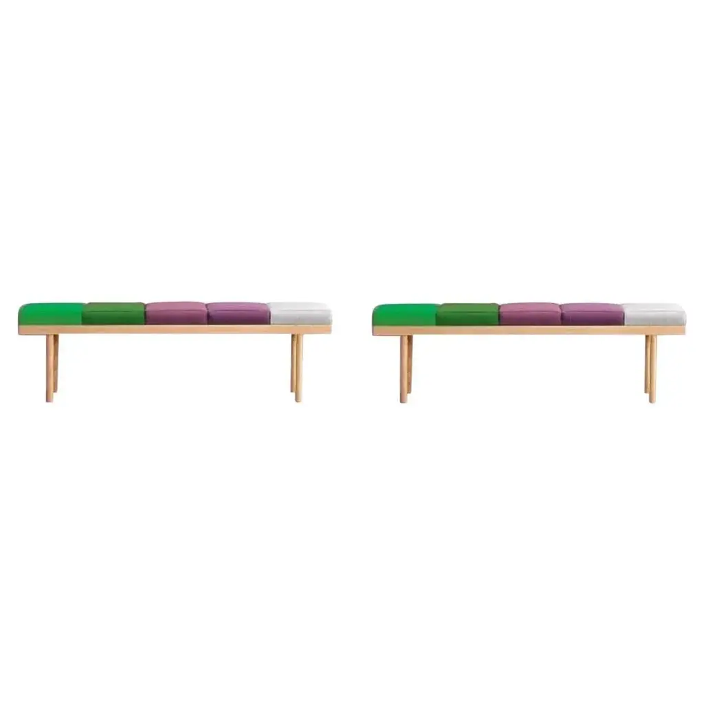 Pair of Valentino bench by Pepe Albargues Dimensions: 45 x 150 x 45 cm Materials: Beechwood structure. Seat stuffed with polyurethane 3542. The Valentino bench is an extremely versatile piece that adapts to everyone’s mood. It invites the user to play around and create their own color combination. with its five multicolored cushions Valentino invites each person to combine them as they wish, creating their own unique composition. Create, play around and enjoy this versatile piece in the favourite corner of your home or office. This piece is attributed to the mentioned designer/maker. It has no attribution mark and no official proof of authenticity, however it is well documented in design history. I take full responsibility for any authenticity issues arising from misattribution
