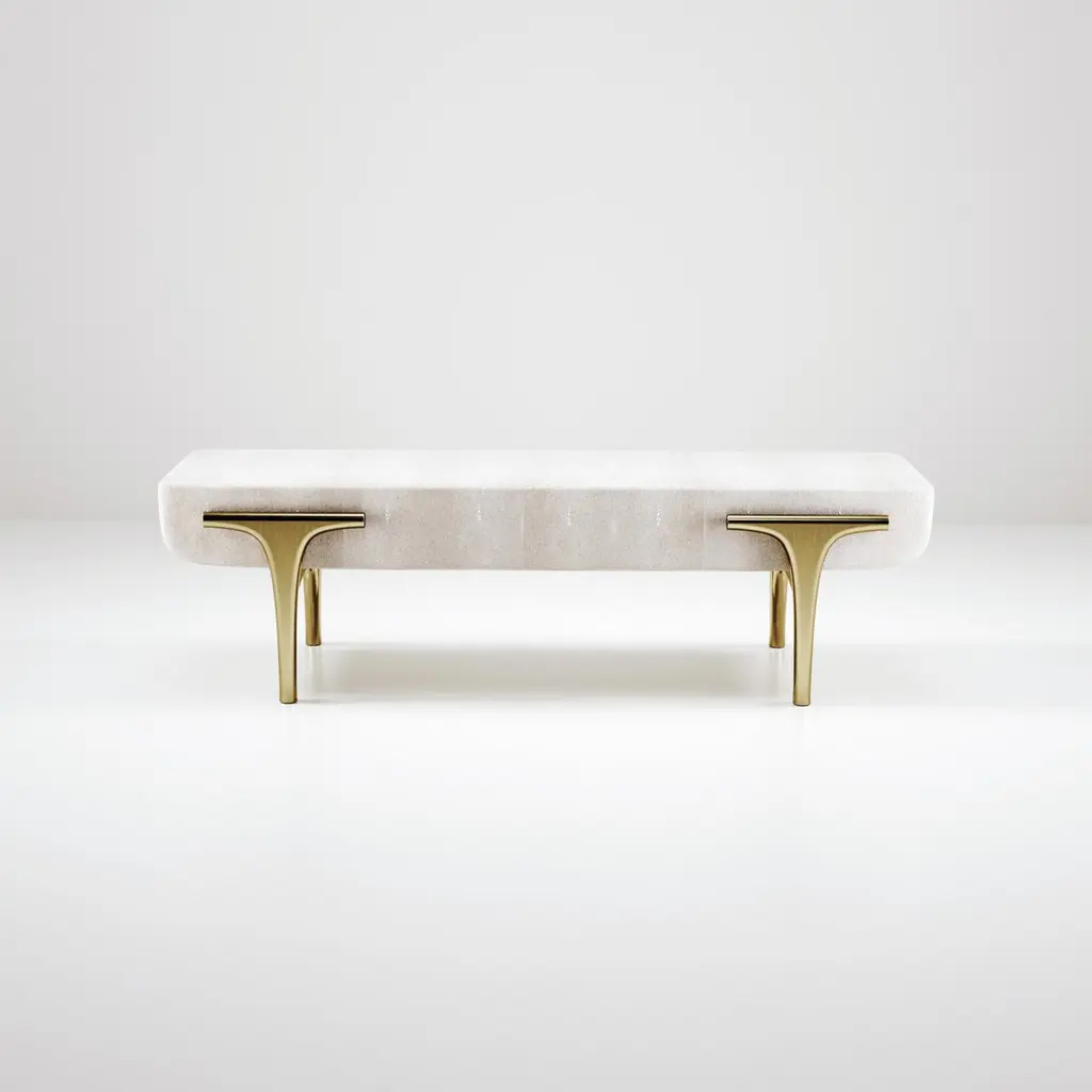 The Paris based label has distinguished themselves since their launch, with their iconic use of shagreen mixed with brass and other exotic materials. All furniture is handcrafted by skilled artisans, ultimately making each piece unique, designed in Paris and produced in the Philippines.The Ramo Bench by R & Y Augousti is an elegant and versatile piece. The cream shagreen inlaid piece provides comfort while retaining a unique aesthetic with the bronze-patina brass frame and details. This listing is priced for shagreen inlay, see other listings for pricing of our fabric and COM. Part of the Ramo Seating Series, see images at end of slide.The dimensions of this piece are Length - 150.0 cm depth 46.0 cm height 43.0 cmAll R & Y Augousti pieces are handmade by artisans, ultimately making each piece unique.Wipe clean with soft dry cloth.Acclaimed design duo Ria & Yiouri Augousti have established themselves since the 1990s as pioneers of modern-vintage style through their luxurious Art Deco inspired collections.The Paris based label has distinguished themselves since their launch, with their iconic use of shagreen mixed with brass and other exotic materials. All furniture is handcrafted by skilled artisans, ultimately making each piece unique. All shagreen-covered items should be kept out of direct sunlight, color variants may occur on the stingray and other exotic finishes, but this showcases the Parisian label's commitment to creating authentic luxurious products using natural components.
