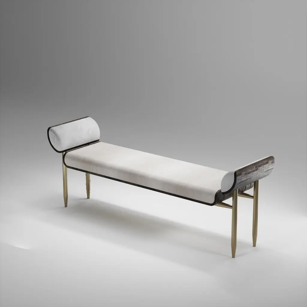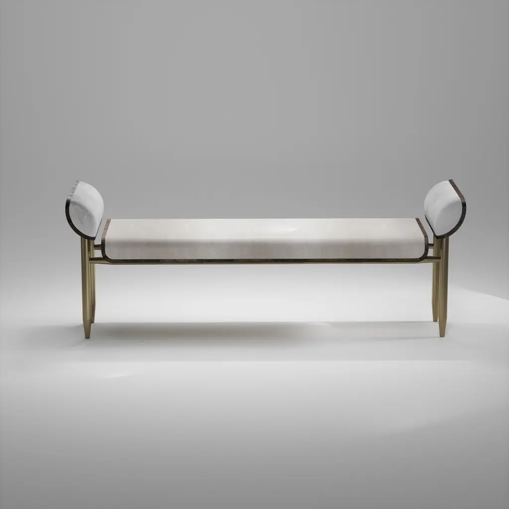The Paris based label has distinguished themselves since their launch, with their iconic use of shagreen mixed with brass and other exotic materials. All furniture is handcrafted by skilled artisans, ultimately making each piece unique, designed in Paris and produced in the Philippines.Inspired by the original Dandy Bench by Kifu Paris (see images at end of slide), the Dandy II Entrance Bench is the ultimate luxury seating. The seating area is inlaid in cream shagreen the frame and sides of the bench in Palmwood and the legs are completely inlaid in bronze-patina brass. On the left and right side of the bench both armrests are in upholstered with white vachette. Other versions are also available as part of the Dandy II Capsule, see images at end of slide. This piece is designed by the daughter of Ria and Yiouri Augousti. The finish of the shagreen is authentic as it is hand-dyed and the designer calls the finish look: "antique natural shagreen."The dimensions of this piece are 160.2 x 45 x 71.4 cmAll Kifu Paris pieces are handmade by artisans, ultimately making each piece unique. Wipe clean with soft dry cloth.Although inspired by her parents, her collection of Home Accessories and Furniture is a distinct identity of its own. Kifu uses handmade techniques of elaborate inlay patterns of shagreen, shells, semi-precious stones, materials she experienced as a child growing up in her parent’s studio, but interpreted in a younger quirkier way reflecting her youth. From her "jewelry inspired knobs" on decorative boxes, gold bar boxes and an extravagant inlay pattern mix of shagreen and shell inspired by galactic constellations, as seen on her enormous round mirror, is refreshing to see. Kifu embodies whimsical elements throughout her collection and is not afraid to be daring and unexpected in her approach to design. All shagreen-covered items should be kept out of direct sunlight, color variants may occur on the stingray and other exotic finishes, but this showcases the Parisian label's commitment to creating authentic luxurious products using natural components.