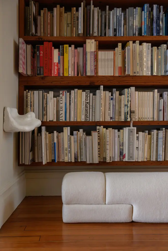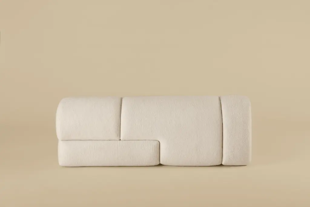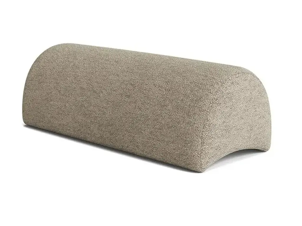 Sheep bench is designed by Studio Ahead. The bench is upholstered in custom cream merino wool felt from Northern California sheep. Each side design is unique. Designed and fabricated in North California. The form of the bench is inspired by the curvature of stones found at Muir Beach, which have been shaped over time by ocean currents. Each side design is unique.Dimensions :40in. Width, 12.25 in. Depth, 14in. HeightCustom sizes available upon requestAvailable in 4 wool felt color options and COM upon request.