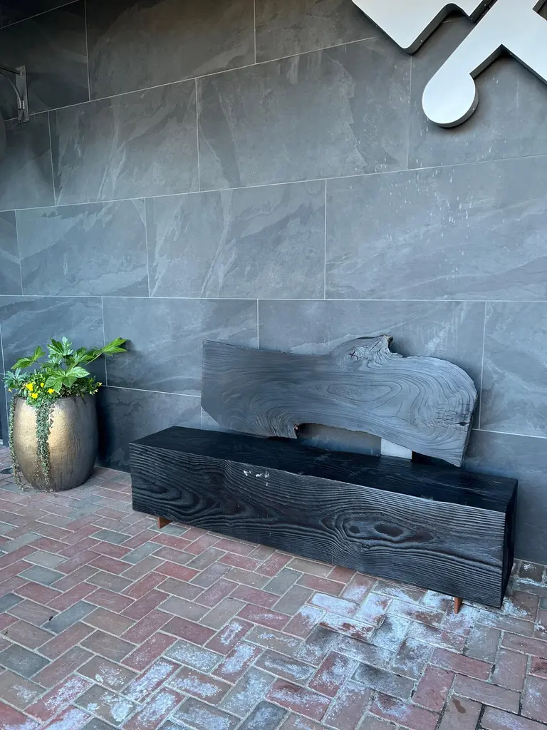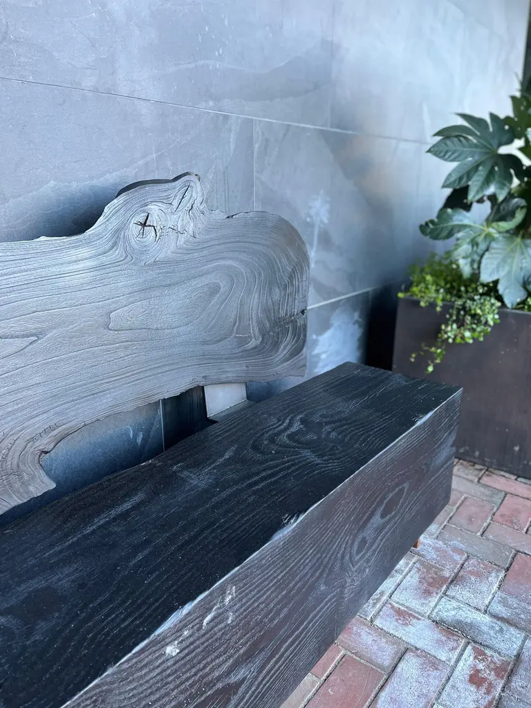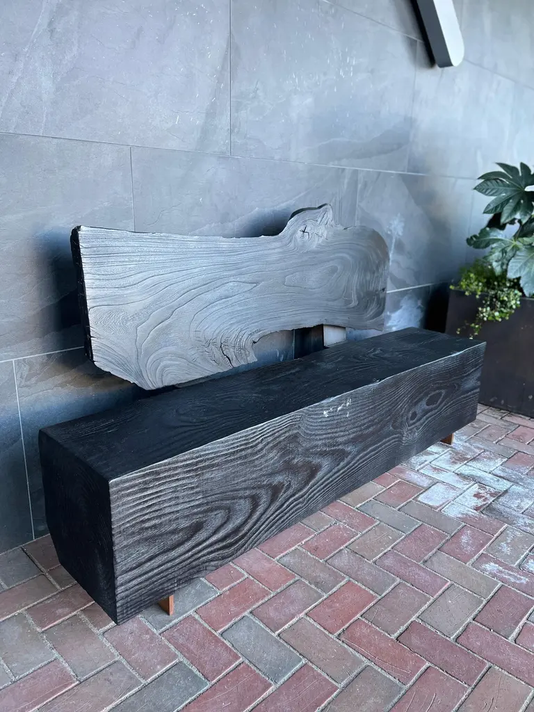 Our beam bench with live edge back utilizes salvaged local pine logs for a rustic bench. The trio of a simple form of the bottom with rusted corten steel legs and a graceful live edge back, expresses the natural textures of the end grain pine, live edge wood and industrial rusted steel to create an elegant and intriguing seating.A 15" x 15" beam is milled and finished to sit on a Corten steel legs, mortised into the bottom of the beam. The beam bench brings rustic beauty at a variety of lengths. Cracks, knots and variation is part of the grace of these pieces. The wood will continue to move and the finish to age over time. The finish is shou sugi ban, a traditional process of burning, wire-brushing and oiling the wood. We add a low sheen, urethane for extra protection and seal. Indoor or covered patio outdoor is preferable to complete exposure to the elements. Wood will age faster outside and may crack or move, as with all wood. Depending on exposure, regular cleaning and yearly re-application of urethane may be required. Crack will reveal unfinished wood. Corten steel is intended to rust.