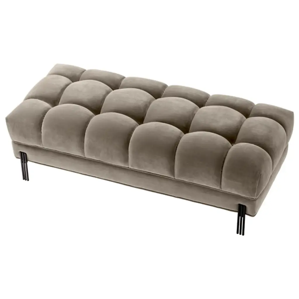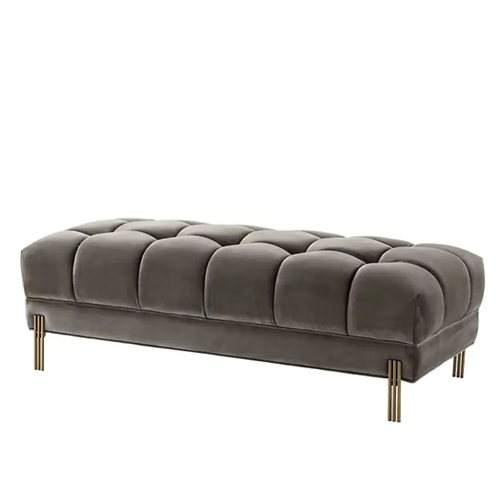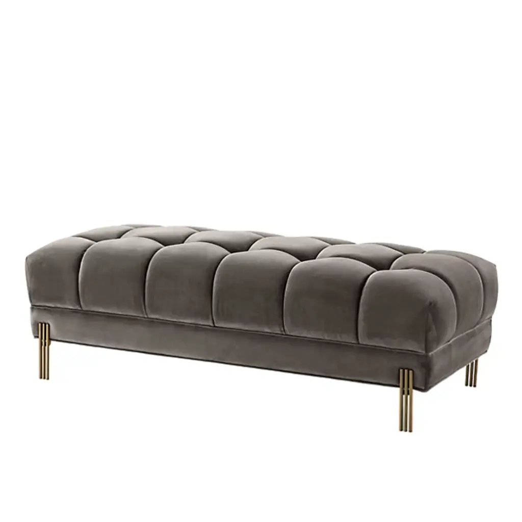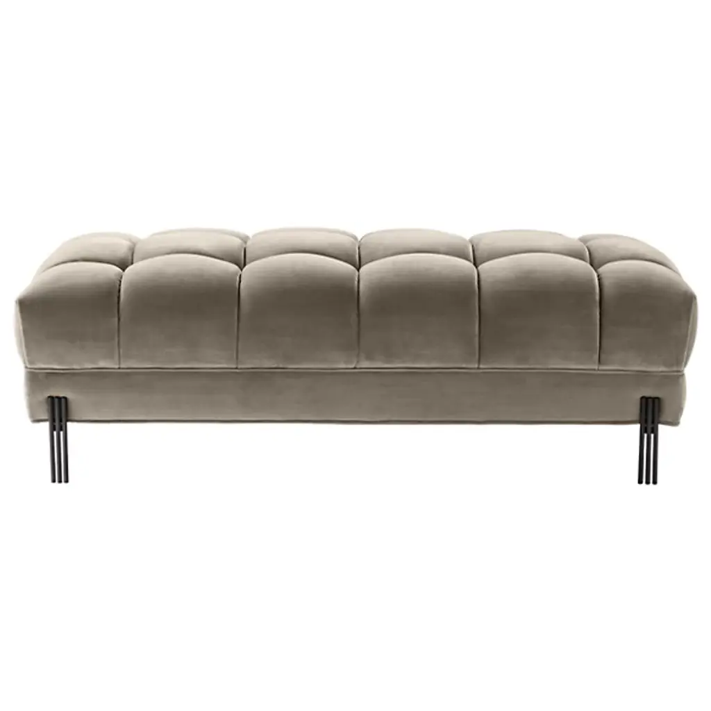 Bring art deco elegance to your space with the Sienna Bench from Eichholtz. Enveloped in lush polyester upholstery, this bench features a metal frame with a geometric silhouette. The upholstered cushions have a refined shape that is somewhat square yet softly rounded at the edges. Together, the cushions create a gracefully curved seating space defined by pronounced seams. Place Sienna at the foot of your bed for a glamorous accent, or use it to add a bold sense of style to your entryway.