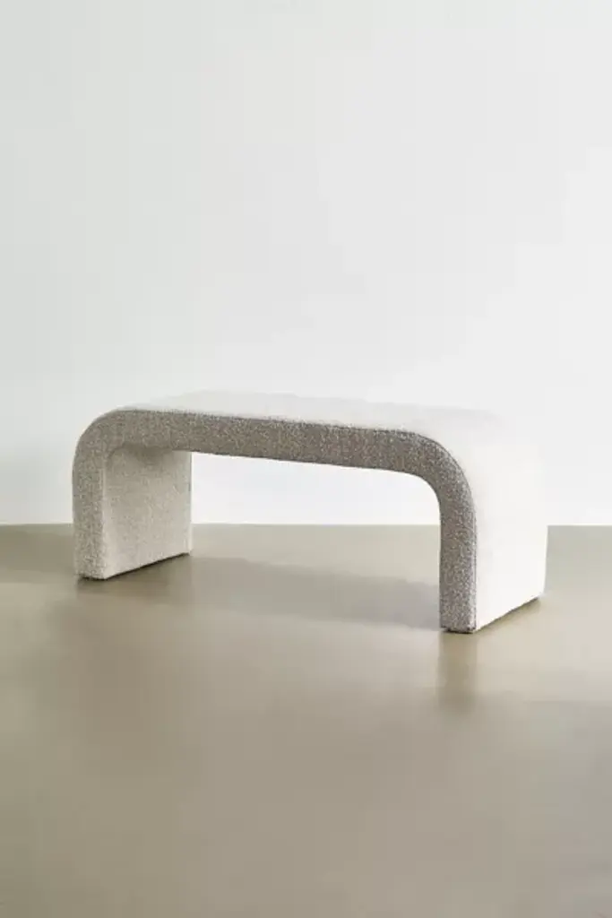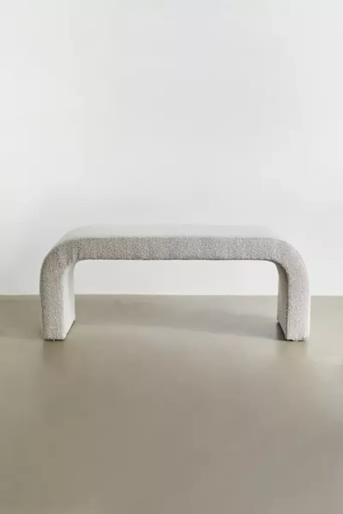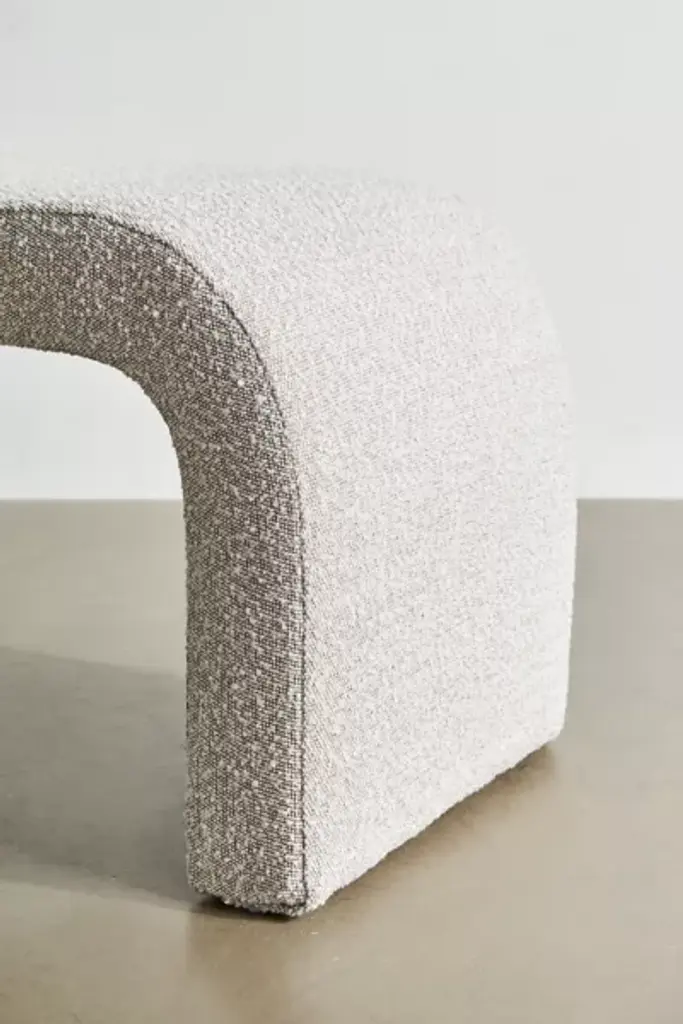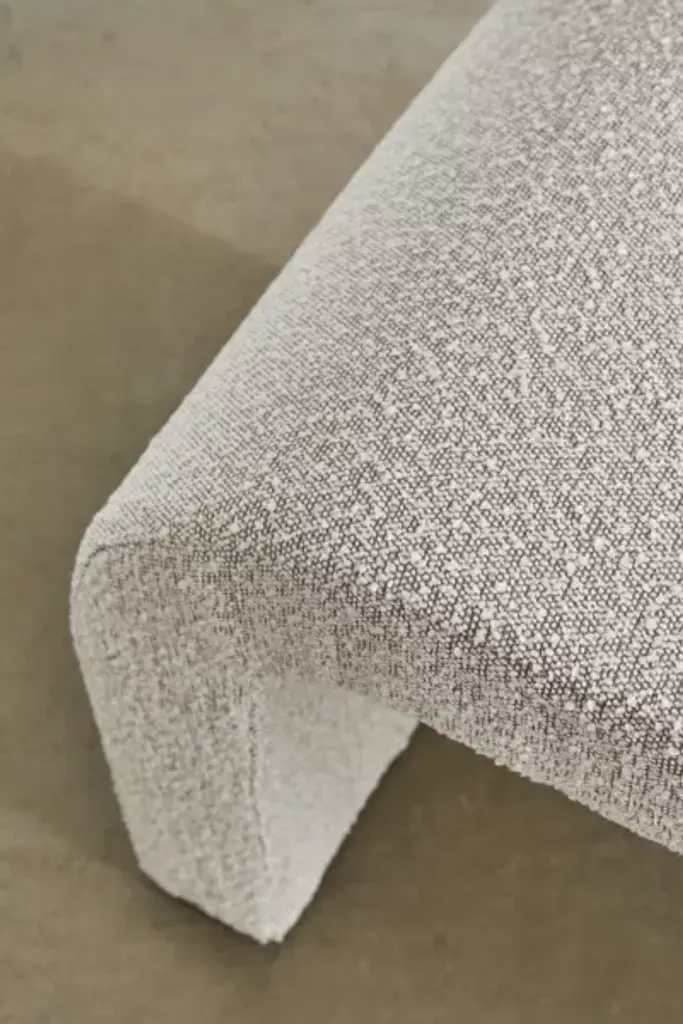 Long curved bench upholstered in textured boucle. Perfect at the end of the bed or in the entry. This custom furniture piece will be made to order just for you. **Features** \- Upholstered bench \- Long, curving silhouette \- Upholstered allover in textured boucle \- Made to order just for you **Content + Care** \- Polyester, wood \- Spot clean \- Made in the USA **Size** \- Overall dimensions: 52"l x 19"w x 20"h \- Leg height: 16" \- Clearance: 16" \- Seat height: 20" \- Weight: 30lbs \- Shipping package dimensions: 19"l x 21w" x 53"h \- Shipping package weight: 32lbs