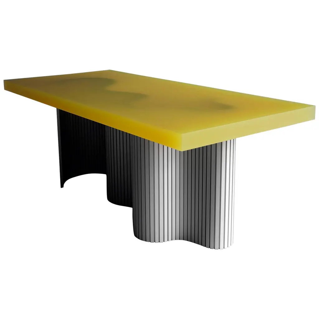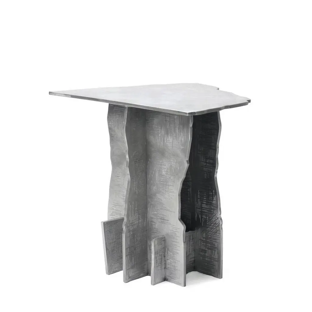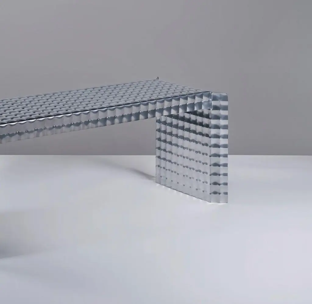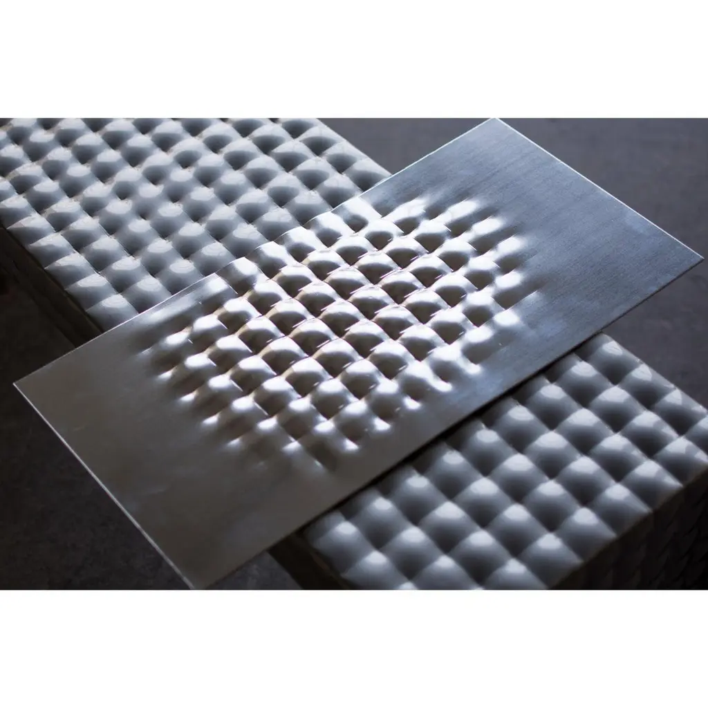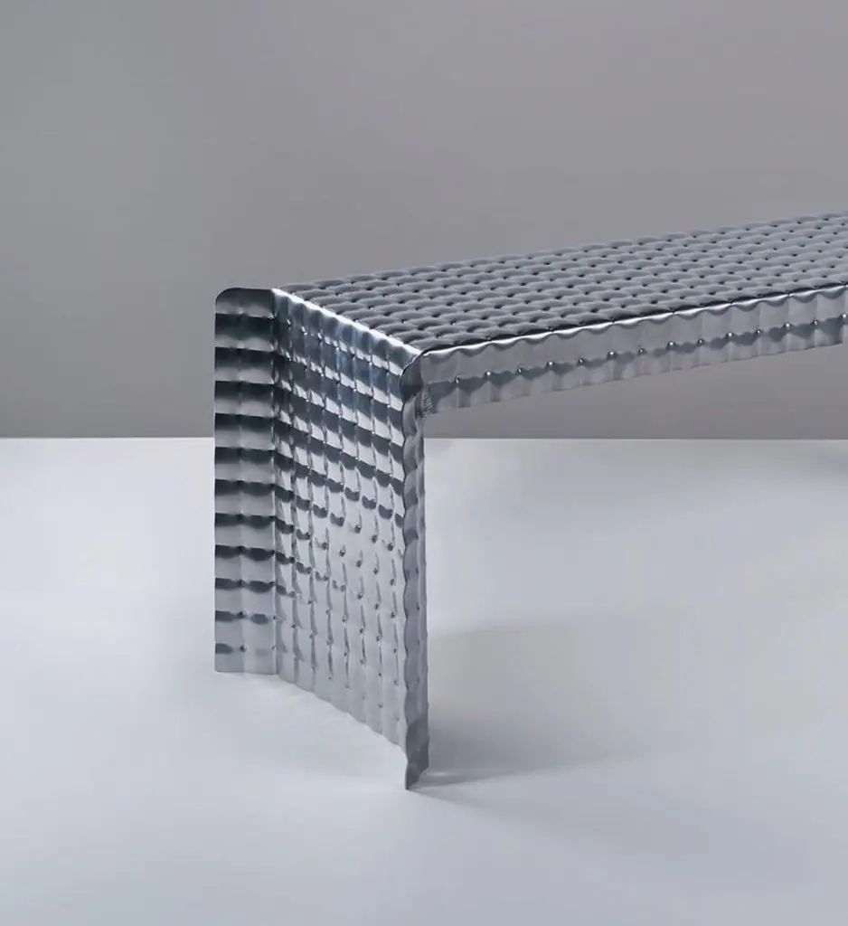 Silver/ Chrome Pressure bench by Tim TevenPressure Series (2018 - Ongoing)Dimensions: 90 x 30 x 39 cmMaterials: Aluminium, Powder coatingIn the pressure series, Tim Teven uses material deformation under extreme pressure as a tool to design. The deformation of metal by exerting pressure leads to exciting technical details, as well as new optical and haptic qualities. The Pressure Stool and Bench are made of aluminum sheets into which a pattern is pressed. On one hand, the material is hardened, on the other hand, the normally cold and stiff aluminum takes on an unexpectedly soft and pleasant appearance. This technique makes it possible to produce lightweight seating furniture from aluminum only 2mm thick.Tim Teven (1993), a dutch designer, graduated from Design Academy Eindhoven in 2018. A technical and material-driven approach to design together with a hands-on way of working allows him to play and create in an experimental way. In many of the works, the production process is used as a tool to design and a leading aspect to shape the final outcome and function of the object. Treating materials in an unconventional way to rethink the process of making, allows him to find surprising techniques which then can be translated into a functional yet interesting object. Teven works from his design studio based in Eindhoven founded in 2018, where all the objects are hand-made with industrial craftsmanship.
