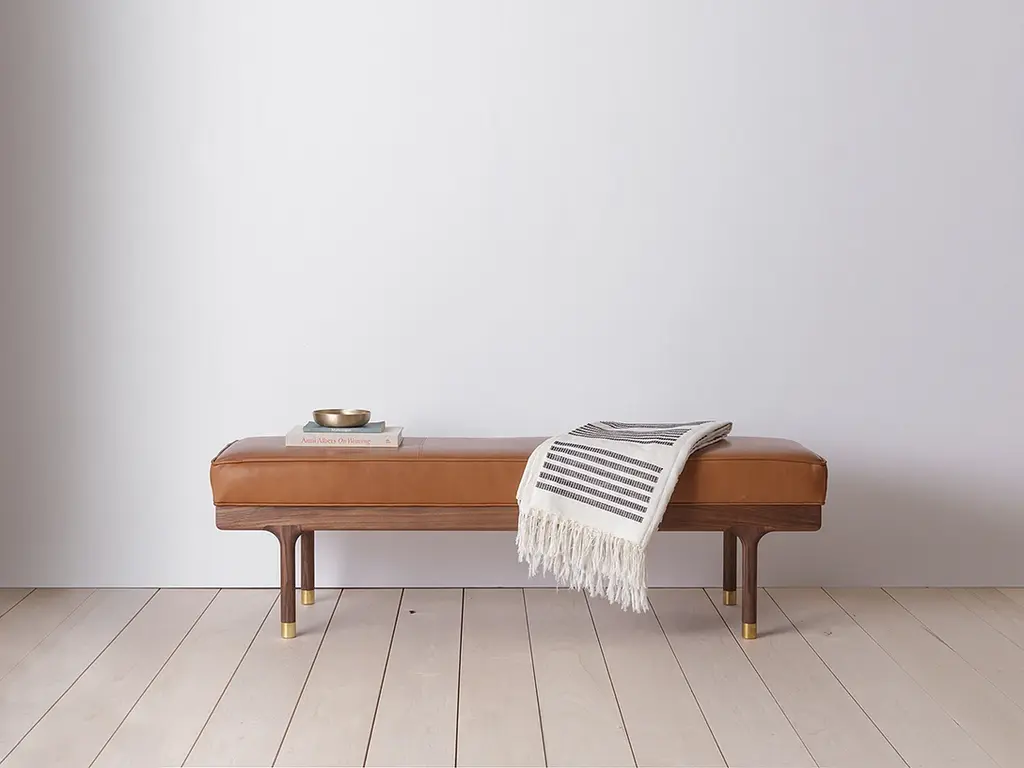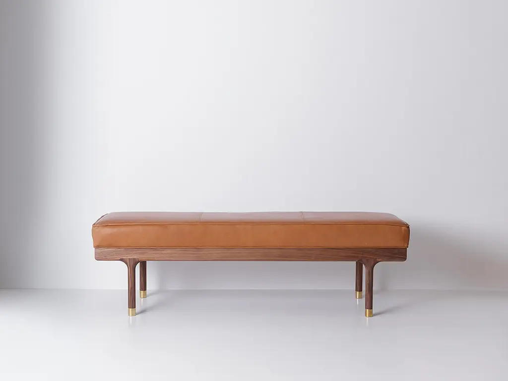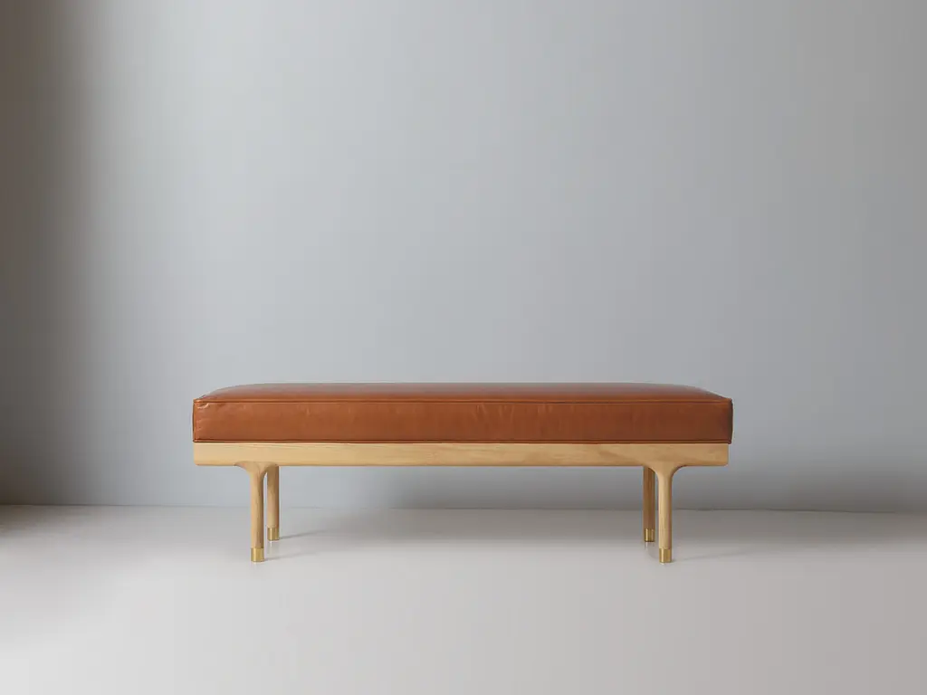 The Simple Bench is made from pure, honest materials including solid, oil-rubbed domestic hardwoods, machined brass and beautifully textured aniline leather. The bench works as a stand alone piece or pairs exquisitely with other items in the collection. Available in American Ash or American Black Walnut, as well as custom species or built to custom spec upon request. Wood is hand-rubbed and finished with Kalon Standard Finish, a natural oil/wax finish painstakingly developed to enhance and maintain the wood’s beauty and breathability.