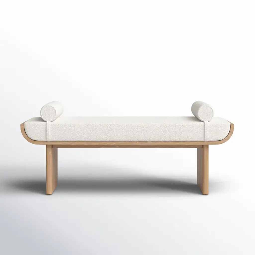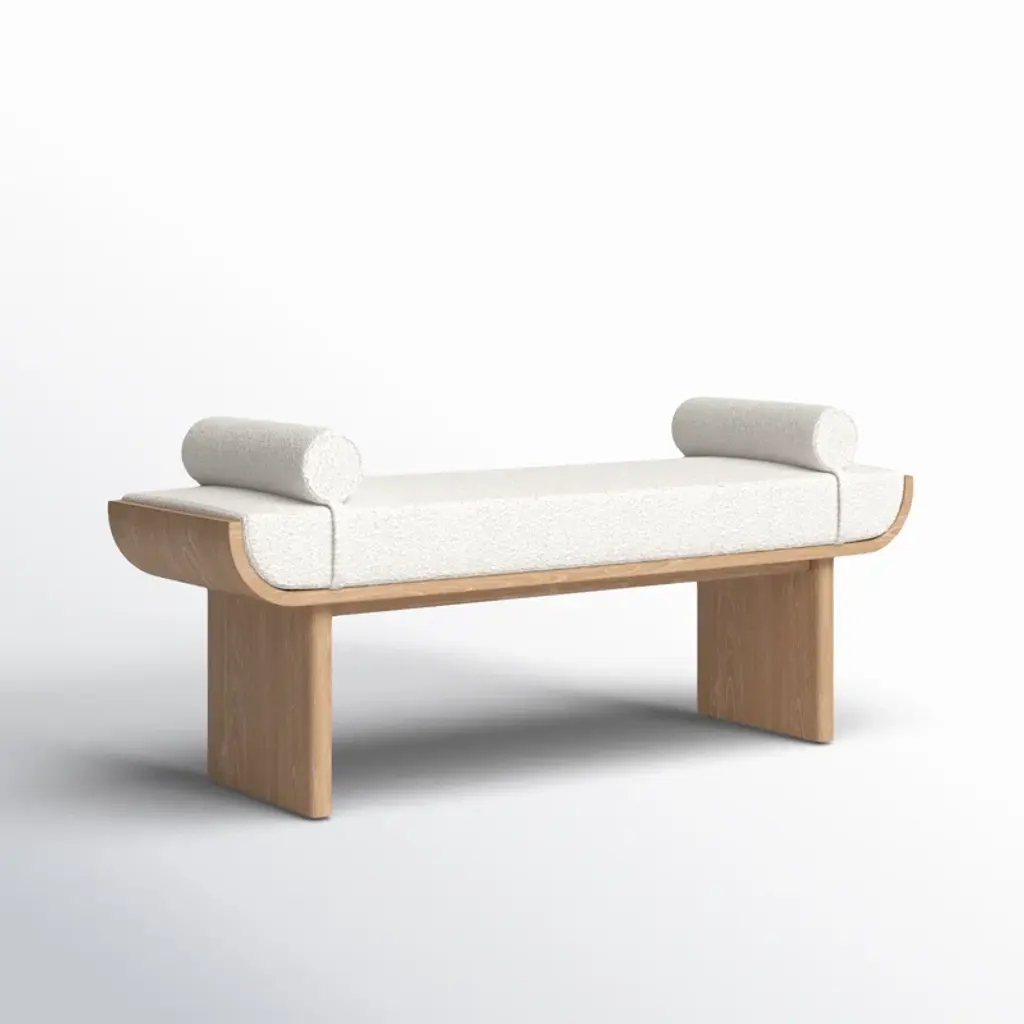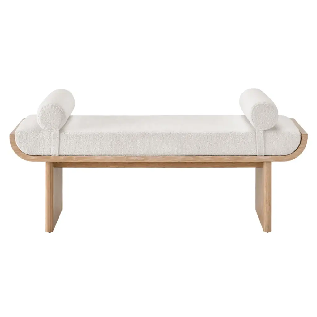Artistic and appealing, the Bed Bench adds layers of texture and inspired aesthetic to any home space with an upholstered body, a fresh oak-finished frame and removable bolsters.