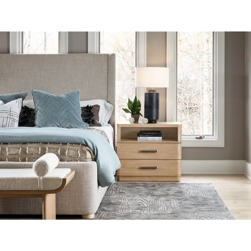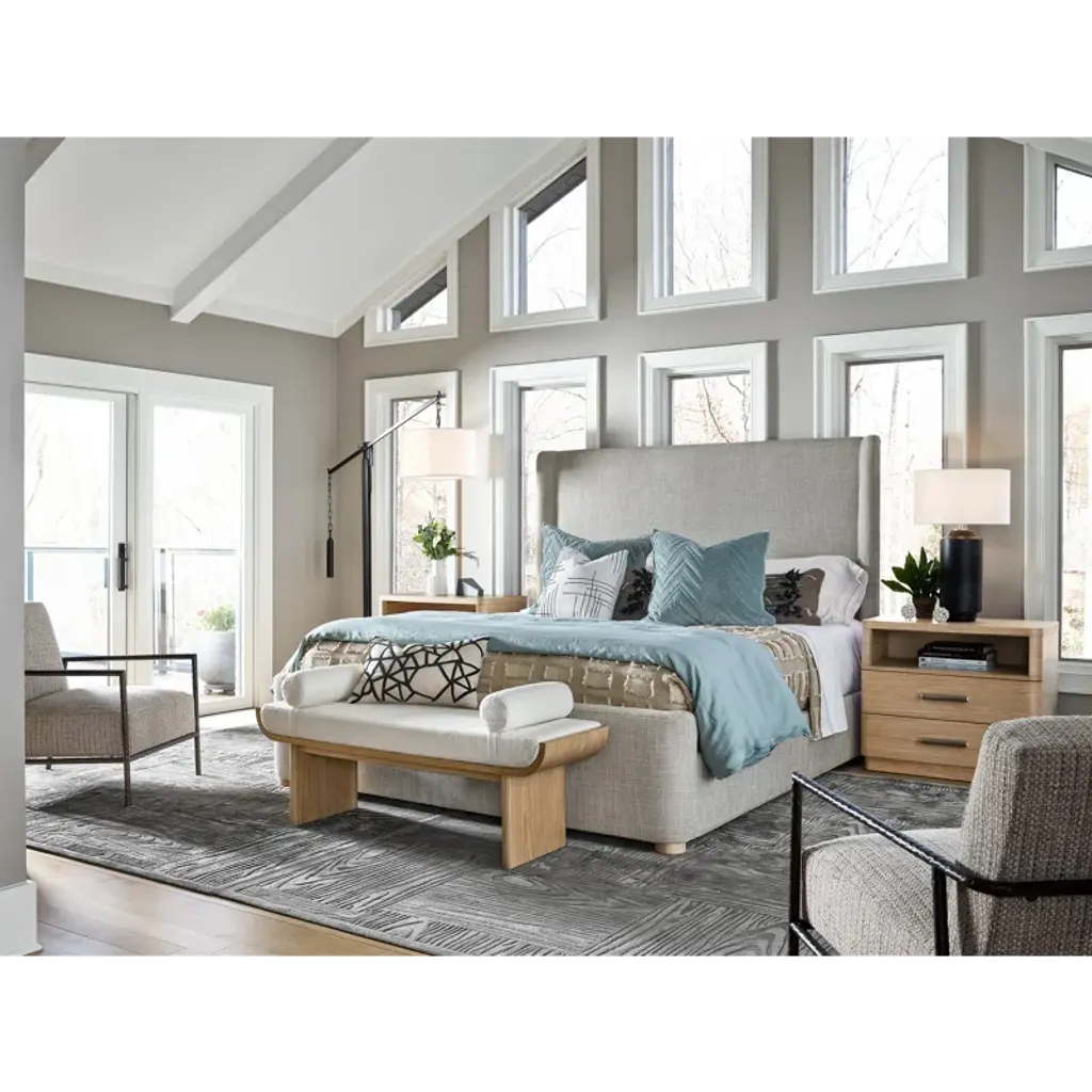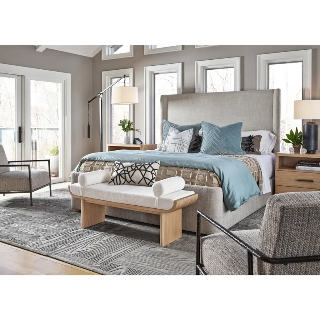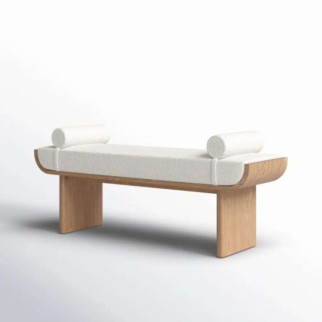 Artistic and appealing, the Bed Bench adds layers of texture and inspired aesthetic to any home space with an upholstered body, a fresh oak-finished frame and removable bolsters.