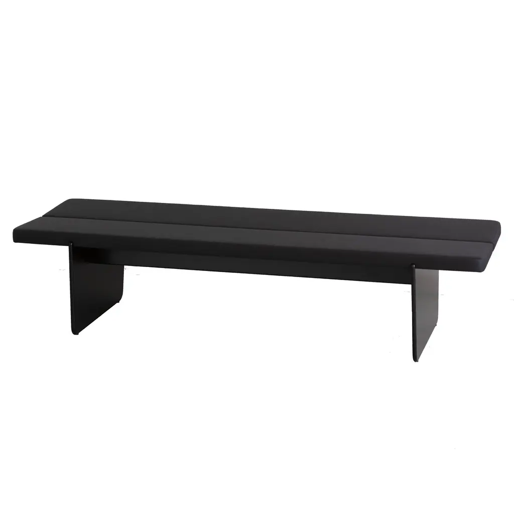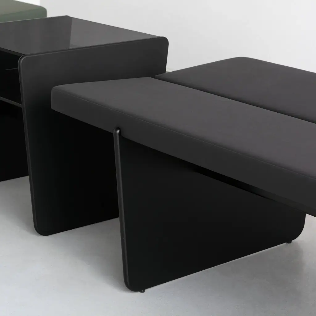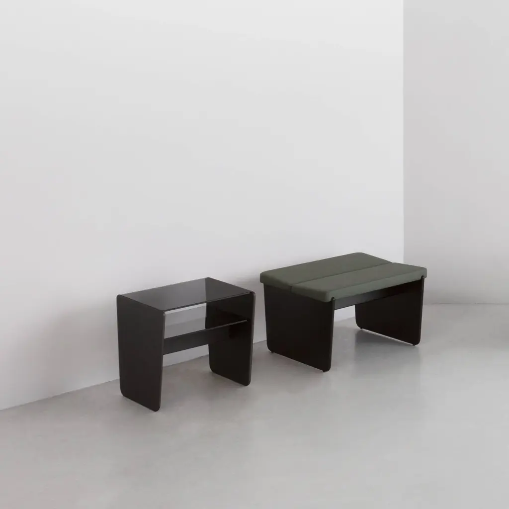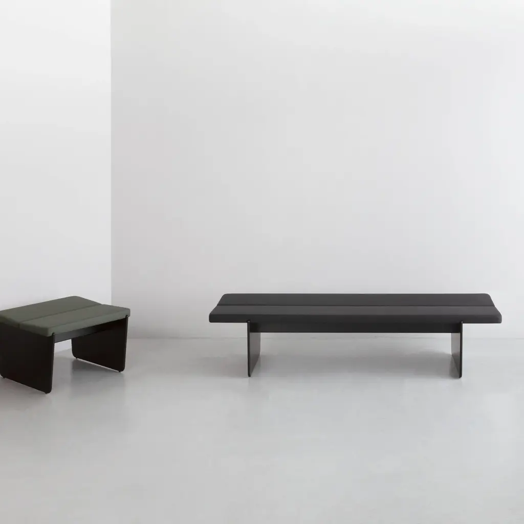 The clear geometrics of By Interiors’ Sled series extend with a bench structured from recyclable aluminum panels. Designer Tomoya Tabuchi divides the cushioned seat into 2 angled lengths for a comfortable repose and added visual interest. Available in rectangular or square versions and a wide range of upholstery materials, the strikingly spare piece suits entryways and corridors and can also be clustered in open spaces.