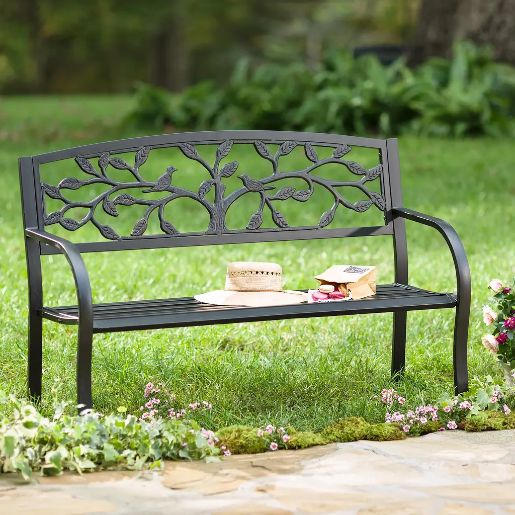 Our Tree of Life Metal Garden Bench makes any space a lovely place to sit and reflect on the beauty of nature. This sturdy, full-sized garden bench has a powder-coated steel frame with a cast-iron back detailed with a graceful tree and birds.The tree of life is a symbol that represents the interconnection of all living things. That’s why our Tree of Life Metal Garden Bench belongs in the most serene spot of your garden. Enjoy the comfort of curved arms while you observe nature from the best seat outside the house. Easy assembly.