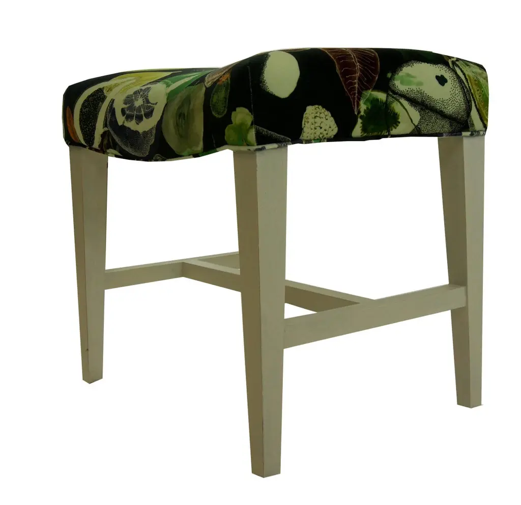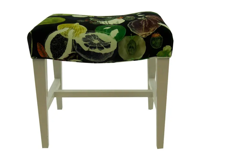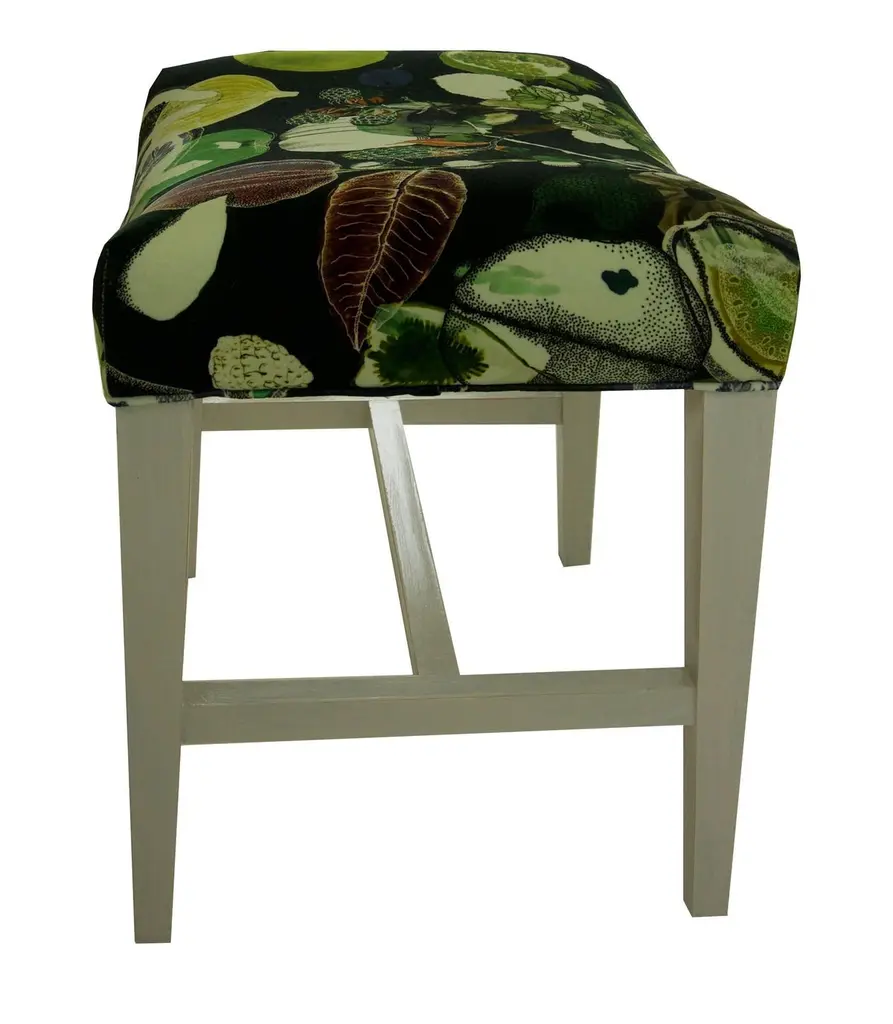 Small saddle bench upholstered in black patterned velvet with fruits. Tapered square wood legs with stretcher finished in grey oil paint. Fun and funky. Made by us in Norwalk CT.Overall: 22”W x 17”D x 21”HCOM Price: $1,195 eachCustomization may change the price.How We Work:Made to order by Connecticut-based furniture design and manufacturing company The Tailored Home. Submit your customization desires by 1stdibs messenger for a quote. After orders are placed our workshop manager creates a visual work order for your approval for quality assurance.We accept inspiration photos of pieces you like.2023 - Made to Order9-10 weeks