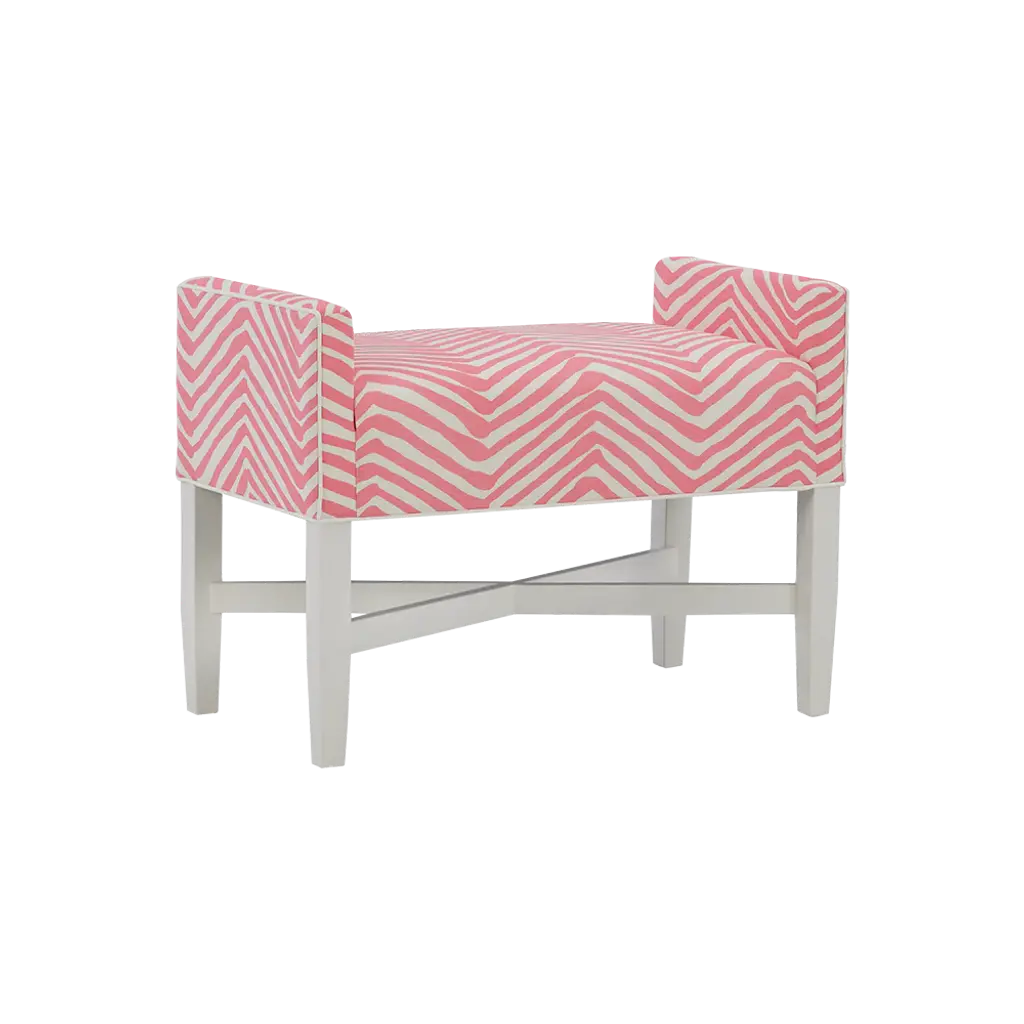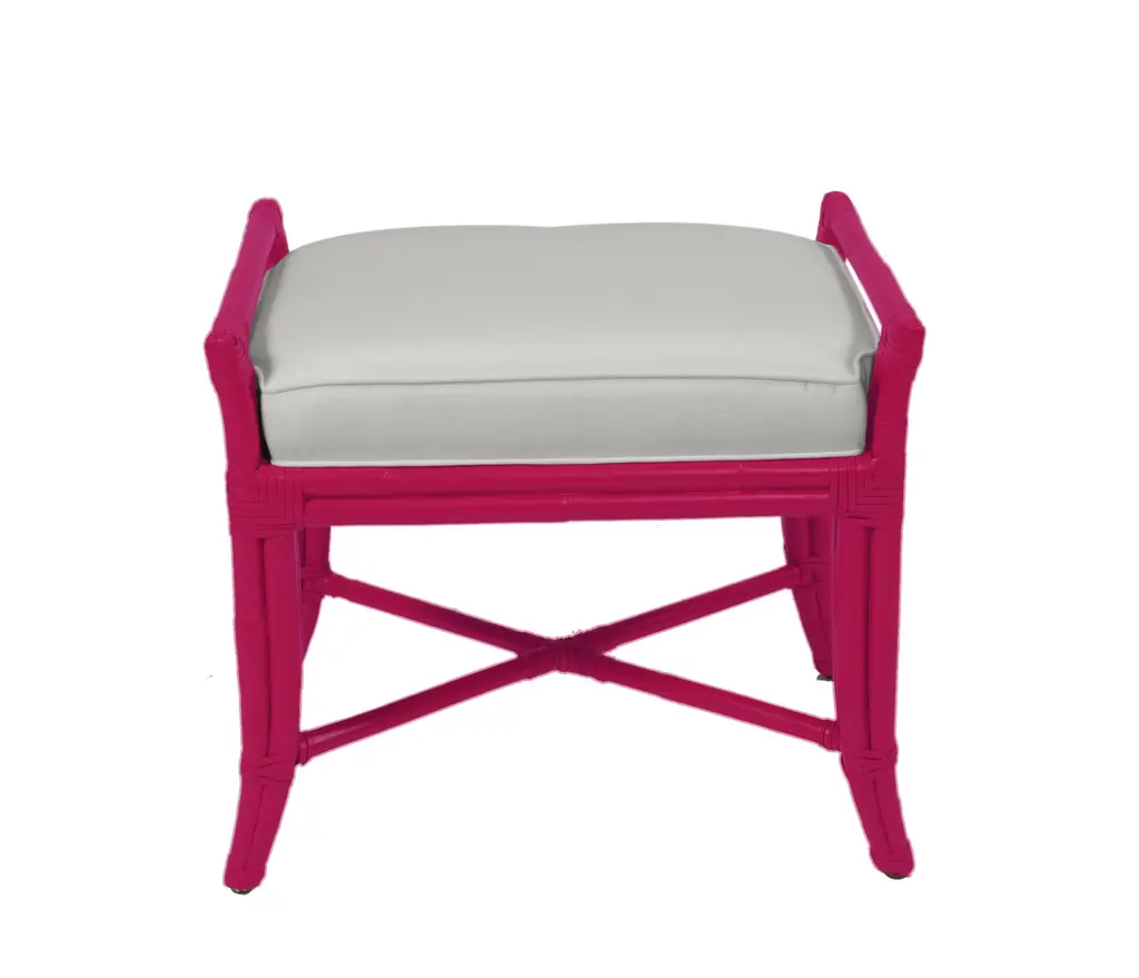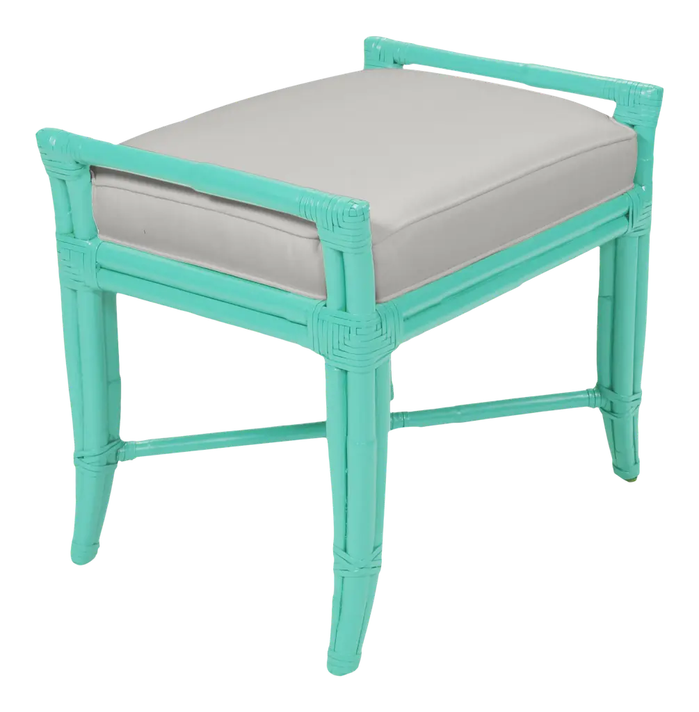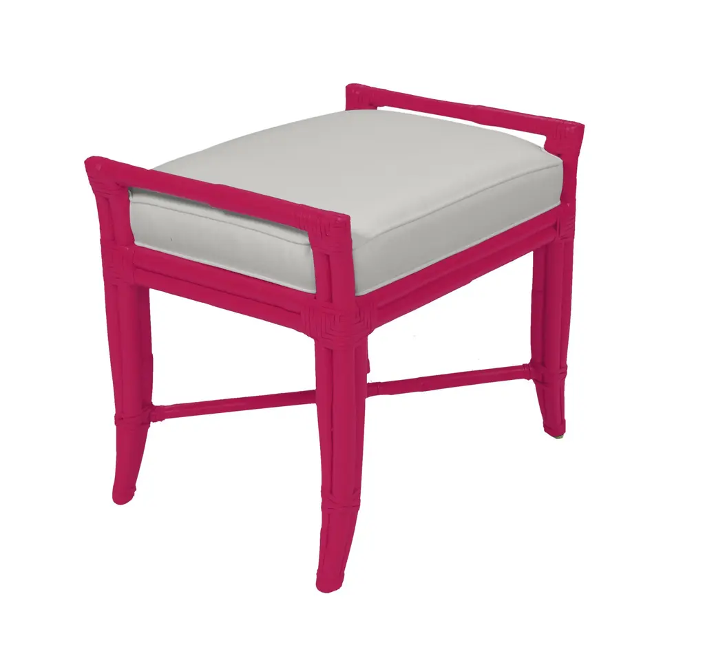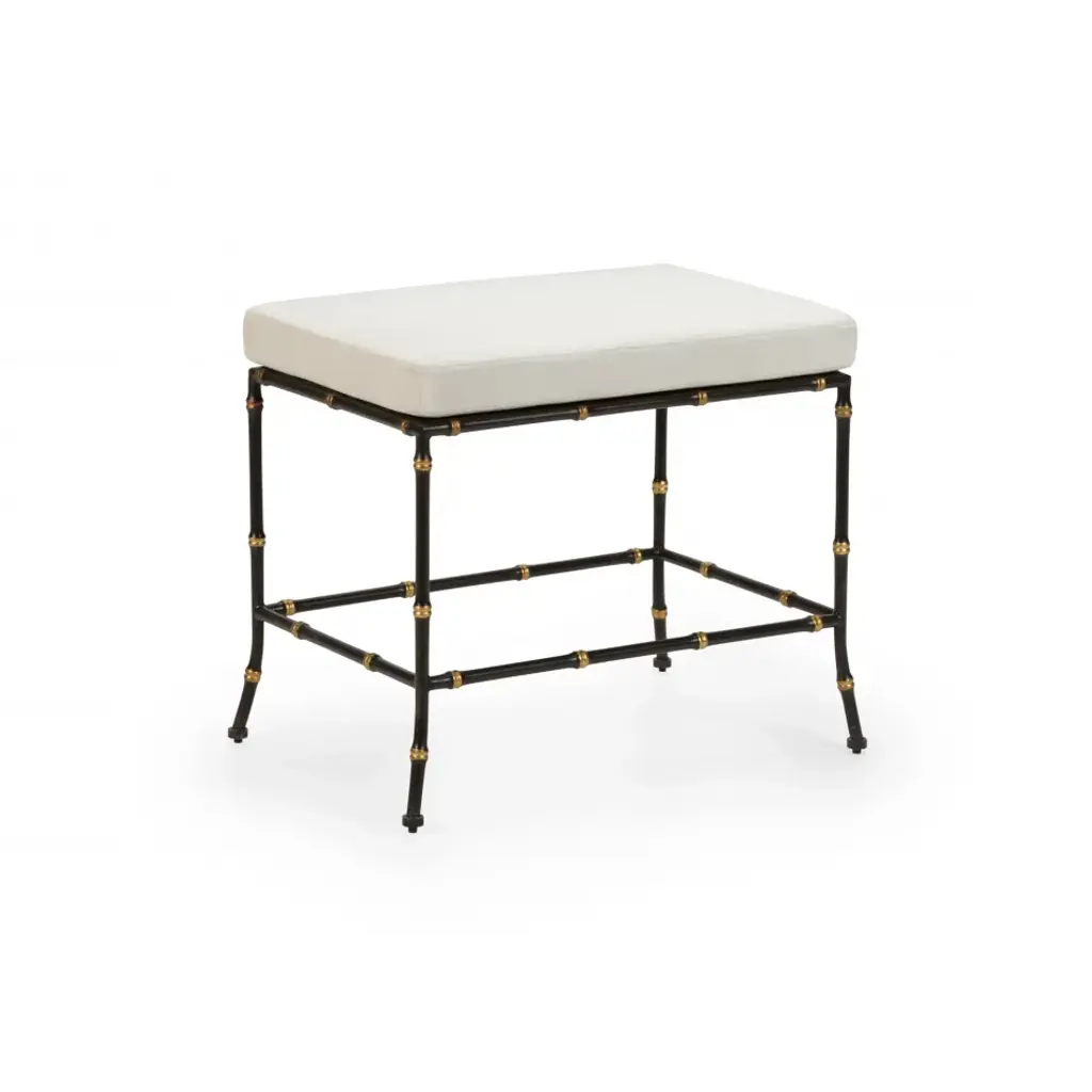 This beautifully designed bench from David Francis features a Rattan frame, rawhide-wrapped joints and a tight boxed seat upholstered in a soft white fabric. Each David Francis bench is hand-finished and upholstered in the USA. Please allow time for delivery.
