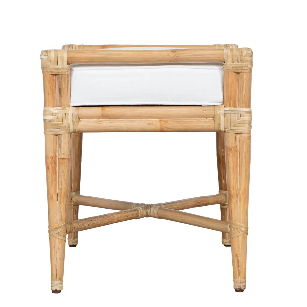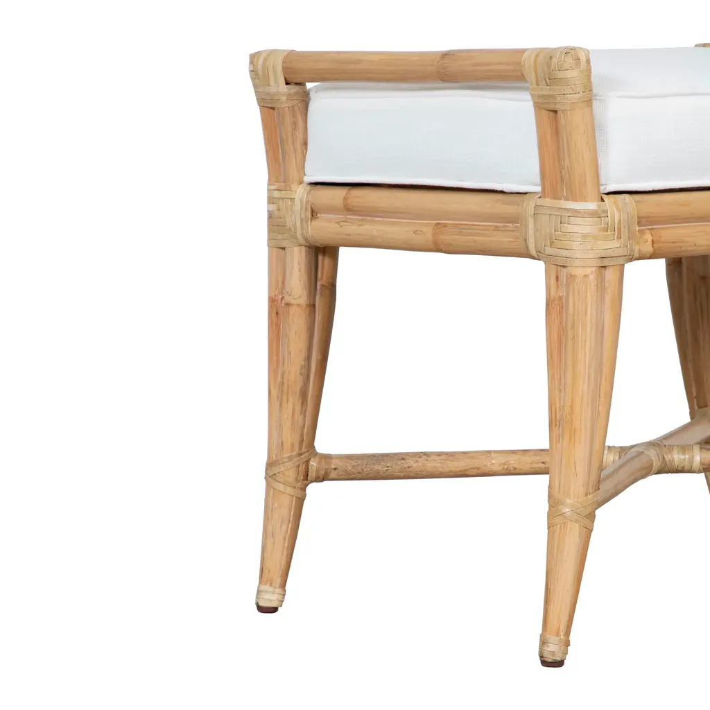 Elevate your space with the sleek sophistication of the Small Malacca Bench, a true blend of style and craftsmanship. Handcrafted from natural rattan and reinforced with leather-wrapped bindings for enhanced durability and stability, this bench exudes timeless elegance. The tightly boxed seat cushion is upholstered in InsideOut Performance Fabric in the color natural. Whether as a statement piece in your entryway or an elegant addition to your bedroom or living room, the Malacca Bench is designed to complement any space with refined charm and functionality. This piece is made to order, so please allow time for shipping.