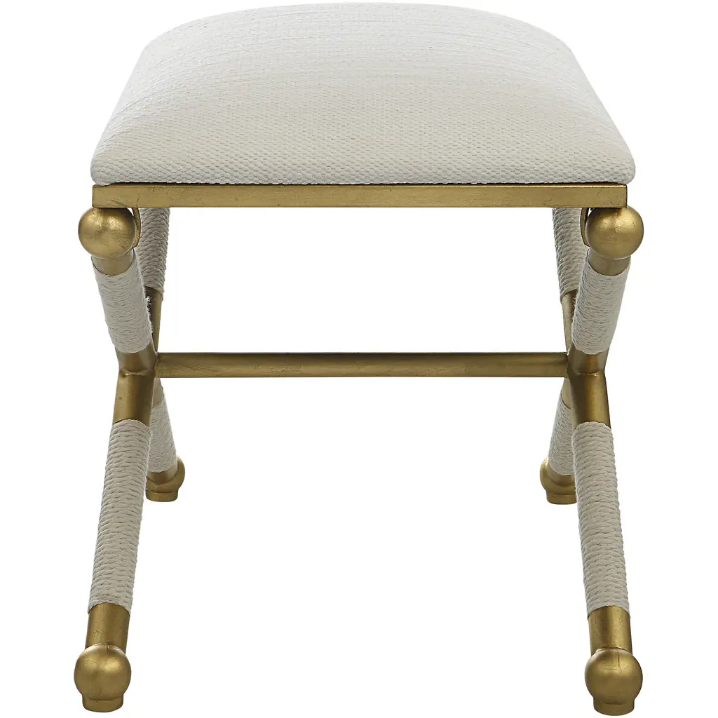 With Classic Simplicity, This Small Bench Features A Smooth Iron Base Finished In An Elegant Gold Leaf With Braided White Rope Detailing, Upholstered In A Crisp Textured White Polyester Fabric.