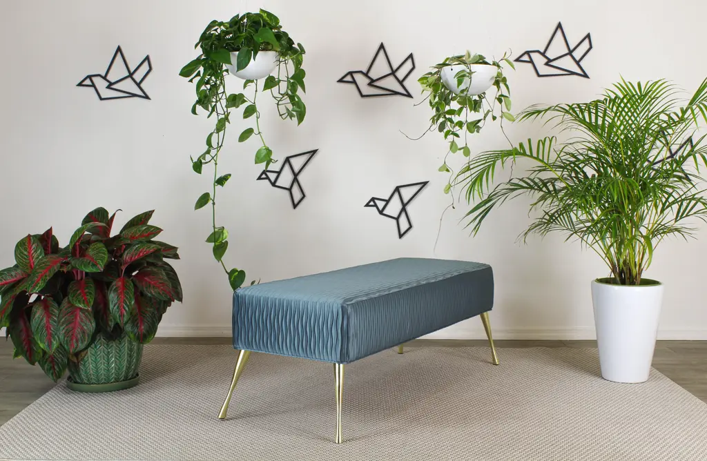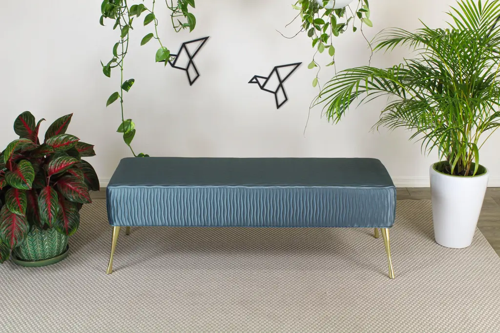 This sophisticated bench is upholstered in a luxurious pleaded satin finish textile and supported by four metal tapered legs. Clean and elegant style Dimension; 48"Length x 16"Depth x 17"Height If you have any question, please let us know, thanks