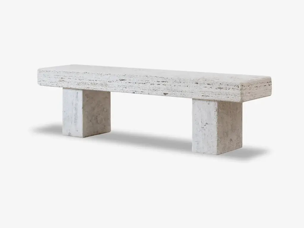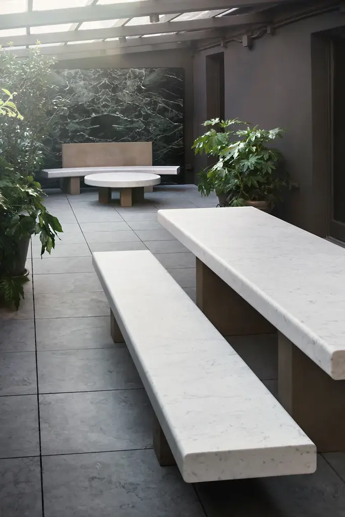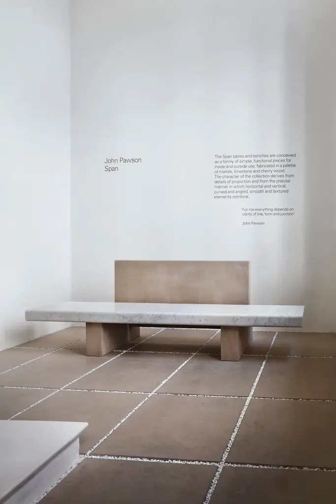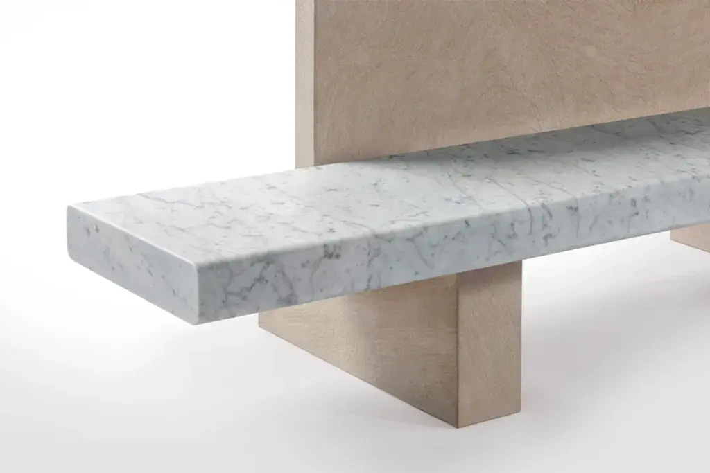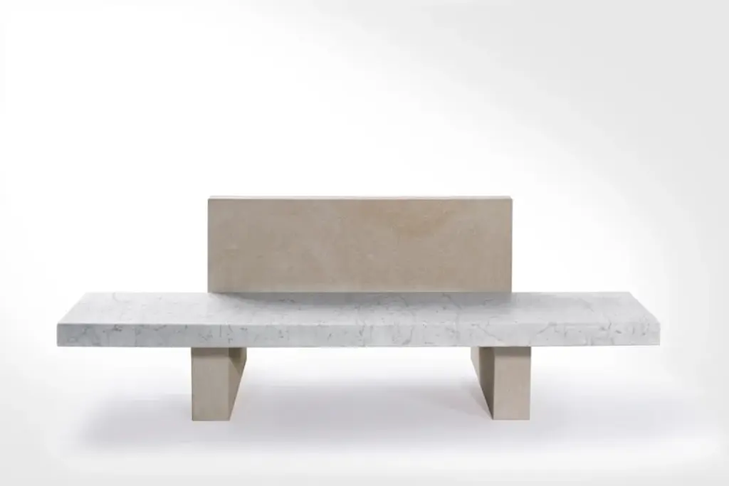 Named ‘Span’, the collection was conceived by Pawson and Salvatori as a family of simple and functional pieces with character deriving from the details of proportion and precise manner in which horizontal and vertical, curved and angled, smooth and textured elements combine. The benches and exterior table pair classic Bianco Carrara marble with the golden hues of Avana sandstone.