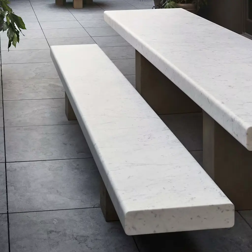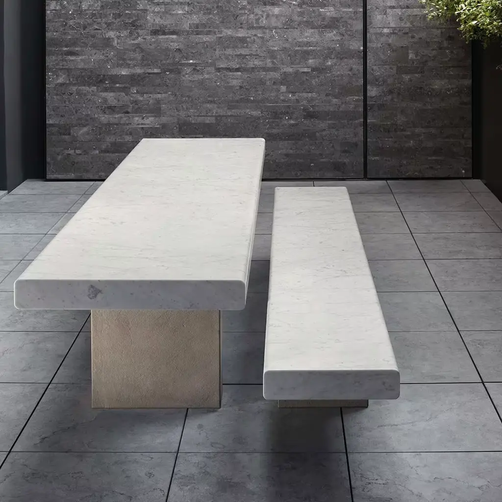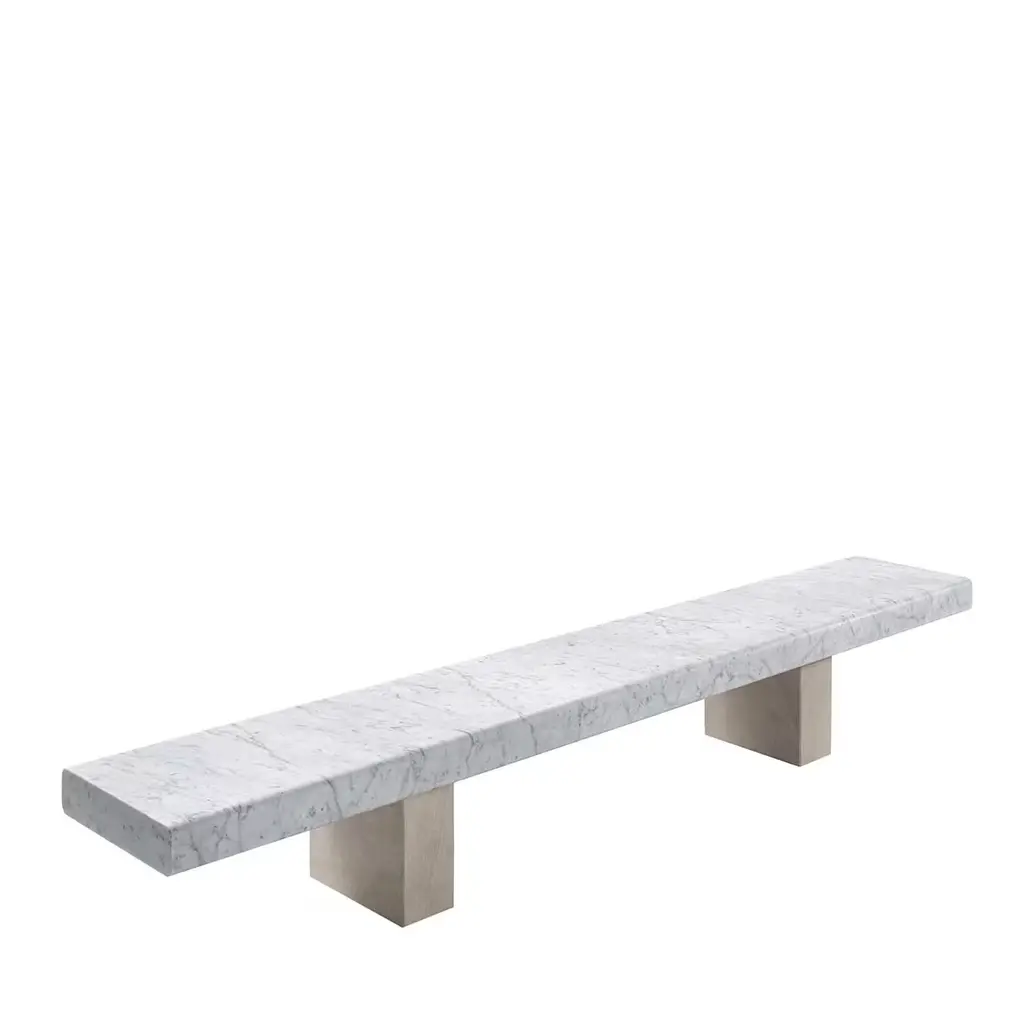 An impressive showcase of craftsmanship, this exceptional bench is crafted of white Carrara marble and Avana natural stone for a striking visual effect. Designed by John Pawson, the Span Outdoor is collection of simple and functional pieces characterized by bold proportions and combinations of horizontal and vertical elements. This bench features a long rectangular Carrara marble seat with two solid Avana legs that infuse a sense of solidity and balance. A true work of art, this piece is best showcased in a contemporary indoor and outdoor decor either as a seating or display surface.