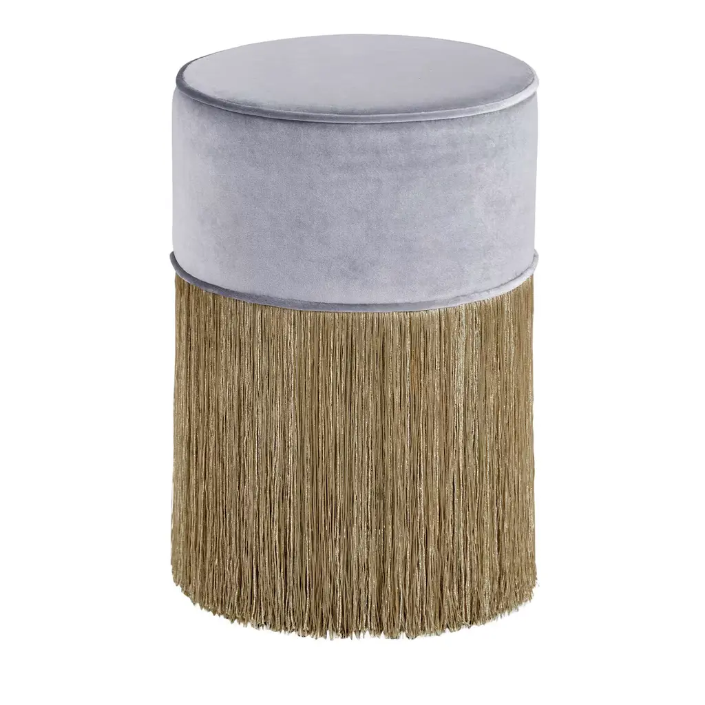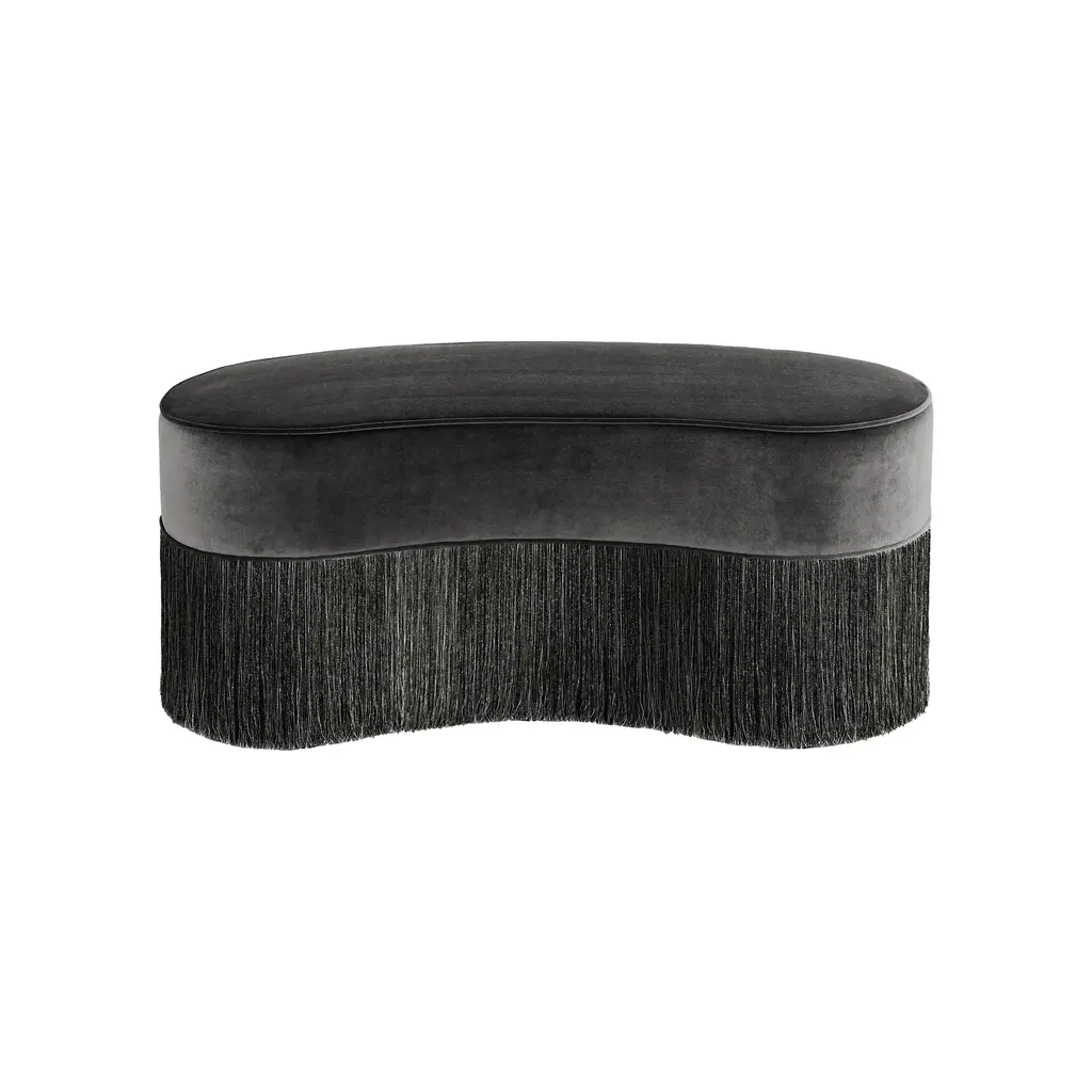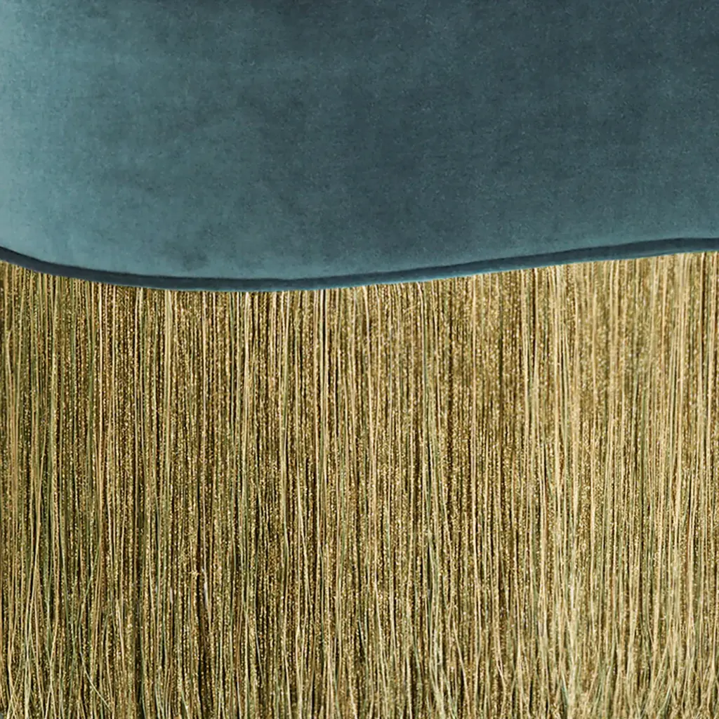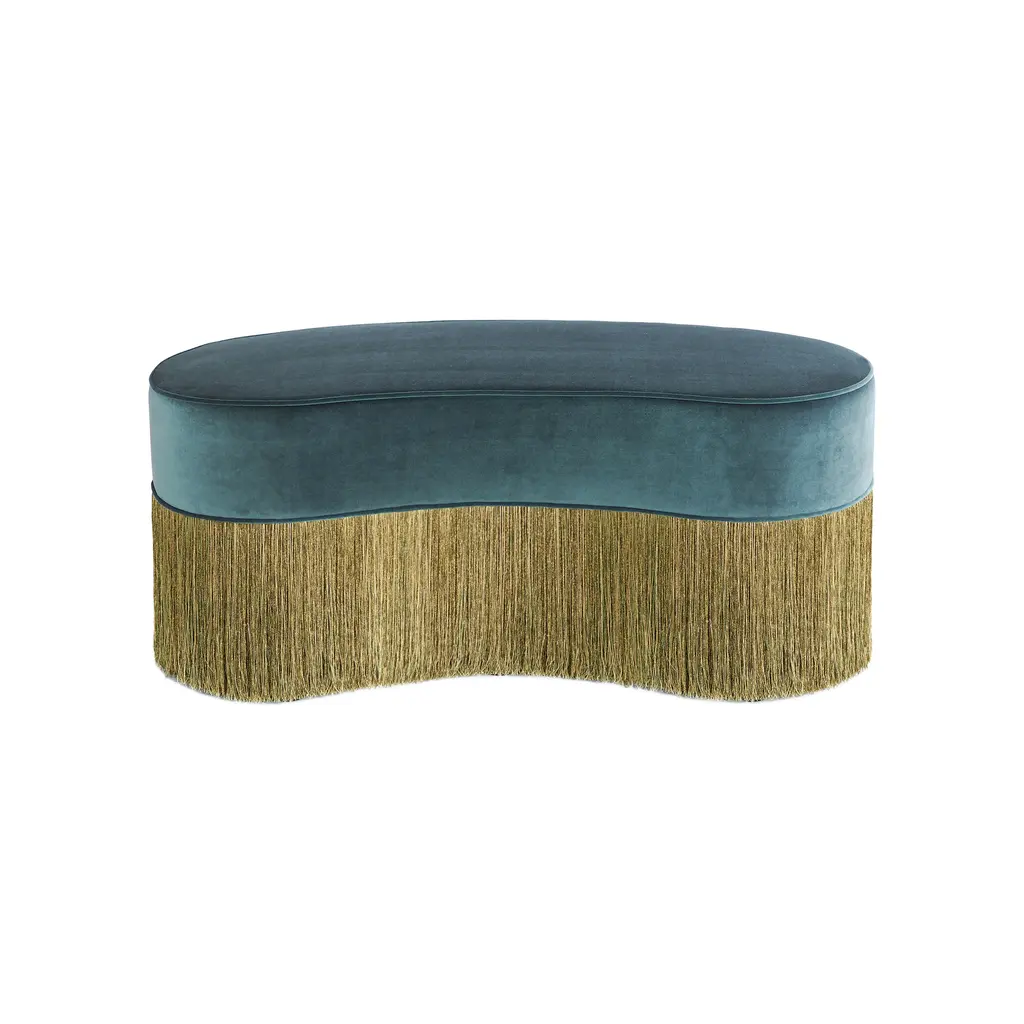 The Sparkle Bean Bench from Lorenza Bozzoli is a striking fusion of 1920s glamour and modern geometry. Its bean-shaped silhouette is upholstered in luxurious green-blue velvet, accented with shimmering green and gold lurex fringe that enhances its voluptuous form. Crafted on a solid beechwood frame, this ottoman serves as both a functional seat and a glamorous statement piece, perfect for elevating sophisticated interiors. Highlights