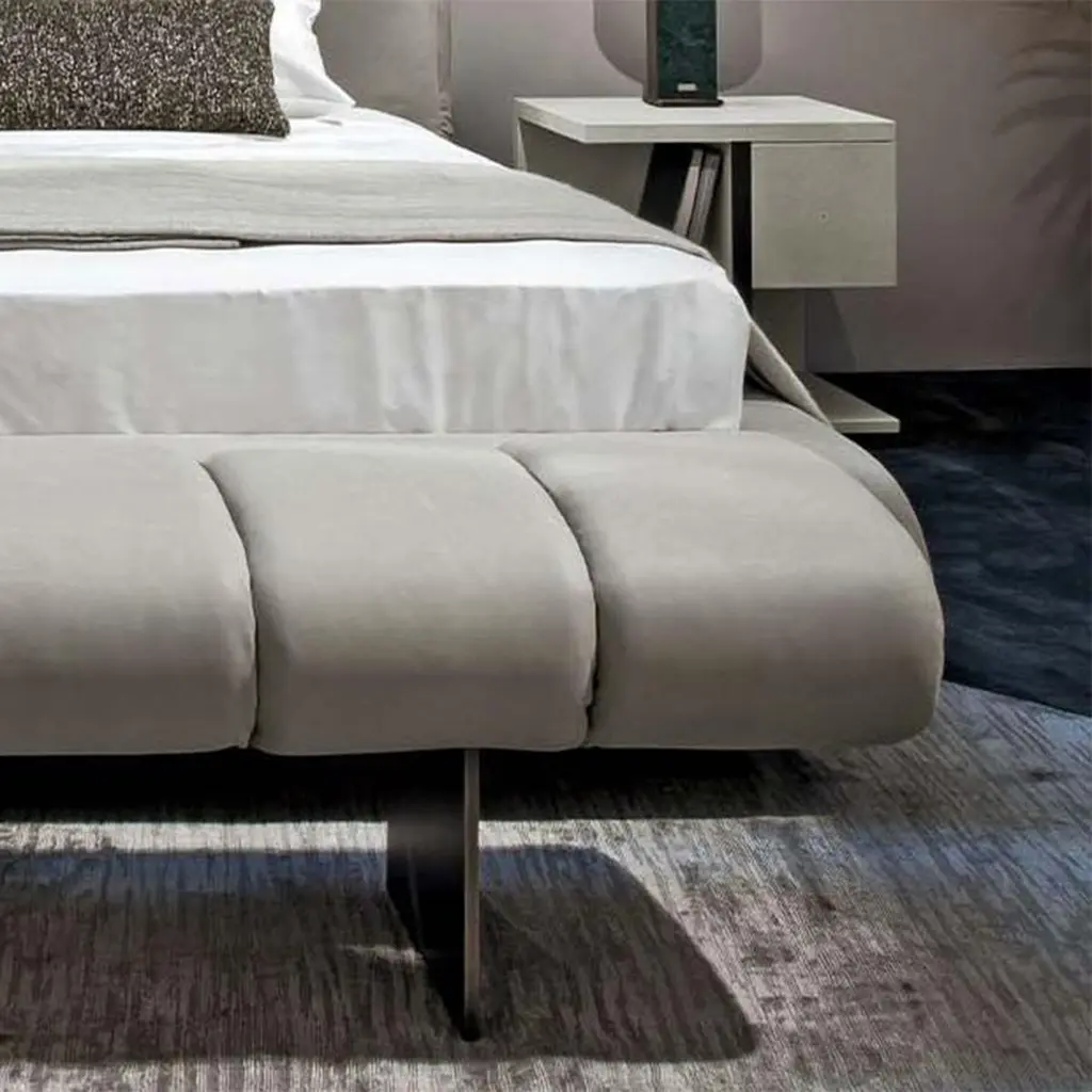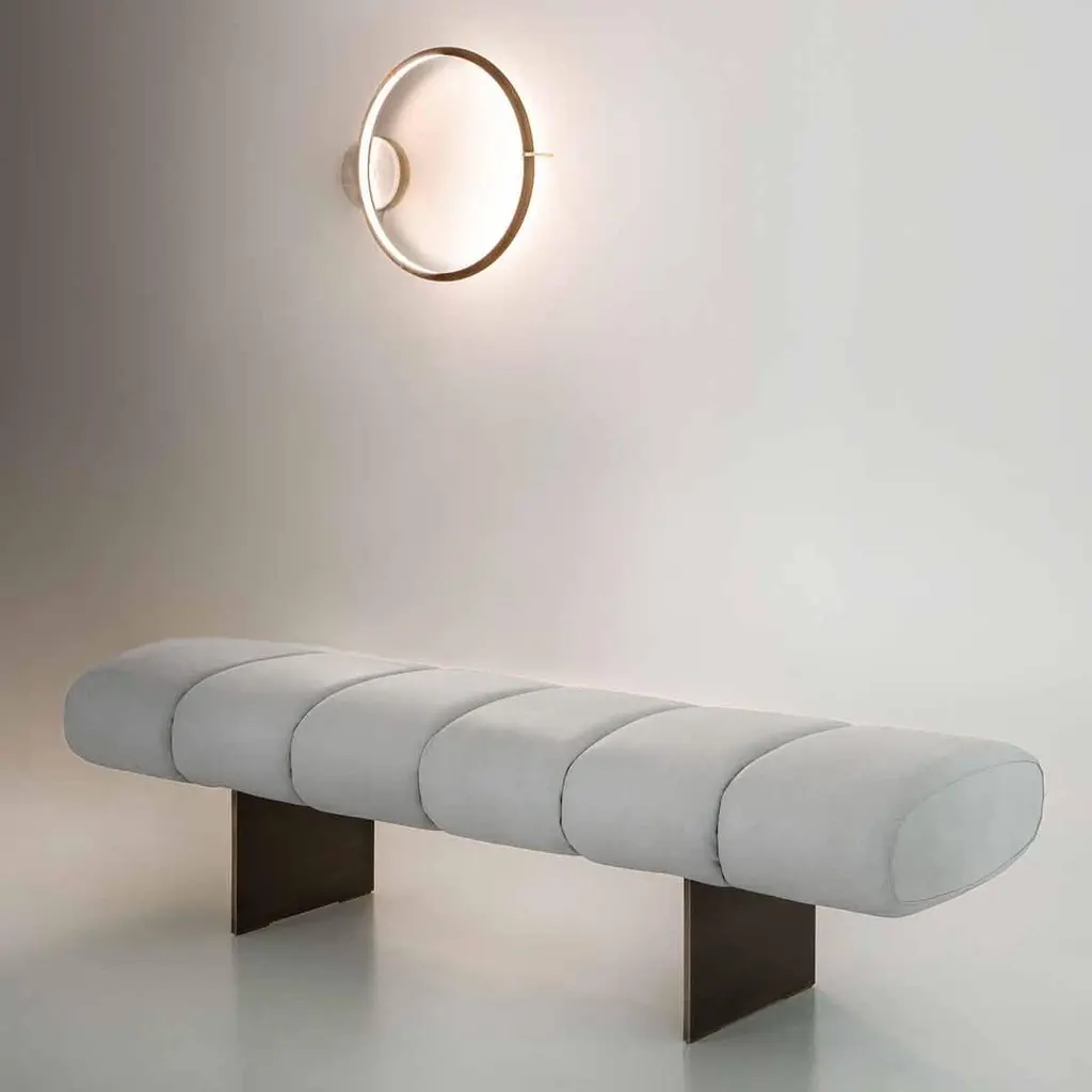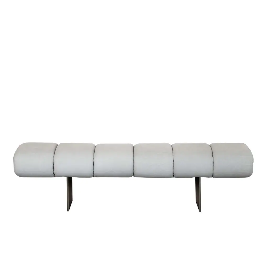 Bench Stax Leather with structure solid wood, upholstered and covered with light grey genuine leather. With 2 solid steel feet in bronzed finish.Also available on request with other leather colors.