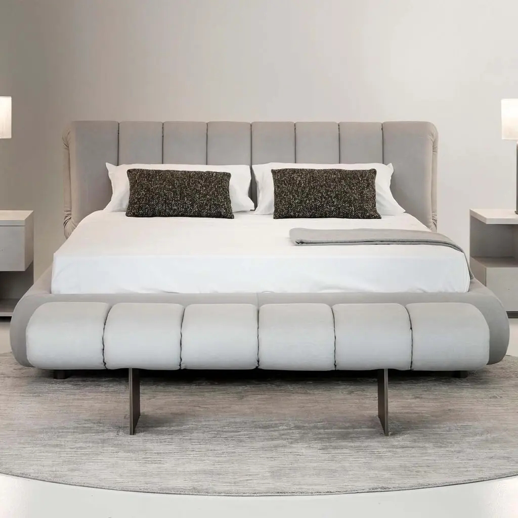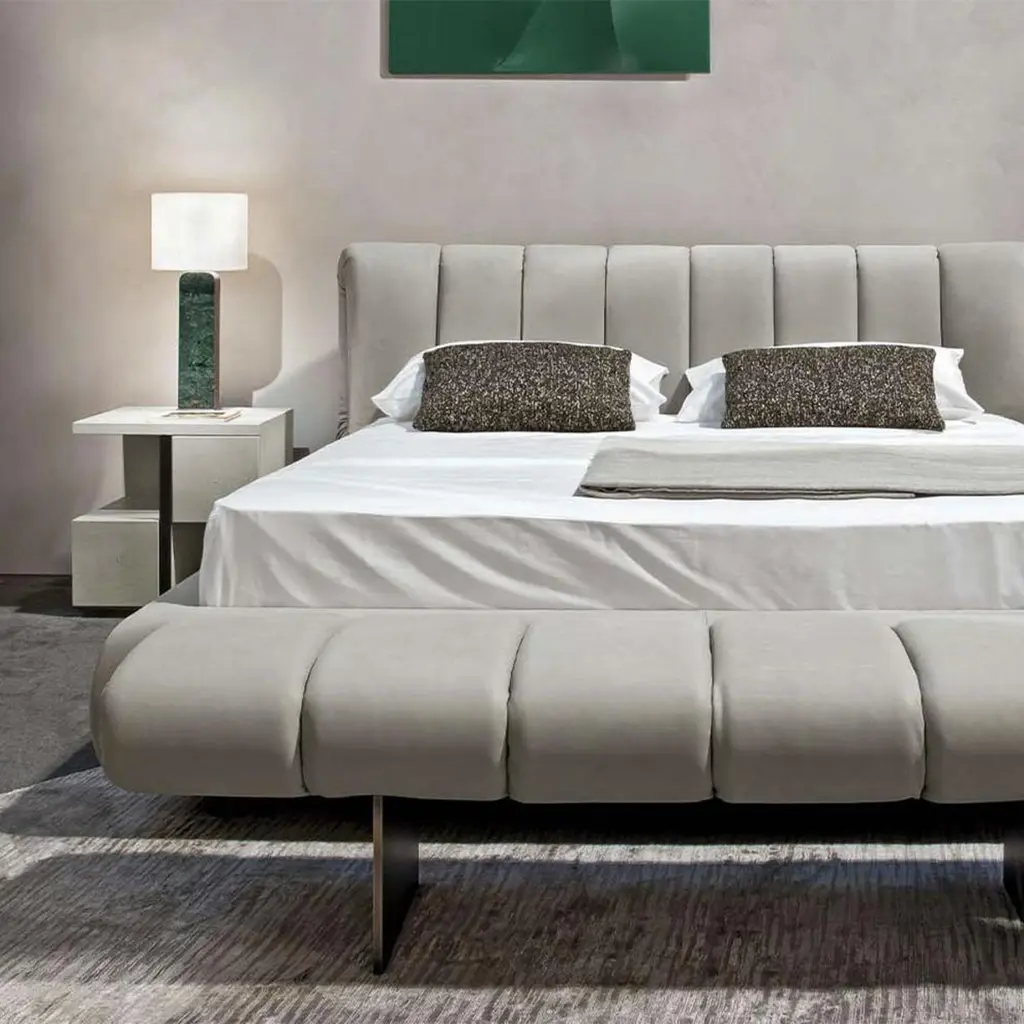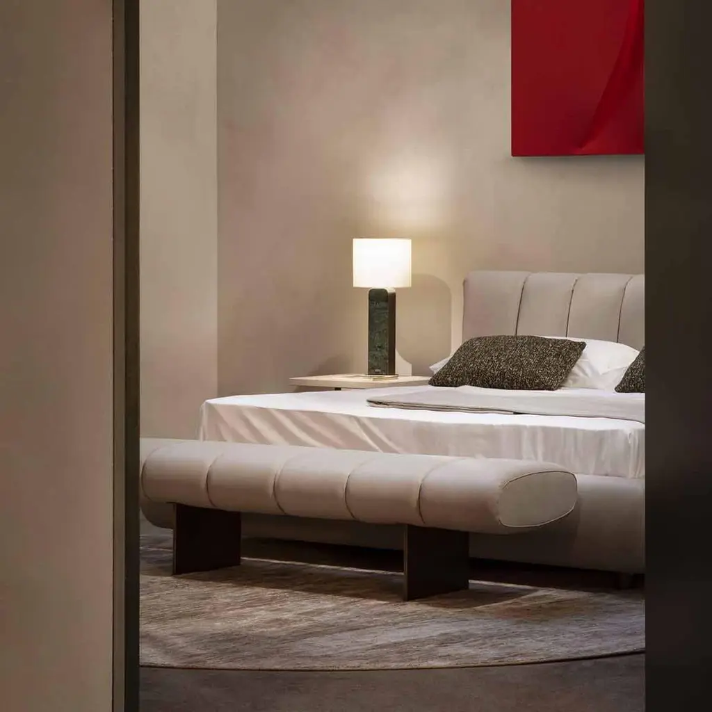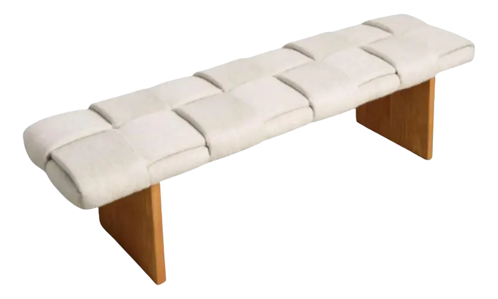 Bench Stax Leather with structure solid wood, upholstered and covered with light grey genuine leather. With 2 solid steel feet in bronzed finish.Also available on request with other leather colors.