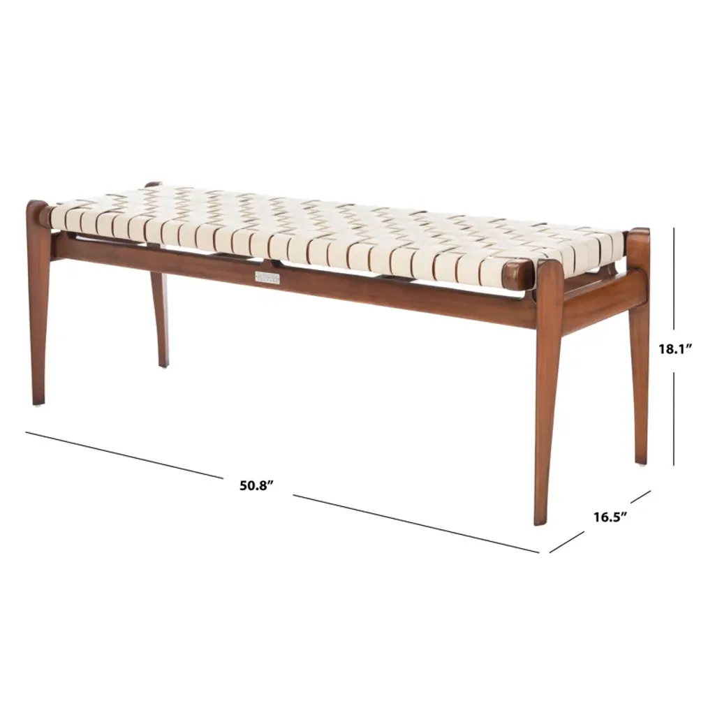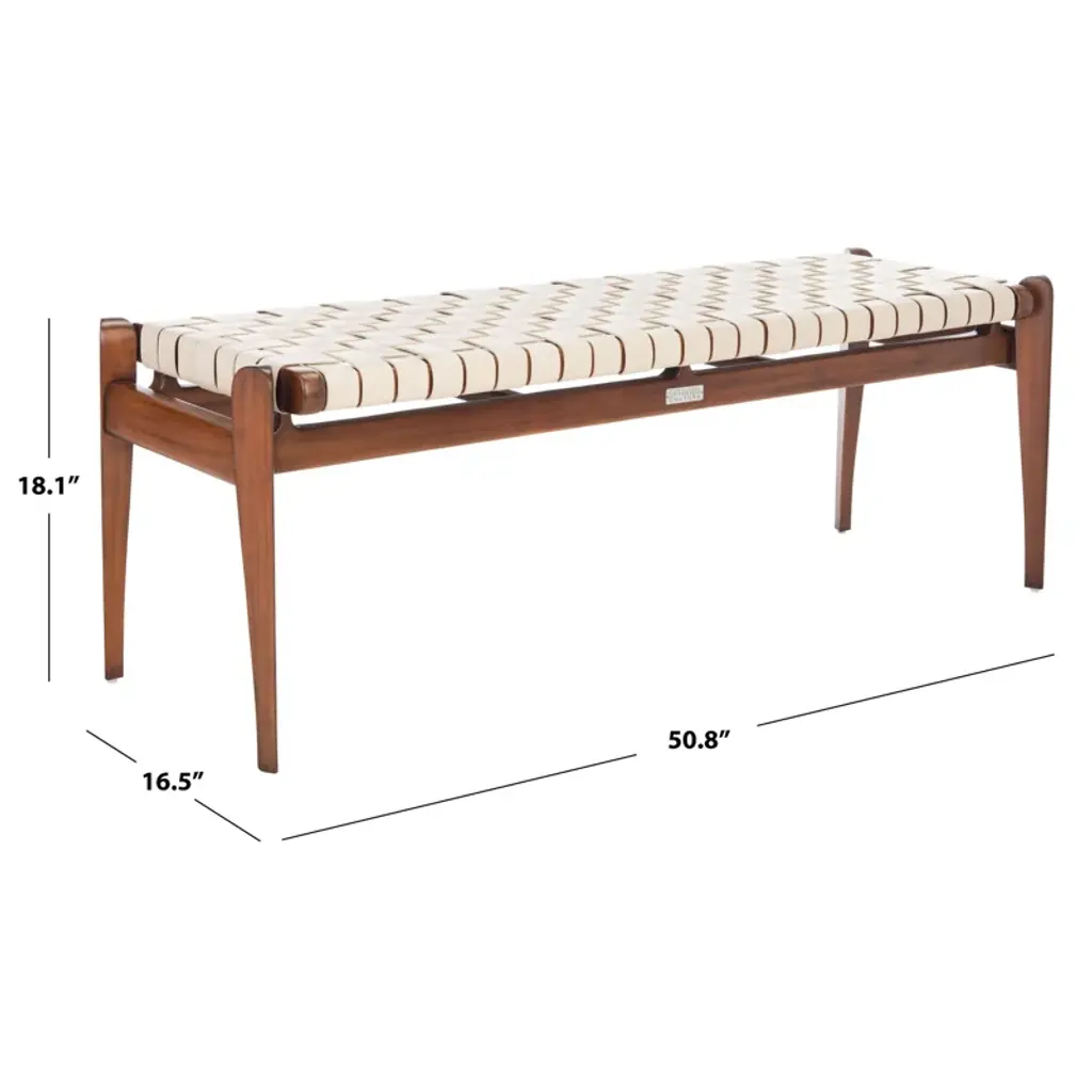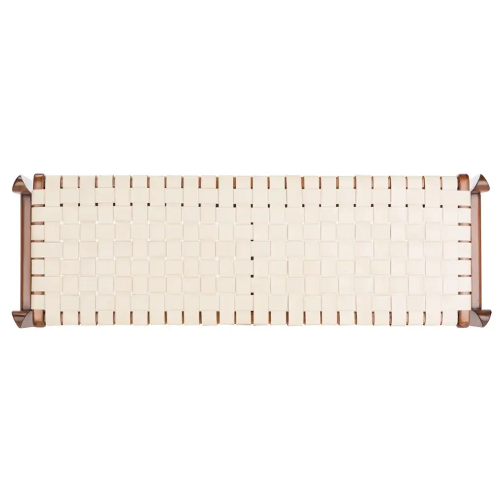 A versatile teak bench in the Scandanavian style features a woven seat in natural rush seagrass and integrated handles.