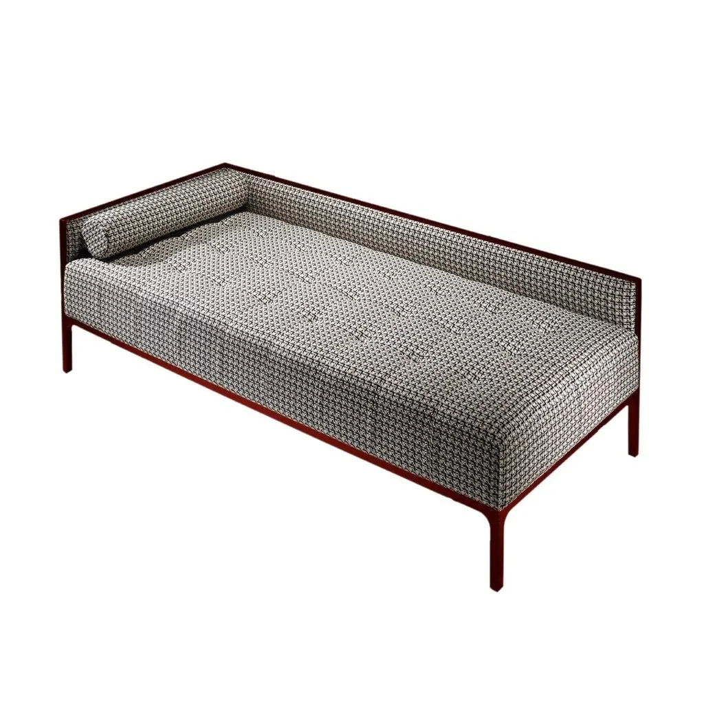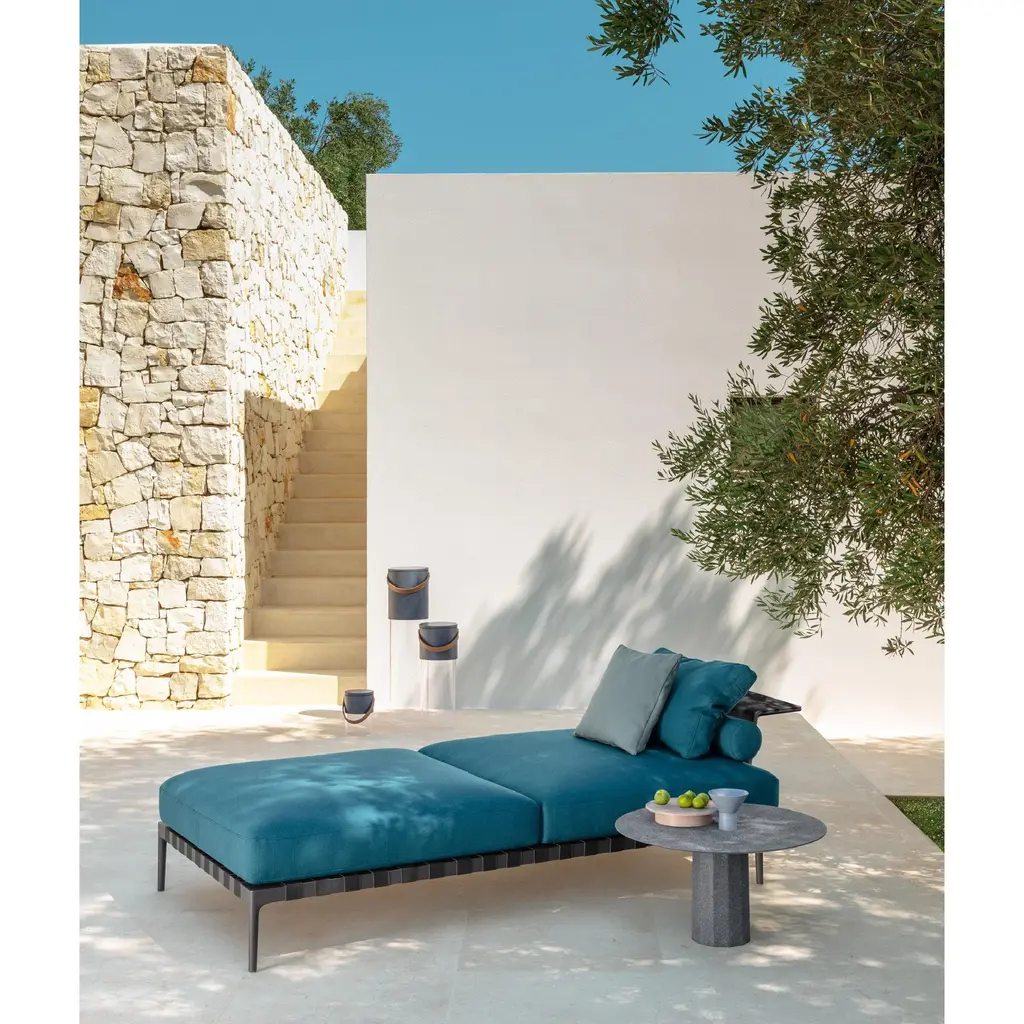 The Salinas bench has a refined design that evokes the atmosphere of the island, from which the whole collection draws inspiration. The colors of the sand and the sea of Salinas, in Ibiza, emphasize the fabrics, and give charm to the outdoor environment. Precious metal details are left visible by the strap that becomes a design element.