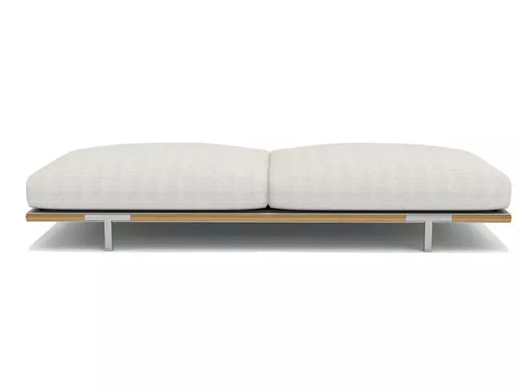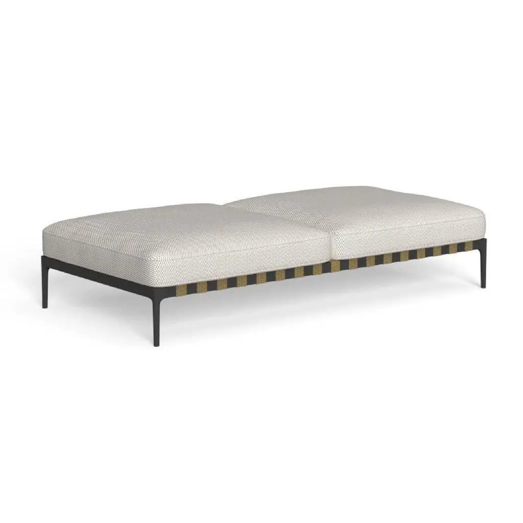 The Salinas bench has a refined design that evokes the atmosphere of the island, from which the whole collection draws inspiration. The colors of the sand and the sea of Salinas, in Ibiza, emphasize the fabrics, and give charm to the outdoor environment. Precious metal details are left visible by the strap that becomes a design element.