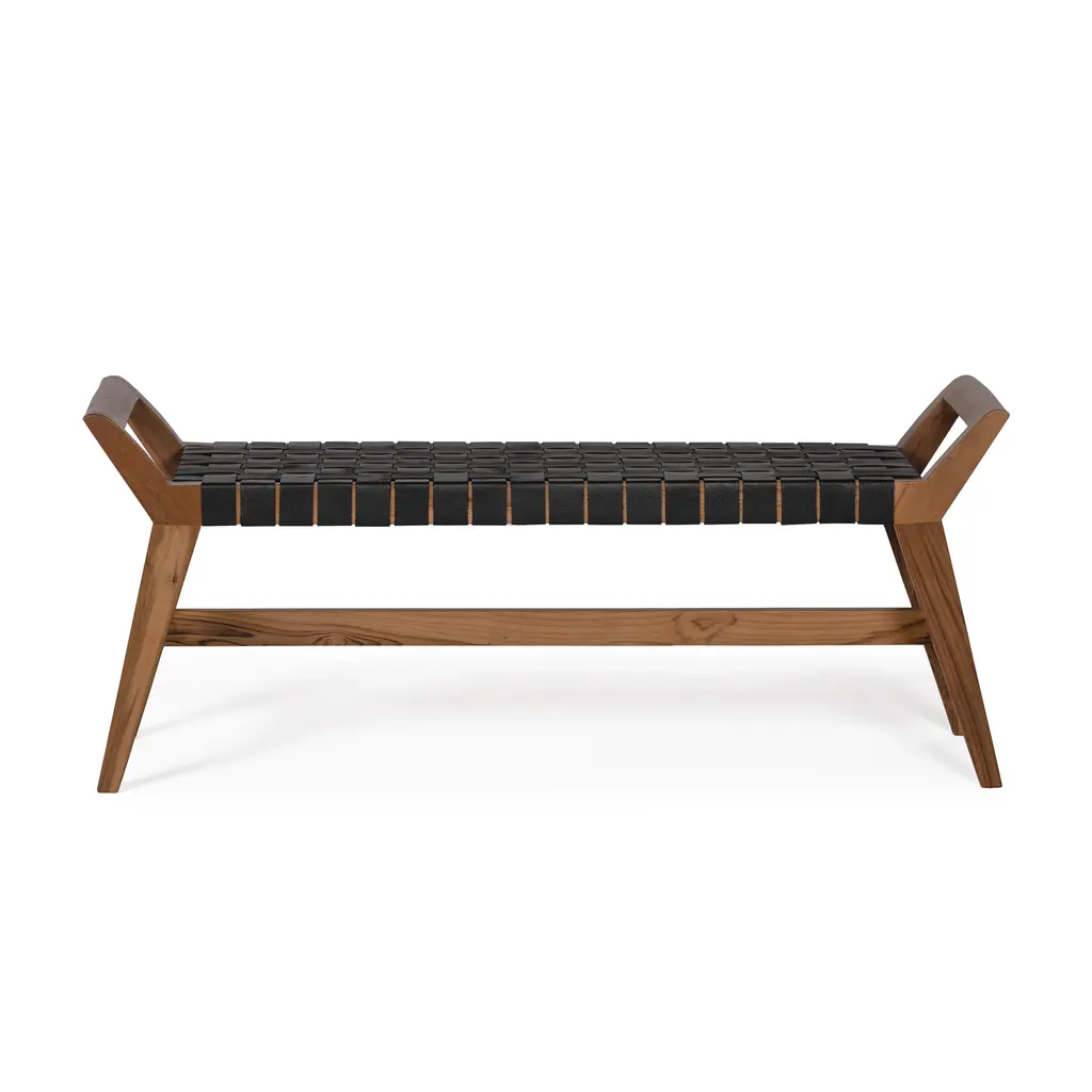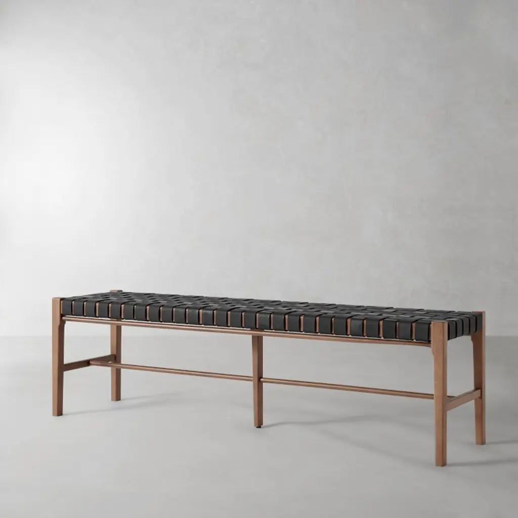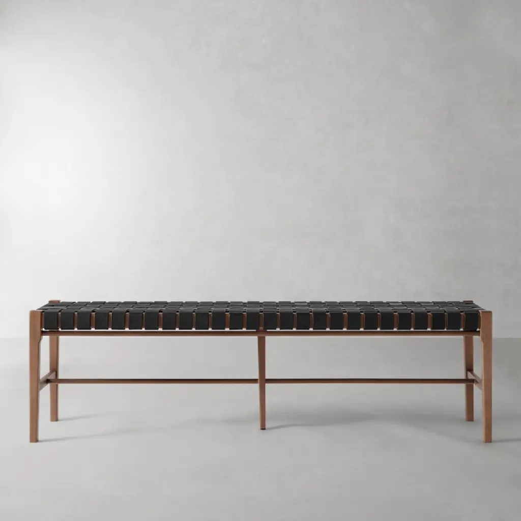 Our classic woven-strap bench pairs midcentury lines with thick leather weaves. The smooth, rustic finish of solid, kiln-dried beechwood complements the rich leather seat.