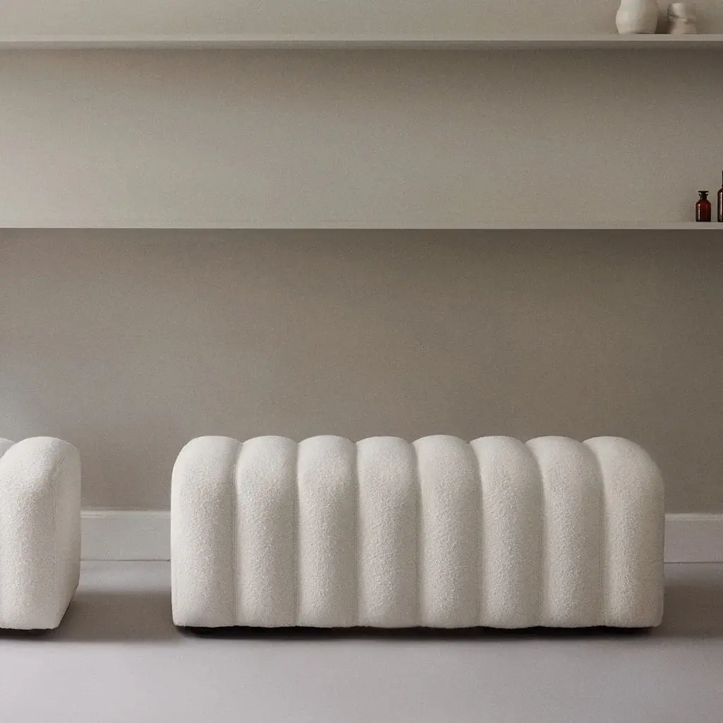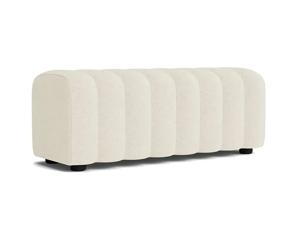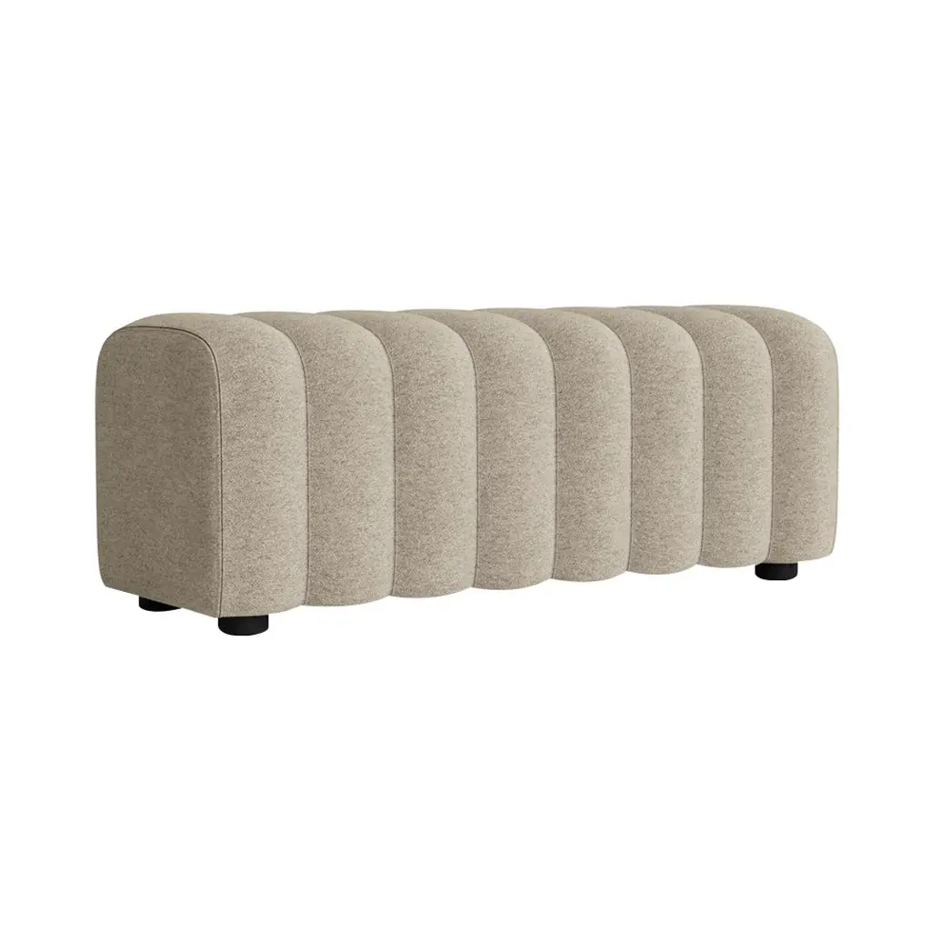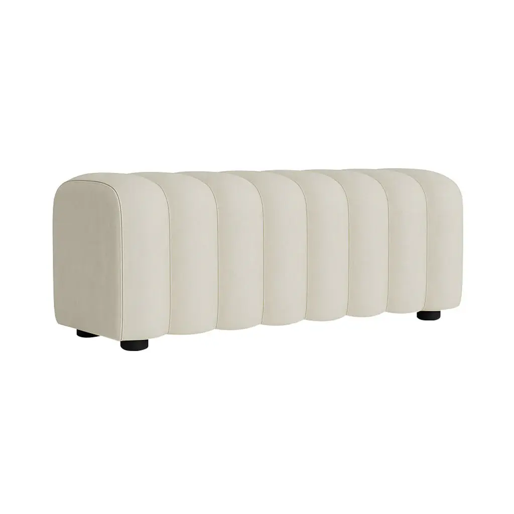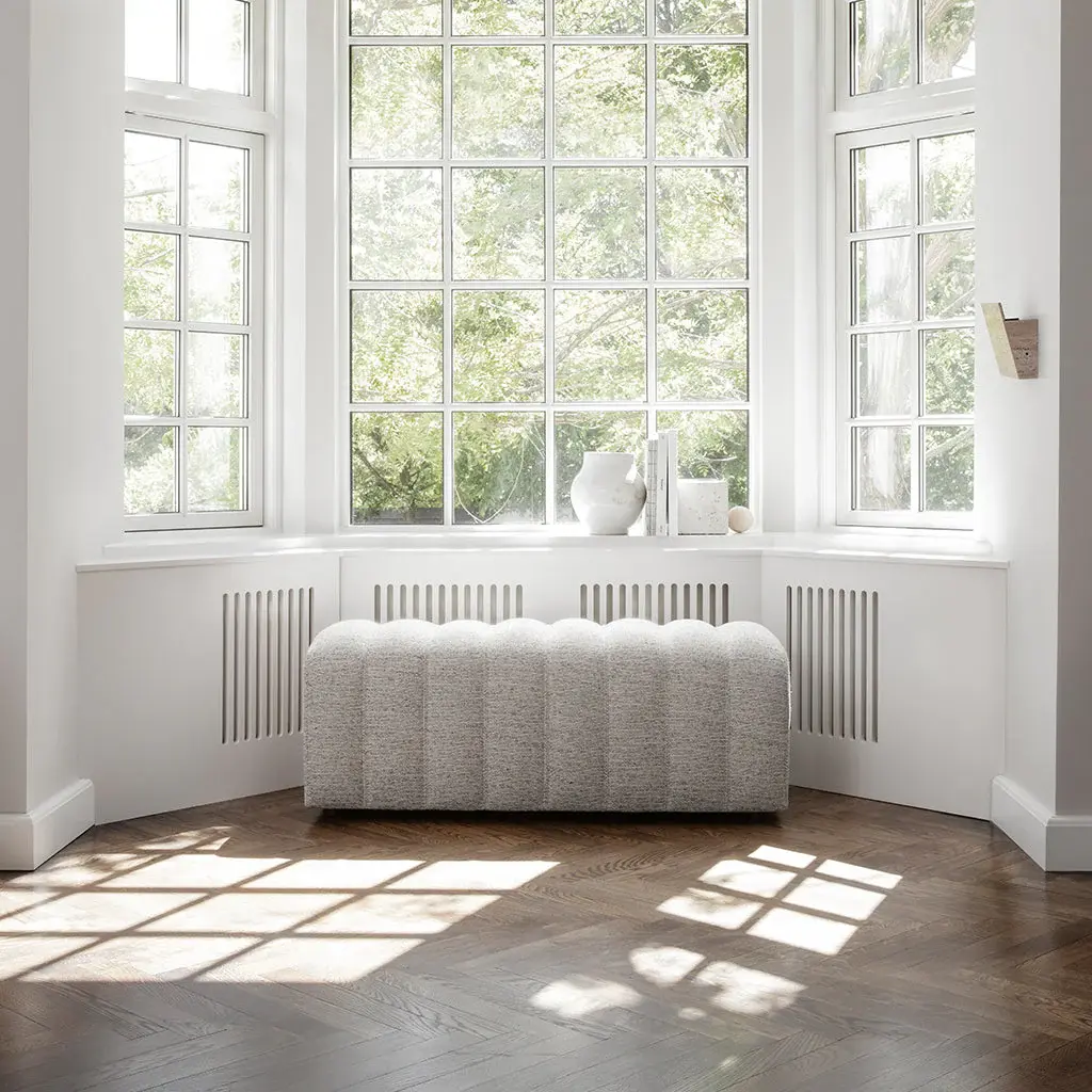 The Studio Bench, influenced by 1970s sunken lounge sofas, features a distinct fluted upholstery design, giving it a ribbed texture that stands out. Its low-profile, rectangular seat rests on a minimalistic frame. With no backrest, the Studio Bench can be used as standalone seating or integrated into modular arrangements for flexible use. Available in a luxe range of leather and fabric upholstery.