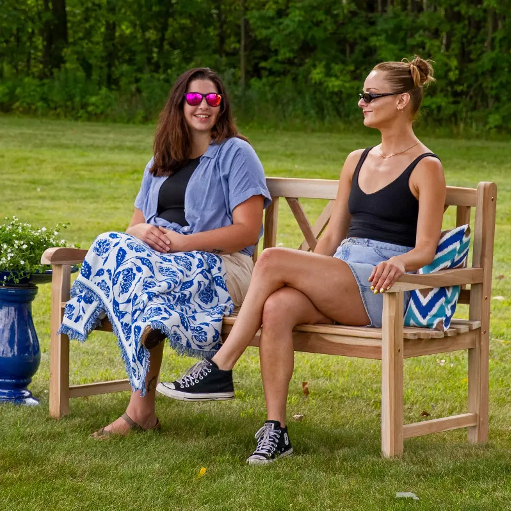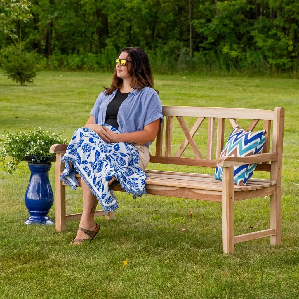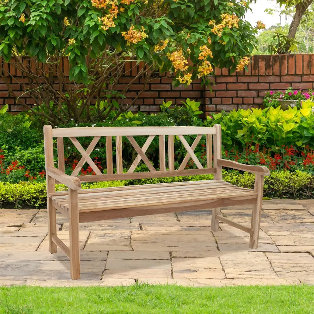 This classic teak outdoor wooden bench blends timeless design with dependable craftsmanship to create a charming and functional addition to any outdoor space. The outdoor park bench offers a generous yet space-efficient footprint that comfortably seats 2 adults. Crafted from sustainably sourced teak wood, it features a smooth finish that highlights the wood’s natural beauty and rich golden tones. Teak’s durability and resistance to weather make it an excellent choice for outdoor use, whether placed on a patio, nestled in a garden, or set on a front porch. The design adds decorative appeal while maintaining a clean, classic silhouette. Galvanized hardware enhances the structure’s strength and ensures long-lasting stability, even in changing weather conditions. With a 675 lb weight capacity, this bench delivers both comfort and reliability, making it a standout piece among benches for outside spaces, whether in use or simply enhancing the scenery.• GENEROUS 2-PERSON SEATING: Measuring 59" W x 24.5" D x 36" H and weighing 53.8 lbs, this classic outdoor patio bench offers ample space for 2 adults while maintaining a compact footprint suited to gardens, patios, porches, and smaller outdoor areas. The seat measures 55" W x 19.75" D x 17.75" H with an 18" H seat back.• TIMELESS TEAK CONSTRUCTION: Crafted from finely sanded, sustainably sourced teak wood, this wooden patio bench showcases natural grain patterns and warm tones that bring refined elegance to any yard or landscape.• BUILT FOR STRENGTH AND STABILITY: Designed with a 675 lb weight capacity and reinforced with galvanized hardware, this patio bench delivers dependable support and long-lasting performance in outdoor environments.• DECORATIVE AND FUNCTIONAL APPEAL: Featuring a cross-back design and clean lines, this decorative front porch bench enhances visual interest while serving as a comfortable and durable seating solution for outdoor living spaces.• WORRY-FREE PURCHASING: Sunnydaze Decor backs its products with a 1-year manufacturer's warranty.