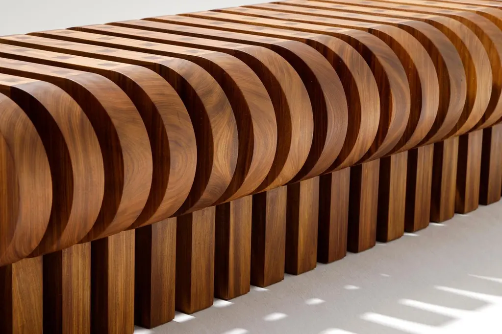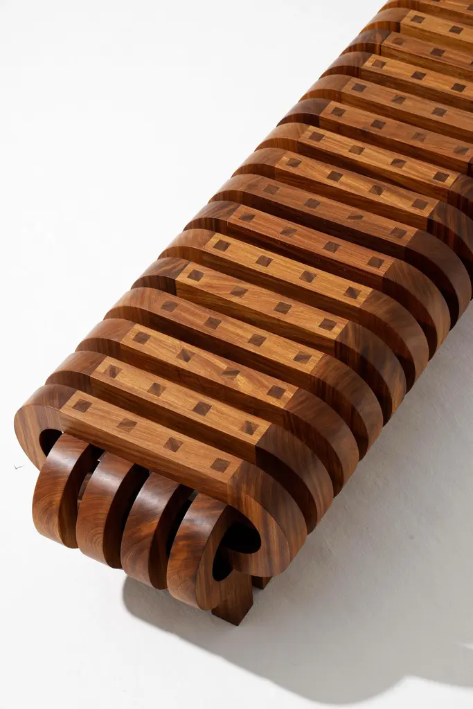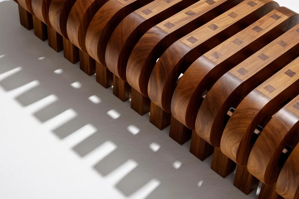 Tamga Afromasia Bench by Tolga SencerDimensions: D 55.5 x W 172.5 x H 40 cm.Materials: Afromosia wood.Available in different wood options (massive american walnut, massive wenge, oak, afromosia or black lacquer with stainless steel details). Please contact us.Tamga Collection is based on a balance of filled and empty spaces composed by the repetition of a linear form in a harmonious rhythm. In this harmonious rhythm, change of dimensions leads to variations of the product. Rotation of this rhythm on a lower layer transforms into a powerful massive effect. Sculpturesque posture of Tamga shows how precise application of basic design principles result in strong, consistent and groundbreaking products. The name “Tamga” comes from the side view resembling the old Turkish tamga symbols.Tolga SencerA turkish interior and product designer, sencer creates furniture collections that ‘feel good’ and reflect his authentic, idiosyncratic aesthetic vocabulary. His process resists the reactionary drive towards instantaneous solutions in modern life, producing designs that take time to reveal themselves. With references to turkish antiquity, he designs linear, sculptural forms that evoke harmony. Combining stark modernity with nature and nostalgia, sencer’s furniture is a unique expression of his personal perspective and is rooted in artisanal production techniques.After graduating from bilkent university with a degree in interior architecture and environmental design, sencer moved to istanbul, where he worked in turkey’s leading architectural firms as an interior designer and project director before founding his own design studio.