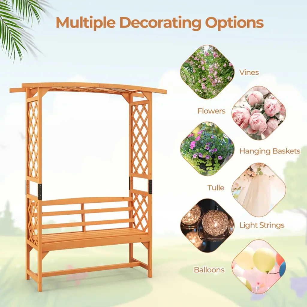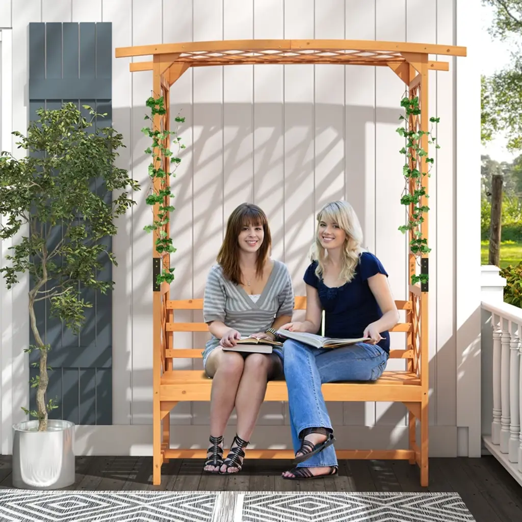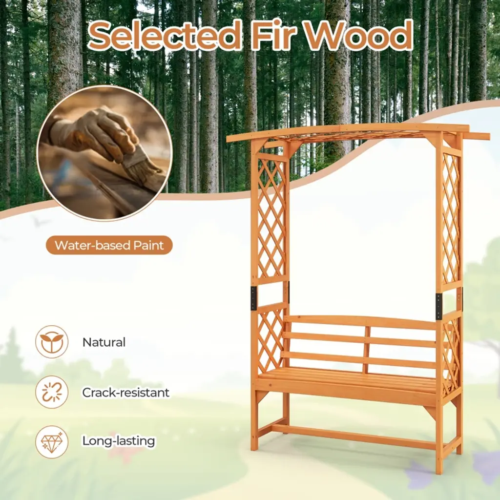Create a relaxing and enchanting space with the wood garden arch! The garden archway features an integrated 2-person bench, offering a convenient relaxing spot for you to embrace the nature. Equipped with 4 side climbing trellises, the arbor provides additional space for climbing plants to grow upward, thus bring vitality to your garden, backyard or lawn. Moreover, the arched roof and extended bars not only add a touch of elegance to the arbor but also offer opportunities for customization. You can decorate the arbor with balloons, light strings, or tulle to create a personalized garden retreat. Crafted from natural fir wood and coated with water-based paint, the pergola trellis is not only visually appealing but also long-lasting in outdoors. Features3-in-1 design makes it a smart choice for small gardens or lawnsEquipped with an arch roof for decorations4 large diamond-shaped climbing trellises promote climbing plants to grow2-seat bench with ergonomic tilted backrest offers relaxationSelected fir wood is natural, crack-resistant and long-lastingSpecifications: Color: Yellow Material: Fir Wood Product Dimensions: 63" x 20" x 79" (W x D x H) Bench Size: 49" x 18" x 32.5" (L x W x H) Seat Size: 49" x 14" (L x W) Seat Height: 17" Weight Capacity: 660 lbs Net Weight: 34.5 lbs Package Includes: 1 x Garden Bench Arbor 1 x User’s Manual