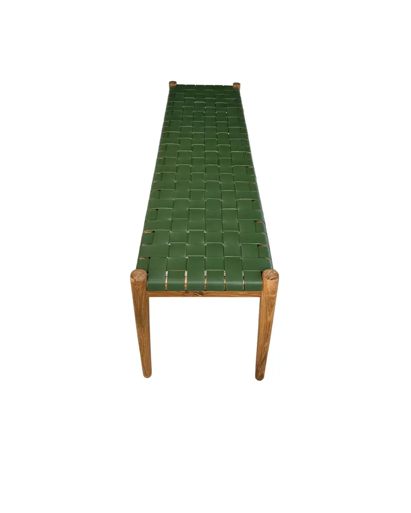 A hand-crafted teak framed & woven leather strap bench. These benches are crafted by local artisans using a wood joinery technique without the use of nails. They feature a subtle wood texture and are robust and sturdy.