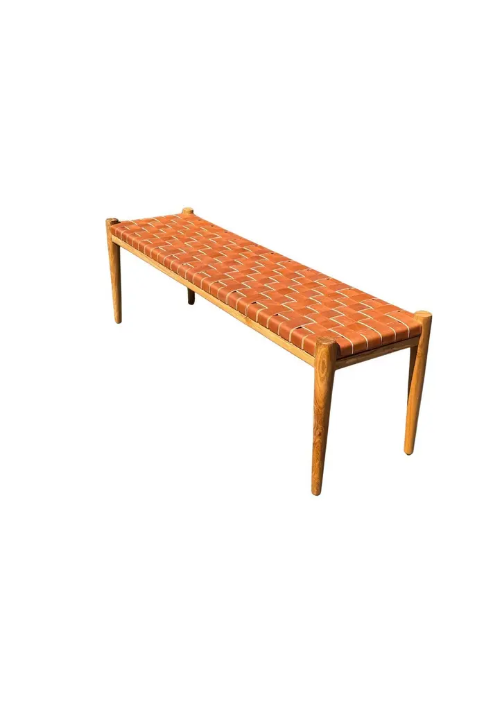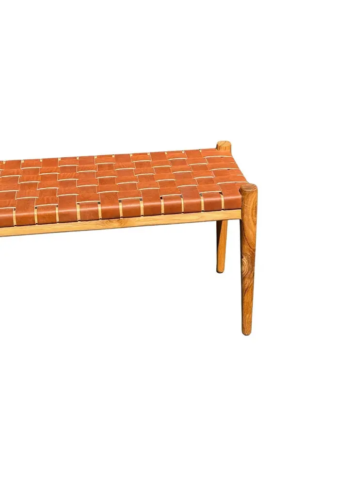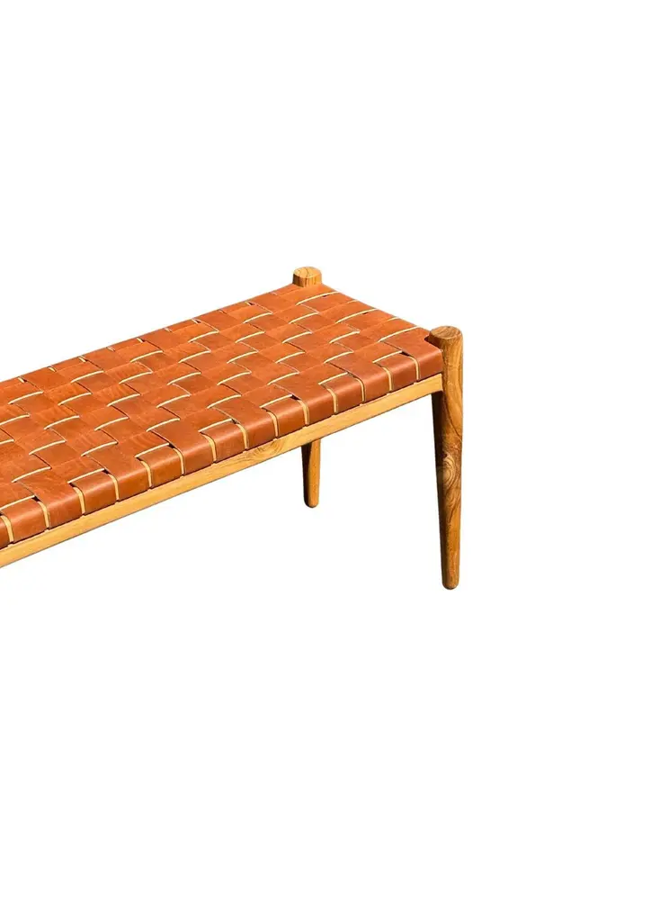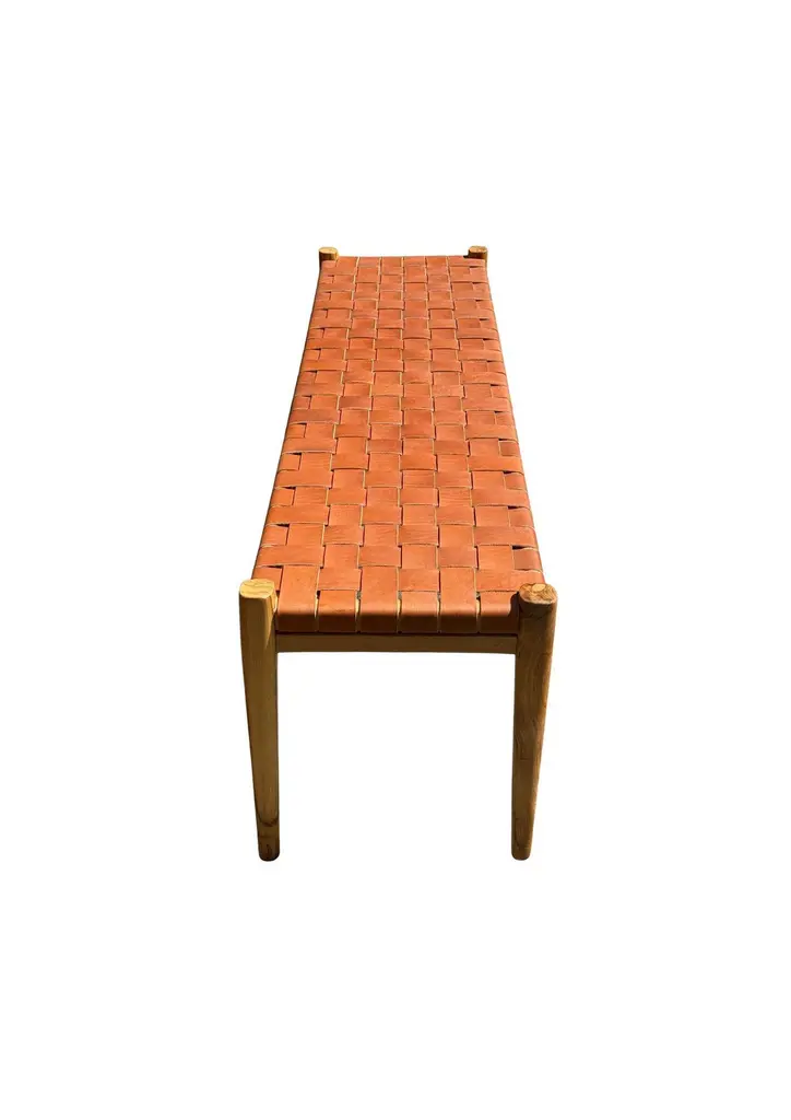 A hand-crafted teak framed & woven leather strap bench. These benches are crafted by local artisans using a wood joinery technique without the use of nails. They feature a subtle wood texture and are robust and sturdy.