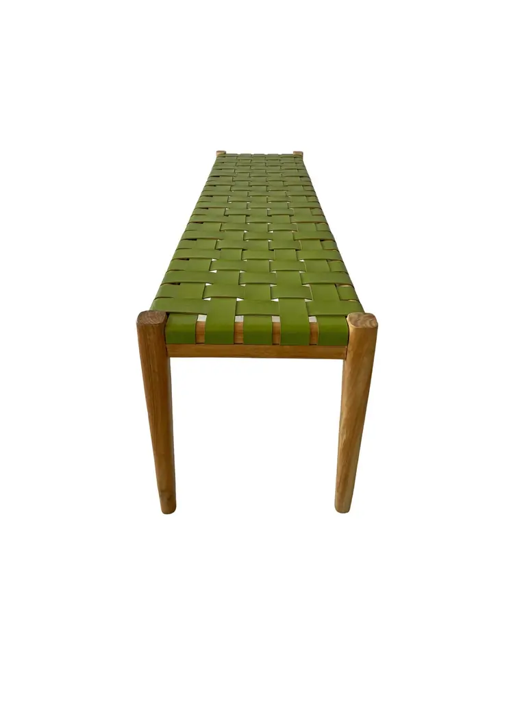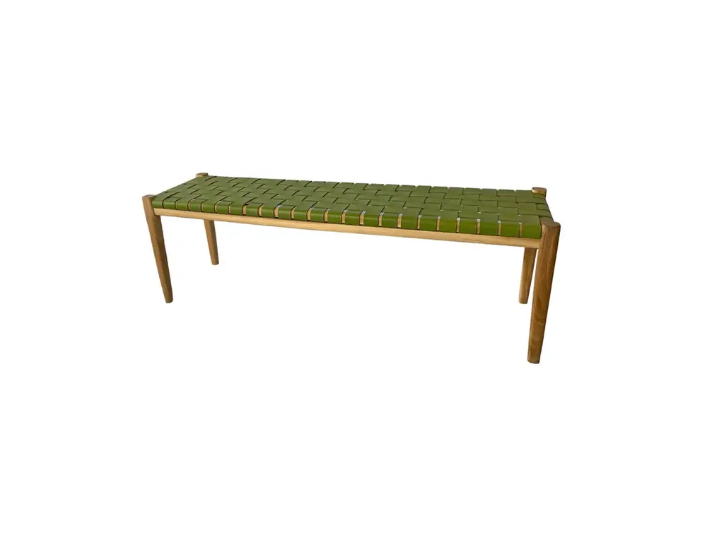 A hand-crafted teak framed & woven leather strap bench. These benches are crafted by local artisans using a wood joinery technique without the use of nails. They feature a subtle wood texture and are robust and sturdy.