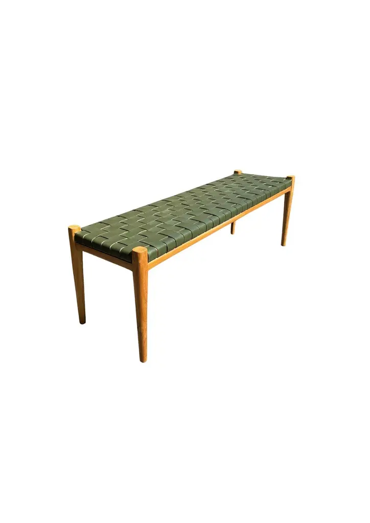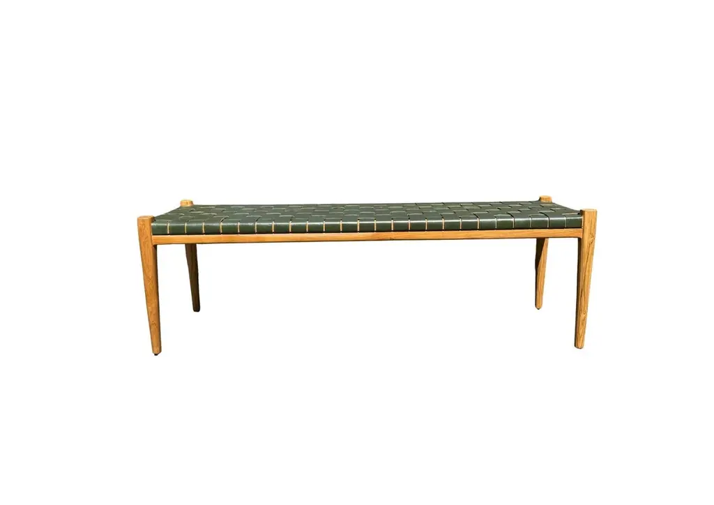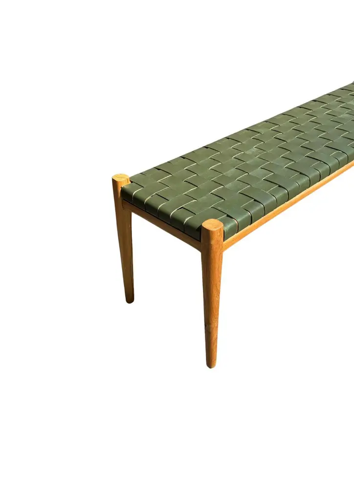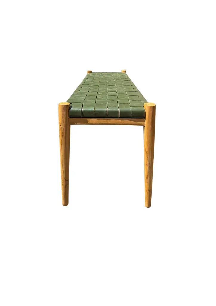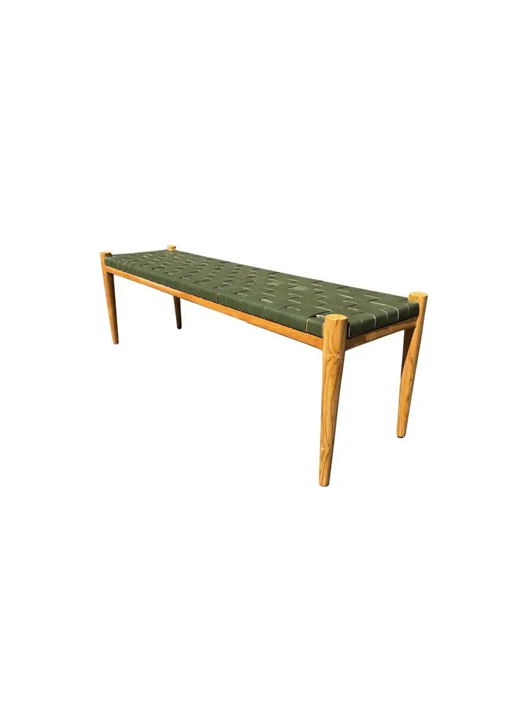A hand-crafted teak framed & woven leather strap bench. These benches are crafted by local artisans using a wood joinery technique without the use of nails. They feature a subtle wood texture and are robust and sturdy.